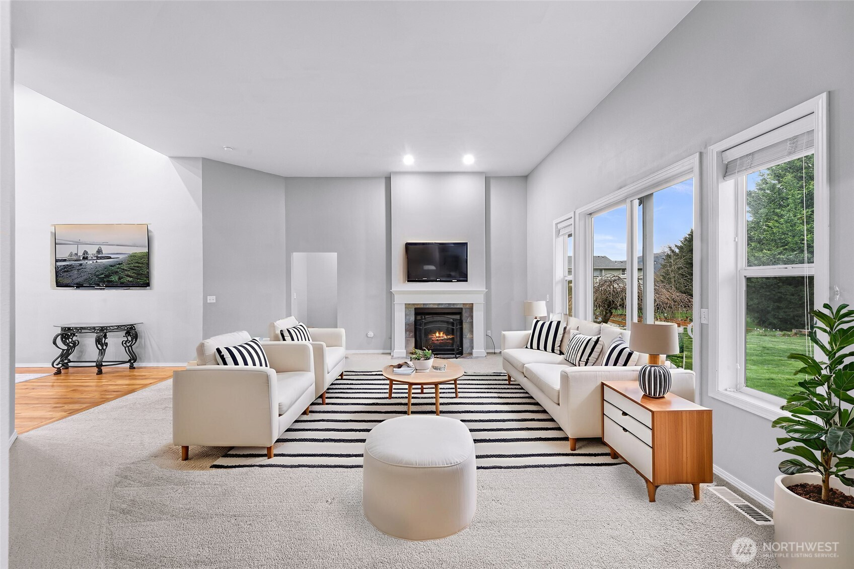 Welcome to this wonderful home tucked away on a quiet, dead-end street in the coveted Nookachamp Hills community with mountain views and an expansive, level .34-acre yard! Soaring vaulted ceilings and fresh interior paint welcome you into an open and thoughtfully updated floor plan. The spacious kitchen boasts quartz counters, center island, breakfast nook and flows seamlessly into the living & dining areas centered around a cozy, double-sided gas fireplace — perfect for everyday living and entertaining! Step through French doors to a covered patio ideal for al fresco dining & morning coffee while enjoying the peaceful yard. The serene primary suite is a true retreat with a gas fireplace, generous walk-in closet and luxurious ensuite with dual sinks & soaking tub, while two additional bedrooms with a Jack & Jill bath provide comfort and flexibility. Life here is a true “stay-cation” with trails, Otter Pond area and Big Lake just moments away — swim, practice catch-and-release fishing, boat, picnic, enjoy sunset paddles or explore miles of scenic trails right in your backyard! Big Lake offers community-wide access to watersports, fishing, golfing and wildlife viewing, making every day feel like a getaway. Skagit Valley’s farms, markets, breweries, dining & I-5 commuting are all just minutes away — country setting with town convenience! A wonderful home, a great neighborhood, and endless outdoor living await.