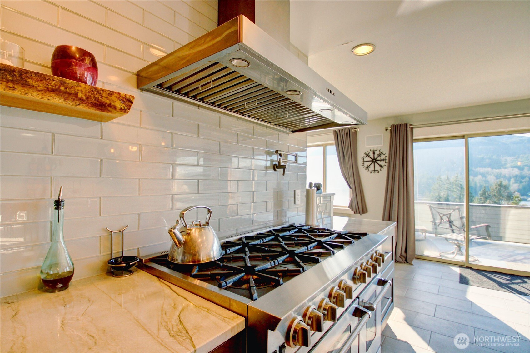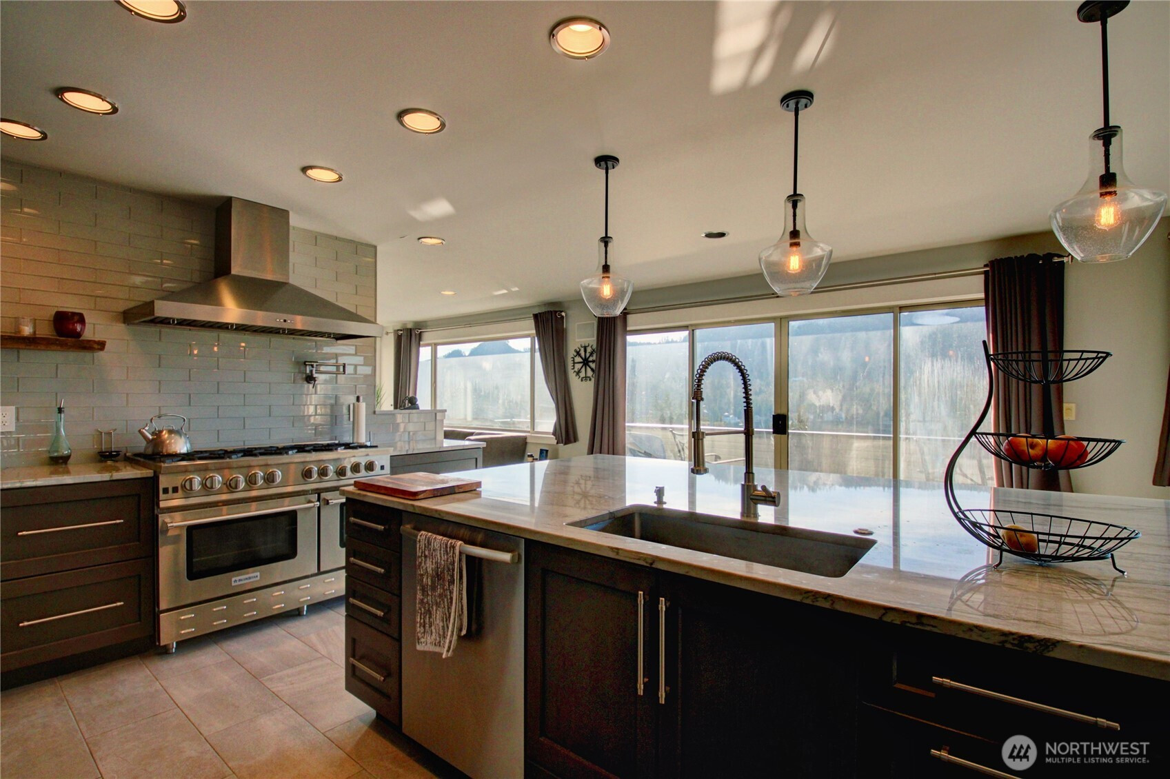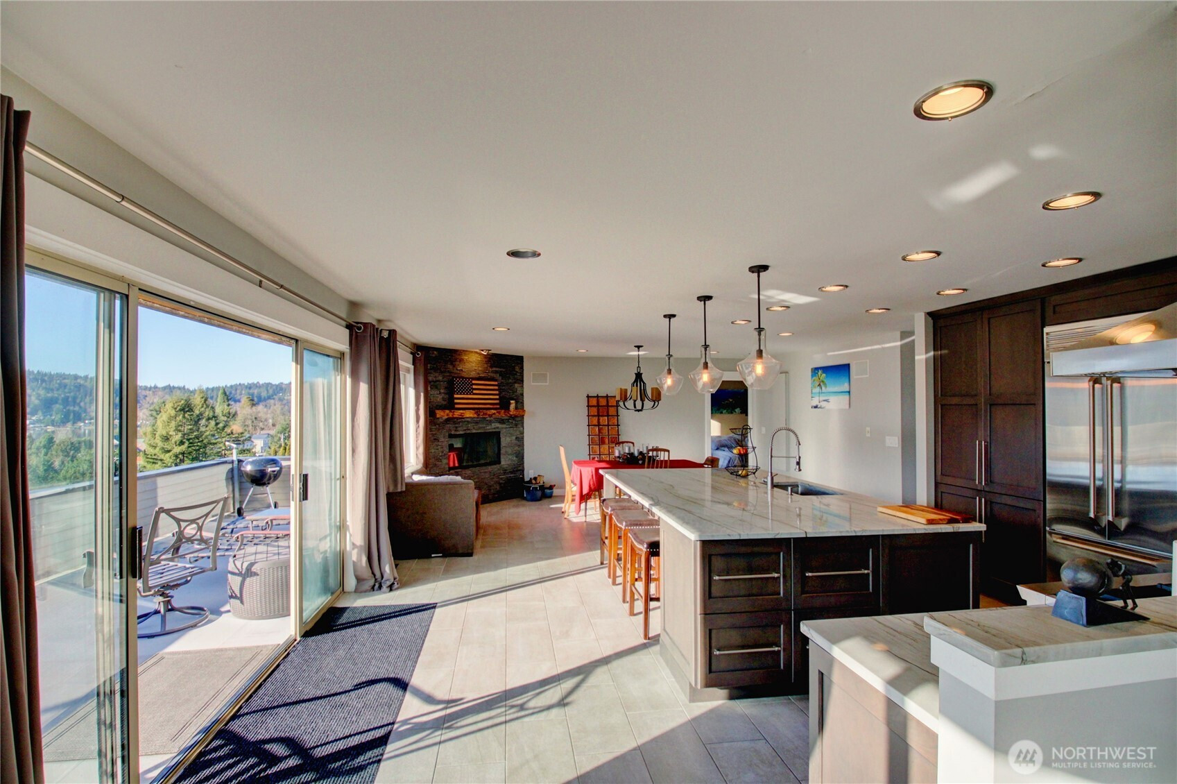 Panoramic Big Lake views take center stage in this expansive 4,000± sq ft view home designed for both everyday comfort and entertaining. The main level showcases a completely renovated chef’s kitchen featuring a built-in Monogram refrigerator, Bosch dishwasher, and a BlueStar RNB 48” eight-burner dual-oven range topped with a striking 48” range hood. New appliances, updated flooring, and a generous island anchor the space and flow effortlessly into the living room with a gas fireplace and the dining area warmed by a wood-burning fireplace. The primary suite offers its own fireplace and deck access, joined by a second ensuite bedroom—both opening to decks with sweeping, panoramic lake views. The lower level expands your living space with three additional bedrooms, new flooring throughout, and a versatile media/game room with a wet bar that opens directly to an outdoor patio, creating an ideal setup for entertaining indoors and out. Set on a generous .54-acre lot, the property also includes a small additional lot across the street. A 50-year roof and three-car garage add long-term value and convenience. Note: Beverage cooler is not currently operational. An exceptional opportunity to enjoy space, craftsmanship, and breathtaking Big Lake views in a thoughtfully updated home.