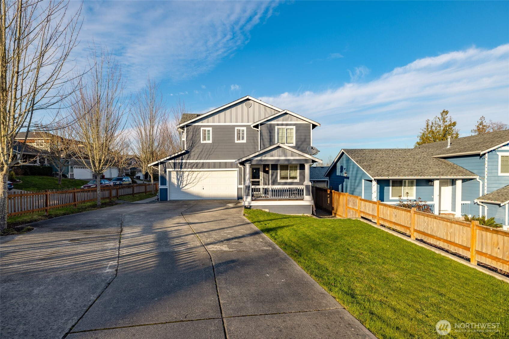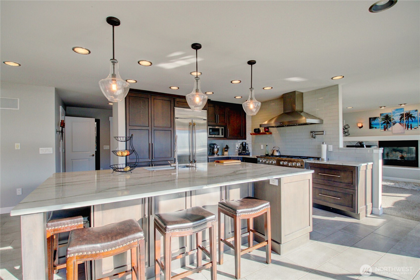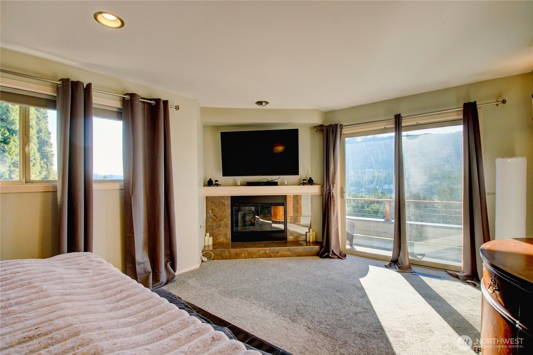 Panoramic Big Lake views take center stage in this expansive 4,000± sq ft view home designed for both everyday comfort and entertaining. The main level showcases a completely renovated chef’s kitchen featuring a built-in Monogram refrigerator, Bosch dishwasher, and a BlueStar RNB 48” eight-burner dual-oven range topped with a striking 48” range hood. New appliances, updated flooring, and a generous island anchor the space and flow effortlessly into the living room with a gas fireplace and the dining area warmed by a wood-burning fireplace. The primary suite offers its own fireplace and deck access, joined by a second ensuite bedroom—both opening to decks with sweeping, panoramic lake views. The lower level expands your living space with three additional bedrooms, new flooring throughout, and a versatile media/game room with a wet bar that opens directly to an outdoor patio, creating an ideal setup for entertaining indoors and out. Set on a generous .54-acre lot, the property also includes a small additional lot across the street. A 50-year roof and three-car garage add long-term value and convenience. Note: Beverage cooler is not currently operational. An exceptional opportunity to enjoy space, craftsmanship, and breathtaking Big Lake views in a thoughtfully updated home.