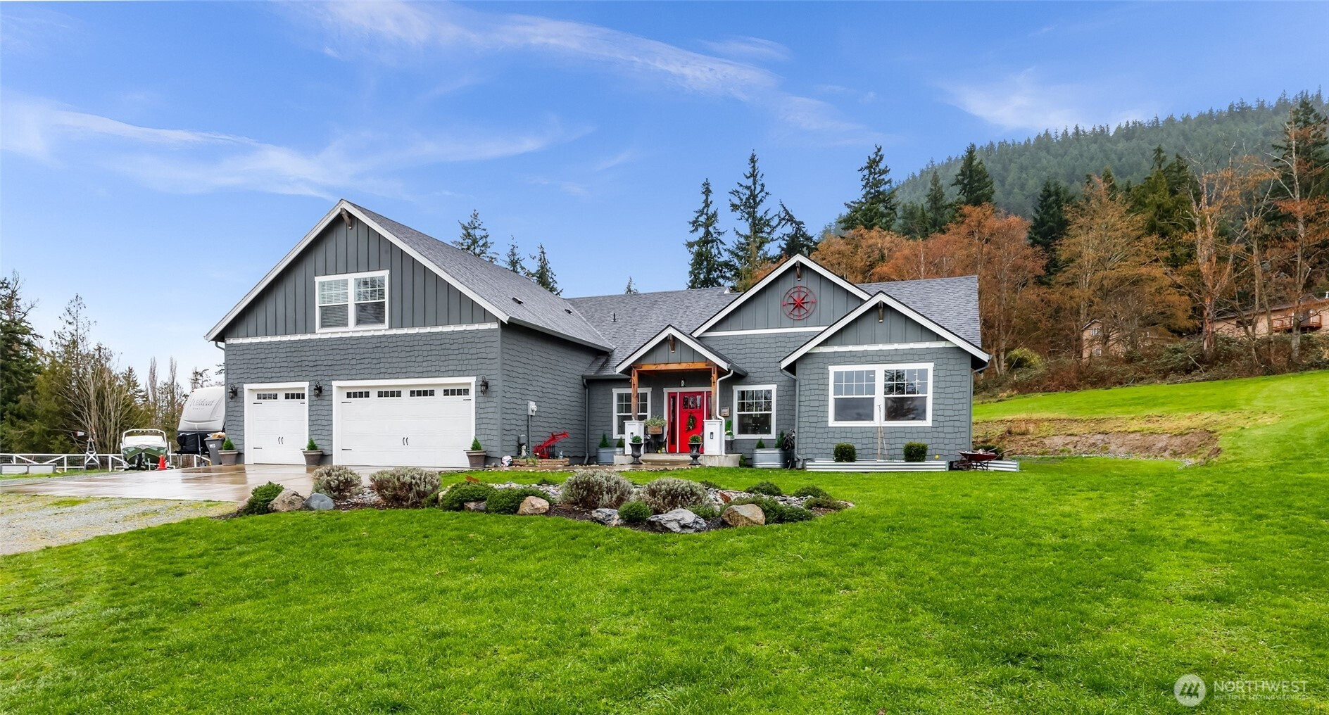 Price Improvement! Wake up to valley & mountain views, peaceful surroundings & room to breathe in this stunning 2019 custom rambler nestled on just over 5 acres minutes from town with no HOA! A bright & welcoming great room anchors the home w/vaulted ceilings, rich vinyl plank flooring & beautiful statement lighting. The open layout seamlessly connects the living, dining & kitchen areas, creating the perfect space for everyday living or entertaining. The kitchen is designed for gathering w/a large island w/bar seating, quartz countertops, gas range, double ovens & a generous walk-in pantry. French doors open to a private back patio, creating an effortless indoor-outdoor lifestyle. The thoughtfully designed floorplan includes a versatile den or office just off the kitchen w/its own ¾ bath, ideal for office, guests or multi-use living. The spacious primary suite features a private ¾ en-suite, while 2 additional bedrooms share a full bath w/double vanity. Above the 3-car garage, a large bonus room w/closet offers the flexibility of a 4th bedroom, office or media space. Laundry rm w/bonus shower for cleanup after outdoor projects, pets, or gardening. Outside, enjoy room to roam w/RV parking, garden shed, landscaped grounds & multiple areas to relax, play & take in the scenery. Fully fenced livestock enclosure & pasture space. Located on the west side of Little Mountain enjoy numerous hiking trails while being just 5 min to town & 2 min to I-5 for commuting.