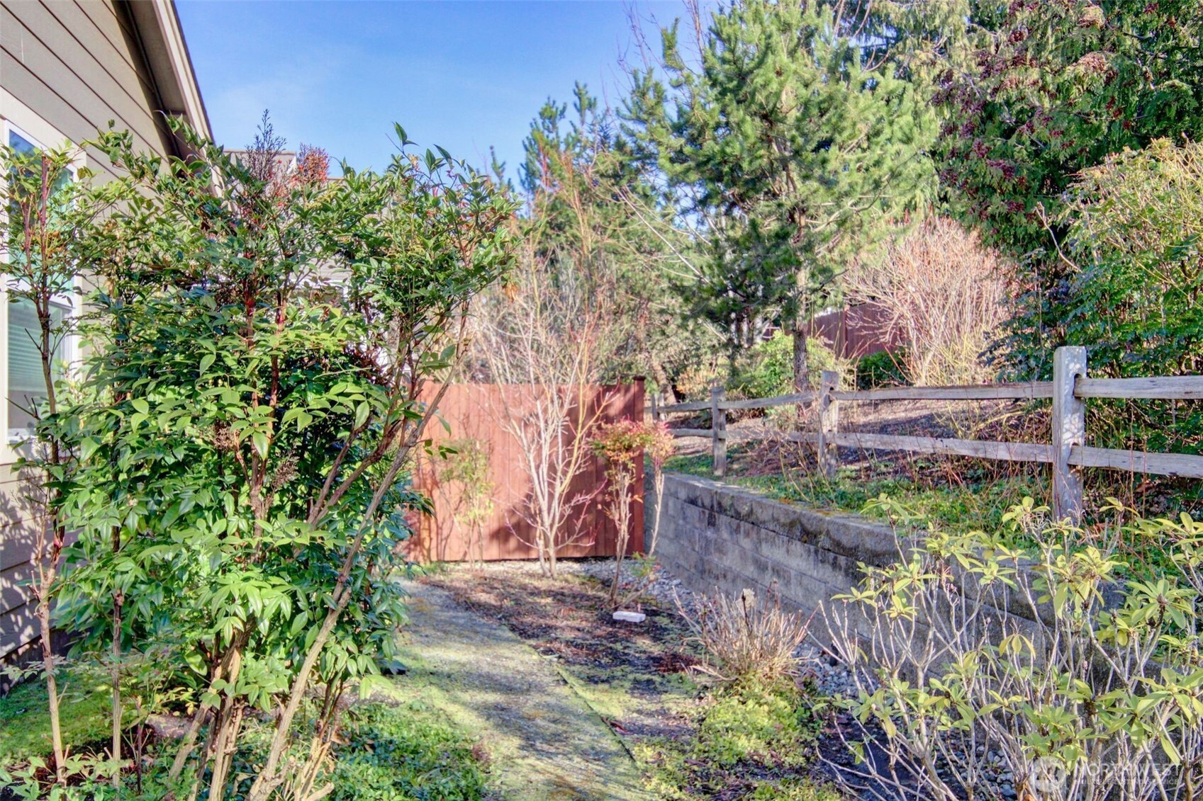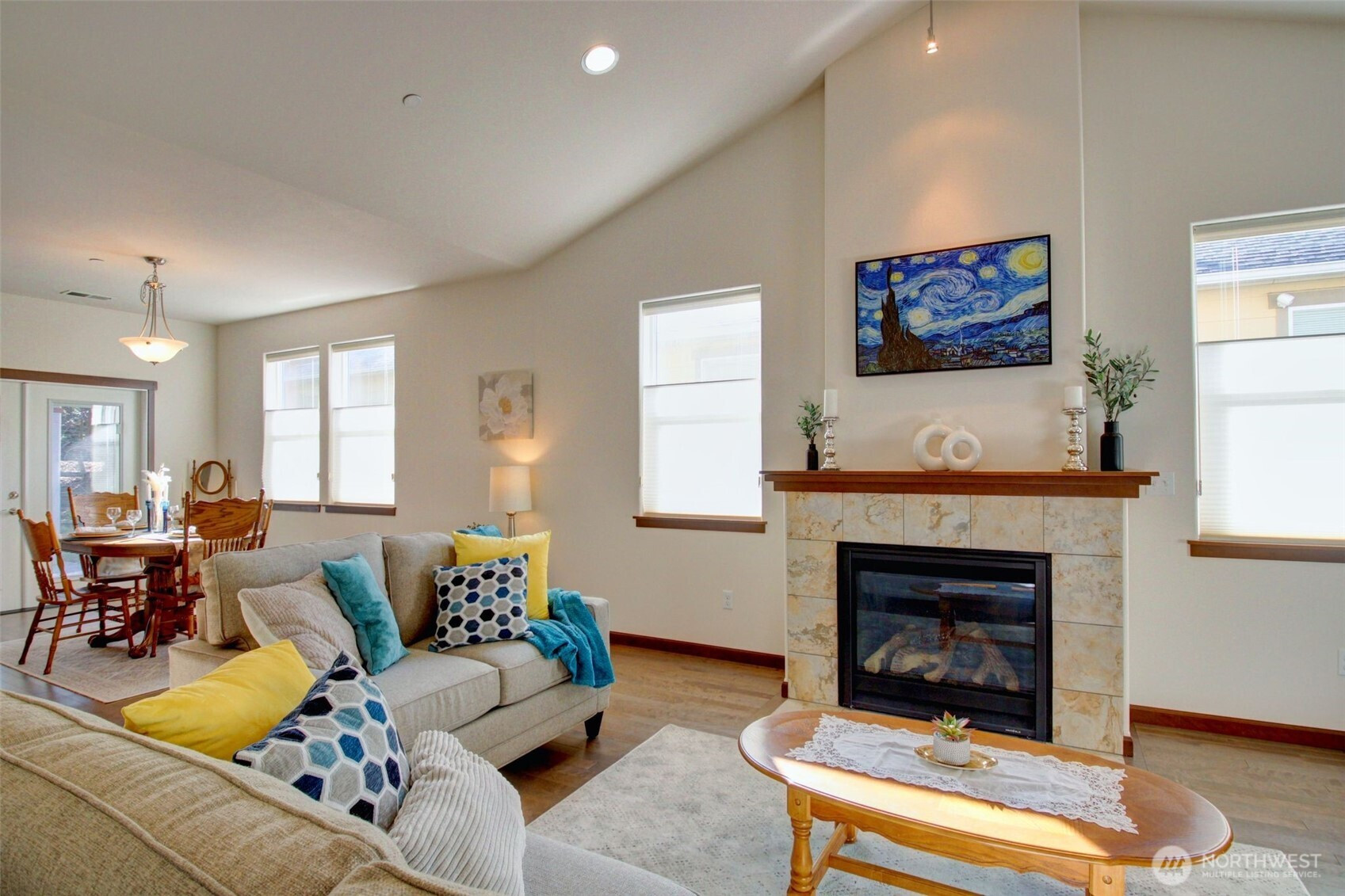 This charming 3-bed, 2-bath home offers a bright and comfortable layout, featuring a spacious living room with vaulted ceilings, hardwood flooring, and a cozy natural gas fireplace. The kitchen is beautifully finished with granite counters, a breakfast bar, and an adjoining dining area, while Bedroom 3 easily converts to a study or office for added flexibility. The large primary bedroom includes an attached bath, and a convenient utility room sits just off the finished two-car garage (440 sq. ft.). Enjoy the outdoors with a partially fenced yard, covered patio, and French doors leading outside. Located in the welcoming Big Fir South 55-and-better community, where yard maintenance is handled by the HOA, this home blends comfort, ease, and low-maintenance living.