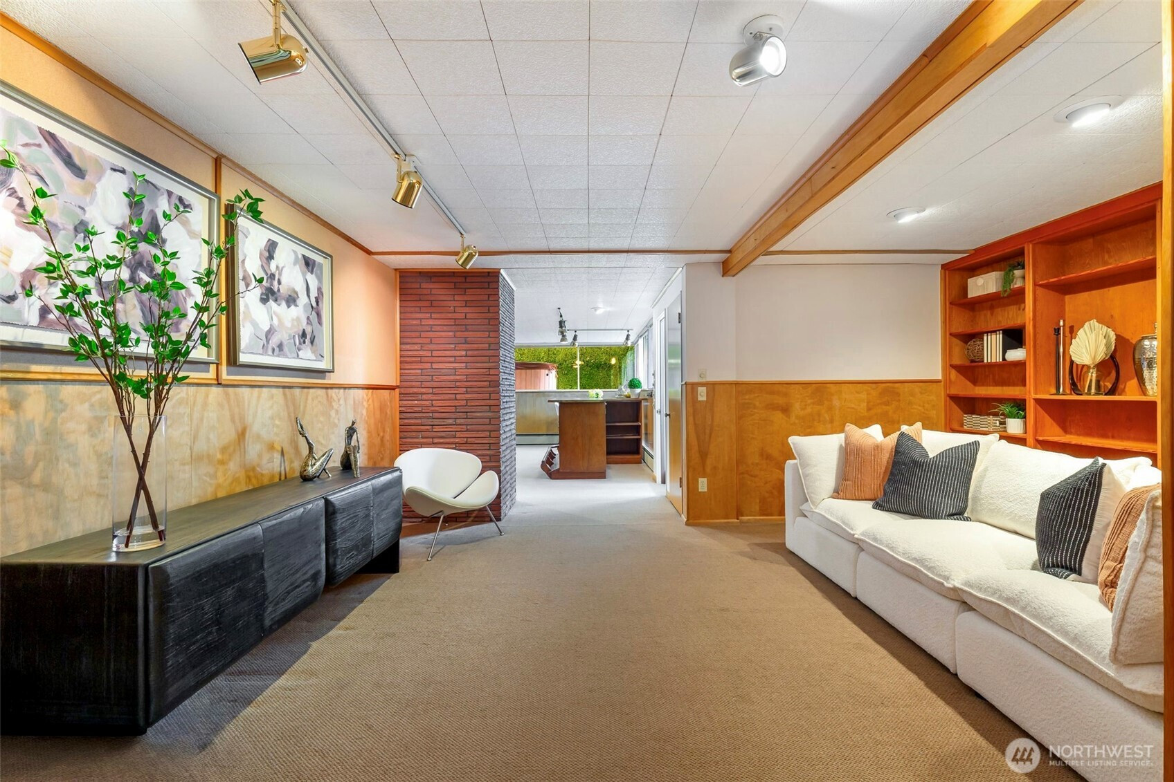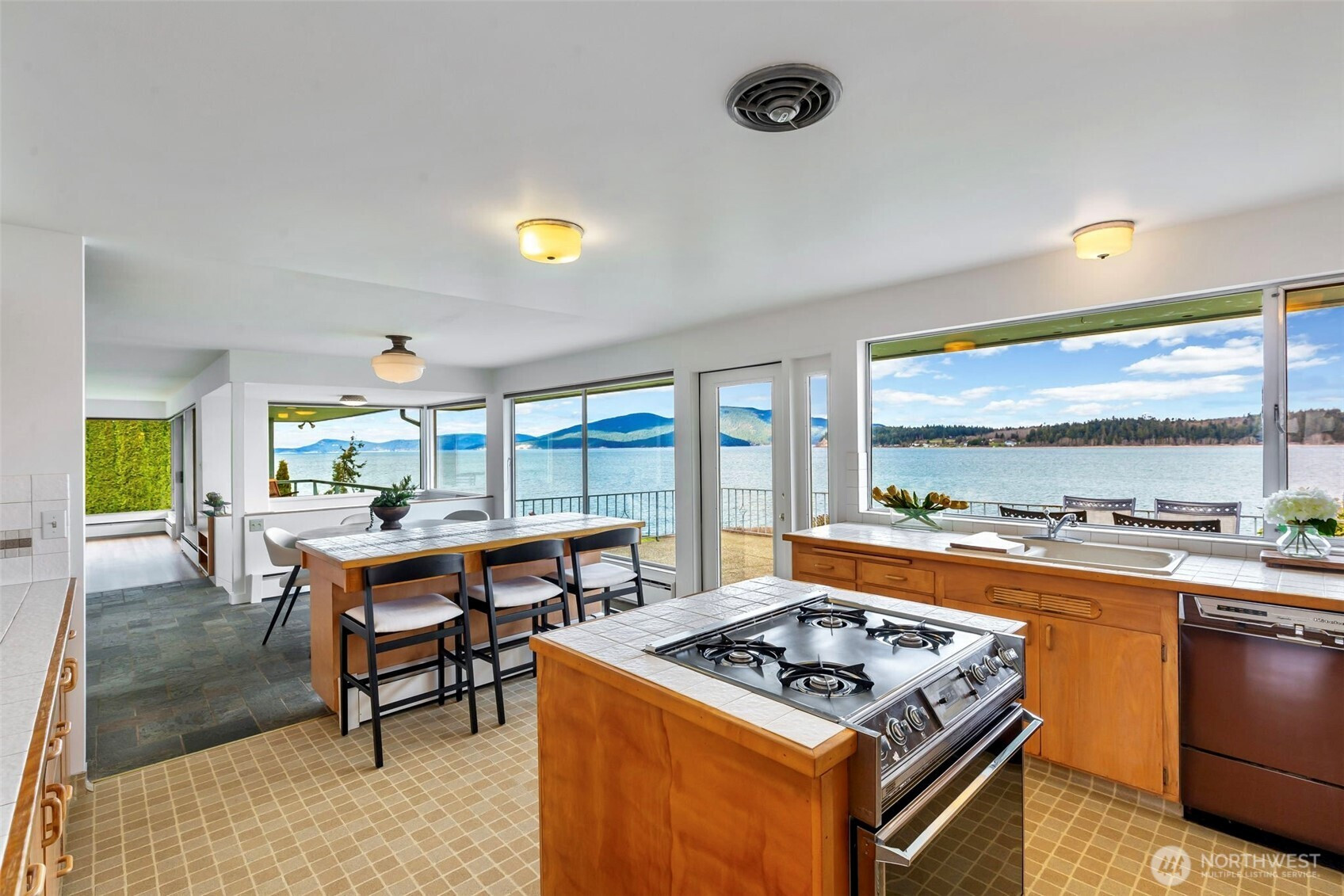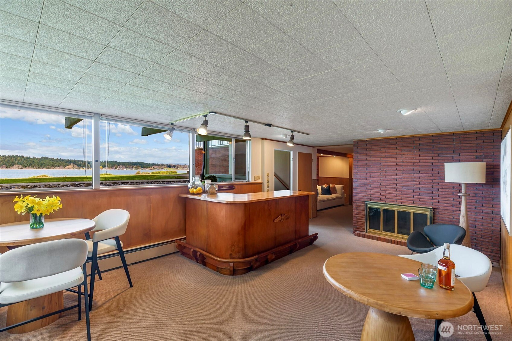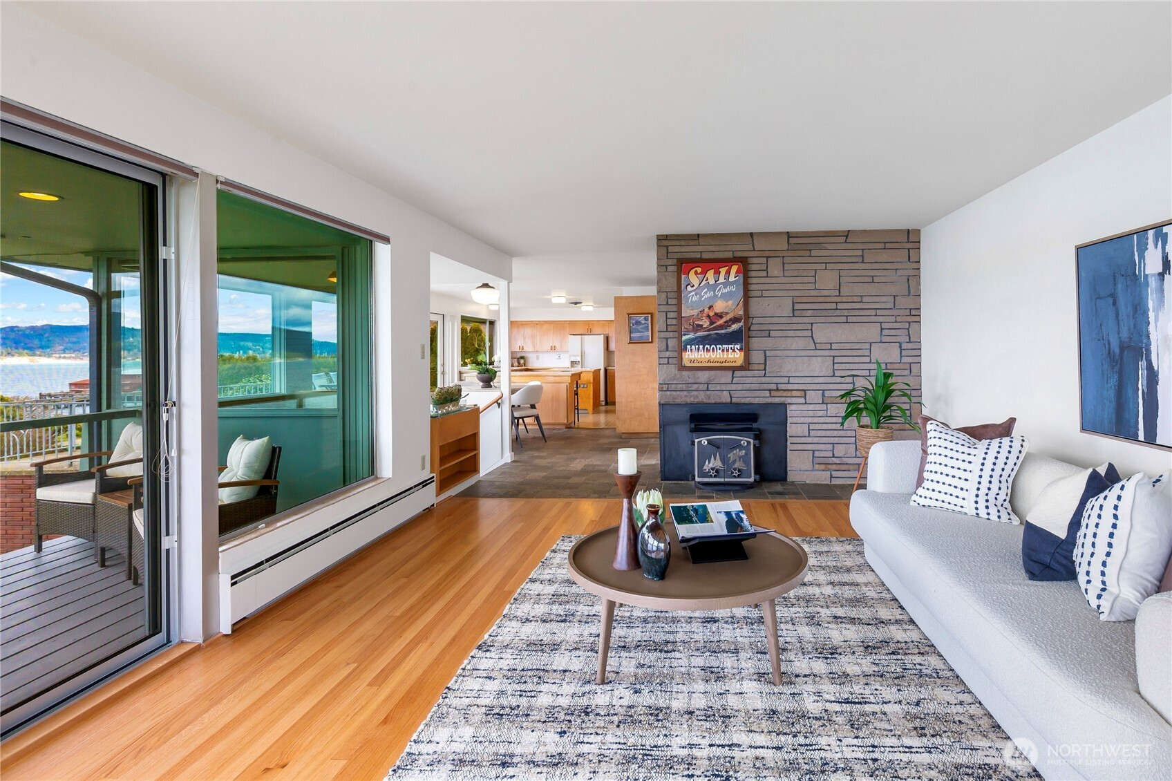 A rare Old Town Anacortes waterfront offering. This Custom Built 1957 mid-century modern home pairs true period character with the timeless allure of waterfront living. Positioned on an unusually large waterfront parcel, it captures sweeping 180-degree views of the Guemes Channel and San Juan Islands, bringing light, movement, and maritime beauty into everyday life. Inside is a rare blend of vintage design and modern livability. The main floor offers an expansive kitchen and dining area that opens to the view and flows out to a broad patio, ideal for effortless entertaining. A large stone fireplace anchors the formal living room, which opens to a covered deck where endless sunsets await. The primary bedroom with sliding doors to the patio; two additional bedrooms and a full bath complete this level. Downstairs, a spacious lounge features a substantial wooden bar beside a second fireplace and a versatile media room or library. A fourth bedroom, second bath, large hobby space and workshop complete the lower level. Additional storage for all of your coastal toys can be found in the oversized two-car garage. Outside offers a huge level backyard—an uncommon luxury on waterfront property—with multiple destinations: covered deck, kitchen-side patio, fire pit, secluded hot tub, and waterside deck. And just around the corner, Old Town Anacortes beckons with its shops, cafes, restaurants and marina.