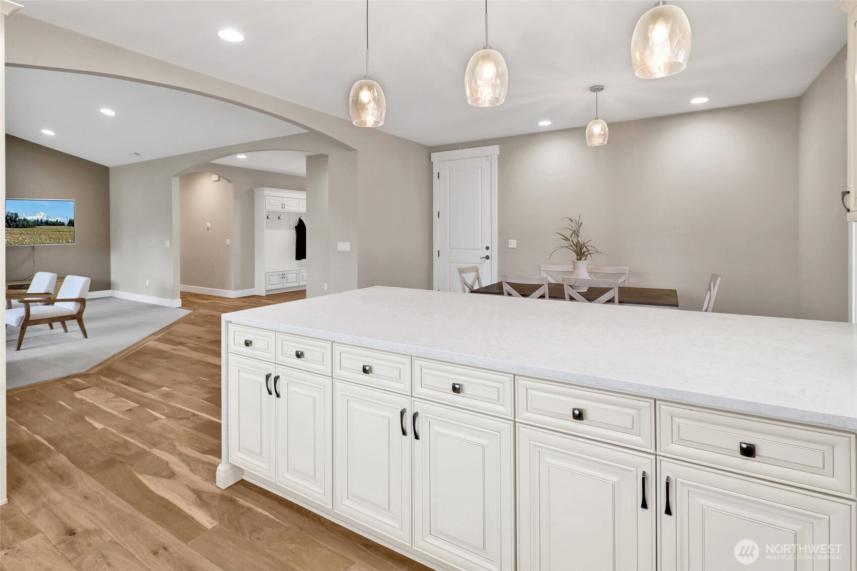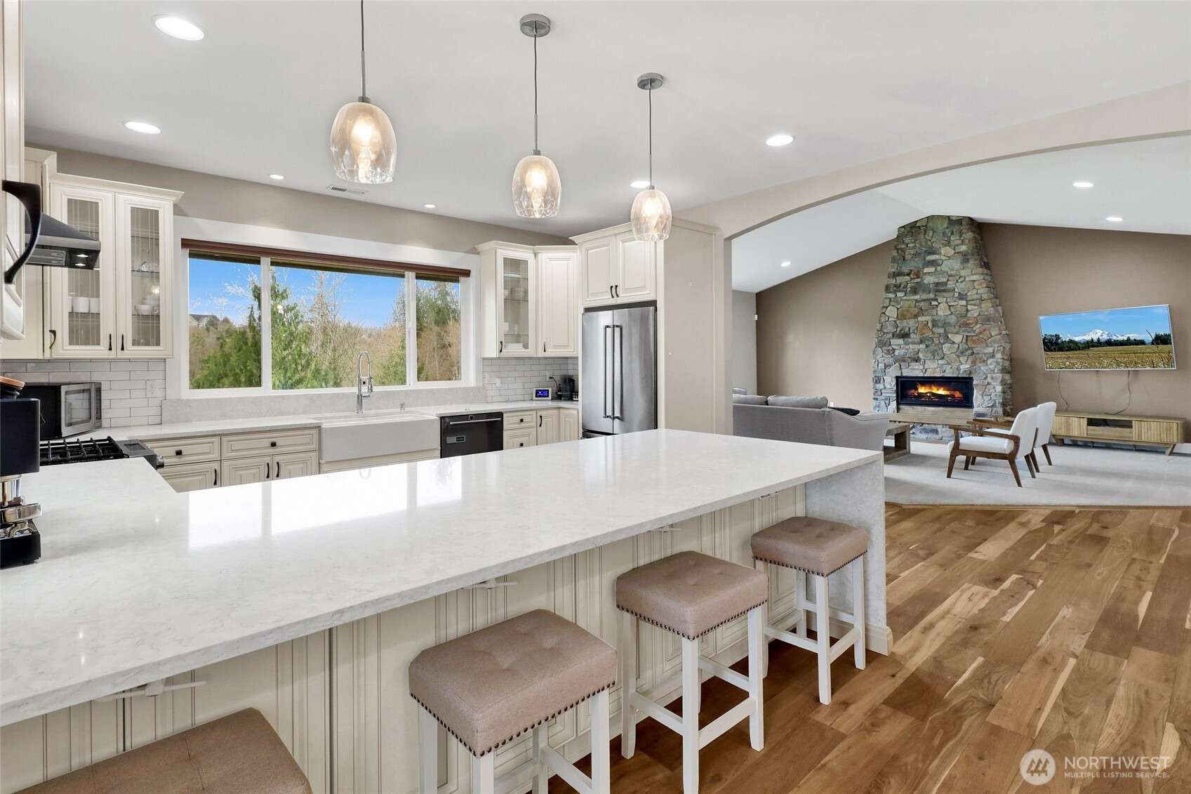 Elevated living awaits in this exceptional custom residence nestled within the coveted Nookachamp Hills community. Perfectly sited on a beautifully sized half-acre lot, this nearly 5,000 sq ft home offers refined comfort, generous scale, and timeless design throughout. Featuring 4+ bedrooms and 2.75 baths, the layout is both functional and impressive. At the heart of the home, a designer chef’s kitchen showcases sleek waterfall quartz countertops, premium finishes, and an effortless connection to the expansive great room, anchored by a dramatic stone fireplace. The main-level primary suite is a true retreat, complete with a spa-inspired ensuite and soaking tub designed for relaxation. The lower level is an entertainer’s dream, offering a sprawling living space with wet bar—ideal for hosting, recreation, or multi-generational living. Dual A/C systems ensure year-round comfort across all levels. Enjoy serene mountain views from the front of the home, with nearby access to scenic walking paths around Otter Pond. Just minutes to the charm, dining, and amenities of downtown Mount Vernon, this residence offers a rare blend of privacy, luxury, and convenience in one of the area’s most sought-after neighborhoods.