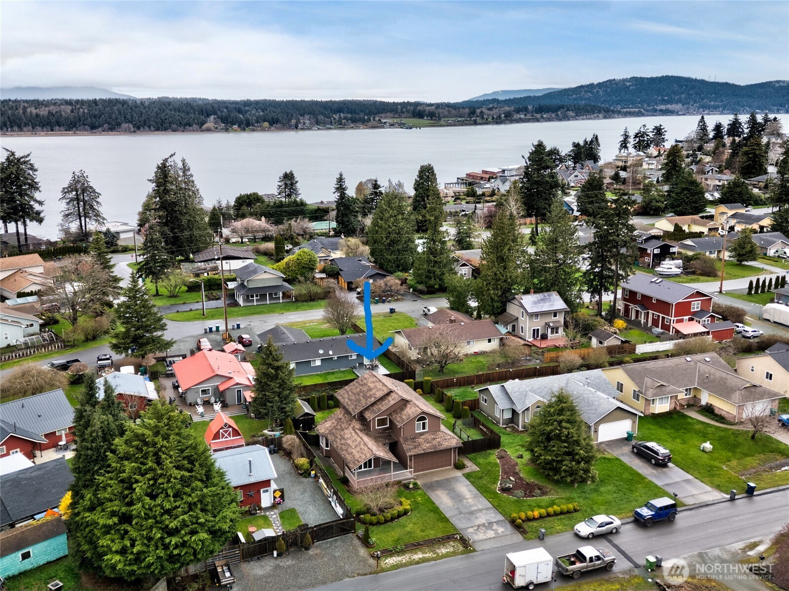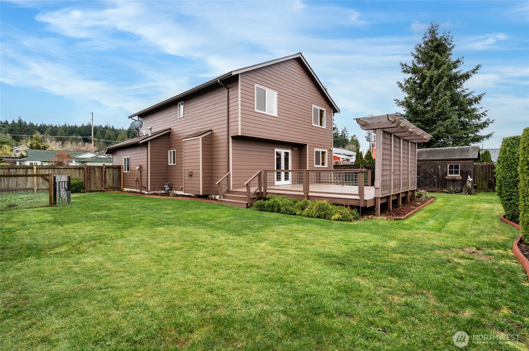 Ready for new memories to be made? This 3 bdrm, 2.5 bath home w/ 1832 sq ft has fresh exterior paint (January 2026), newer roof 7 years ago, new water heater. The FP & furnace serviced. Vaulted ceiling in living room w/distressed engineered hardwood floors, access to large covered front deck w/cedar lined ceiling. Family room w/hard wood floors, gas fireplace & open to kitchen. Kitchen w/eating bar, & double oven. Step outside to expansive back deck just waiting for those lazy days of Summer. Primary bdrm up w/new carpeting, walk in closet & primary bath. 2 addtl bedrooms upstairs w/peek a boo water view. Enchanting, fenced backyard w/whimsical storage building & fenced garden area. Truly warm & inviting this home is ready for new owners.