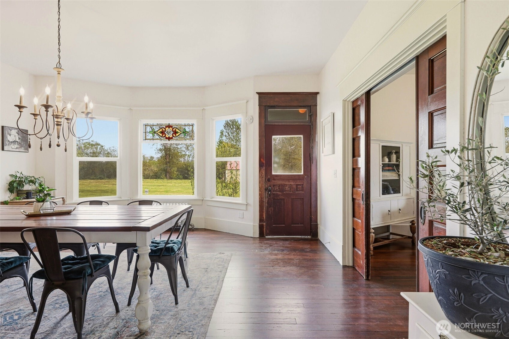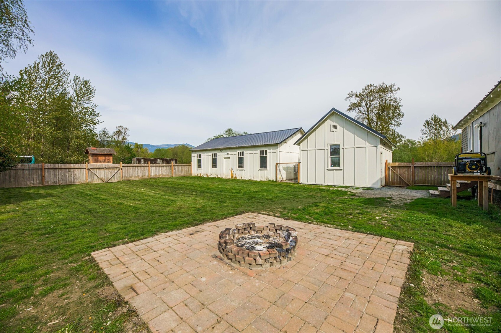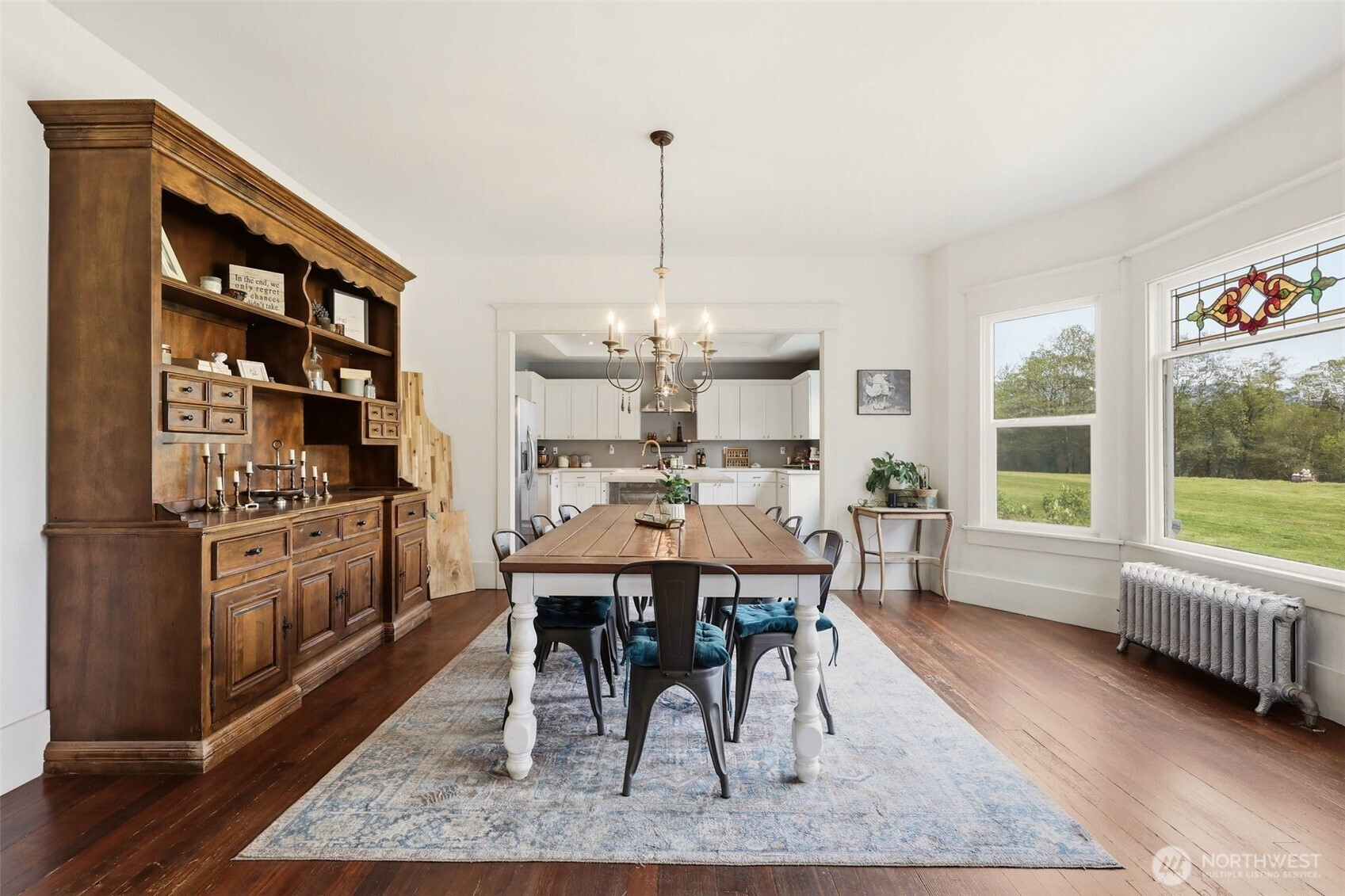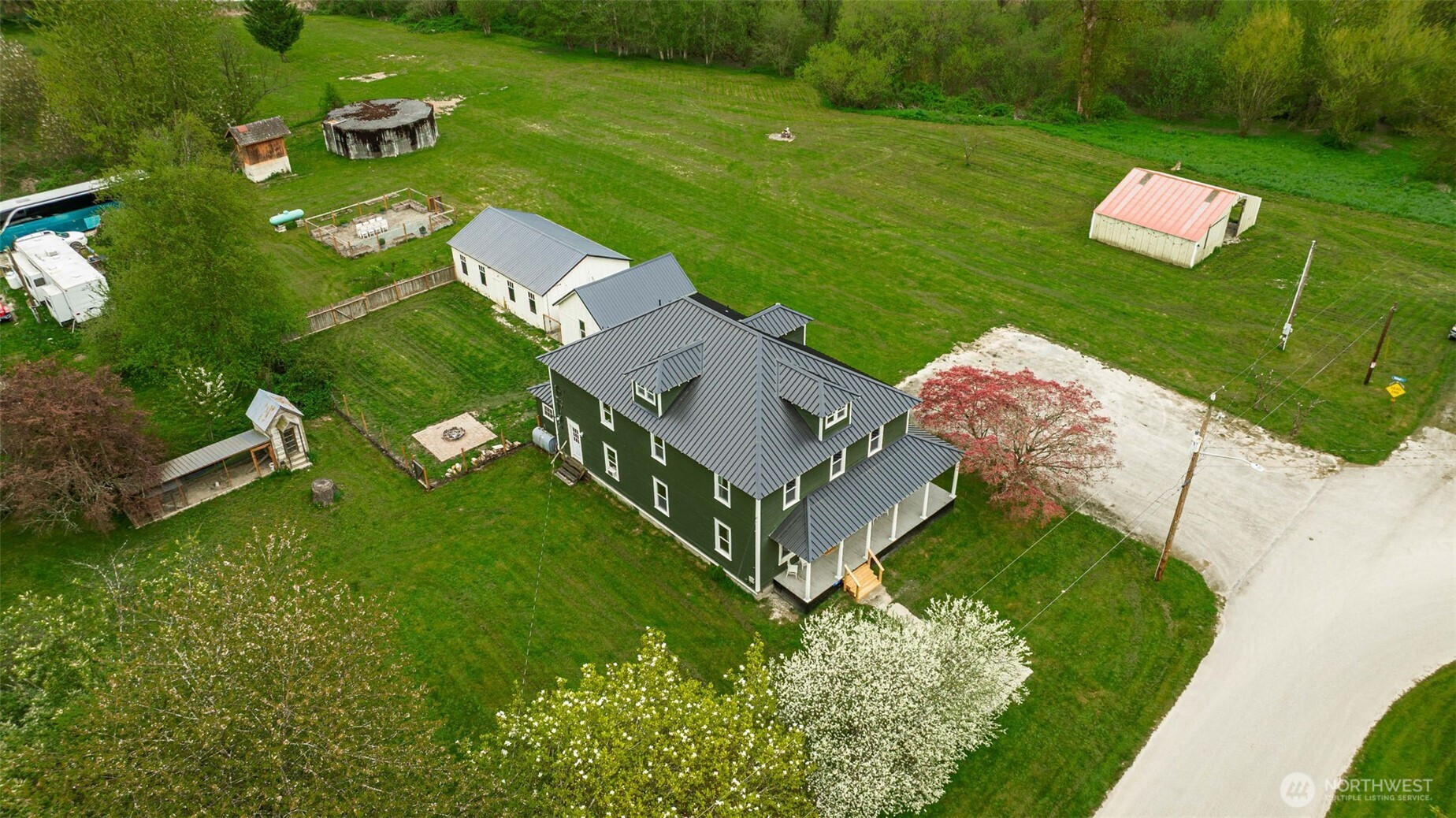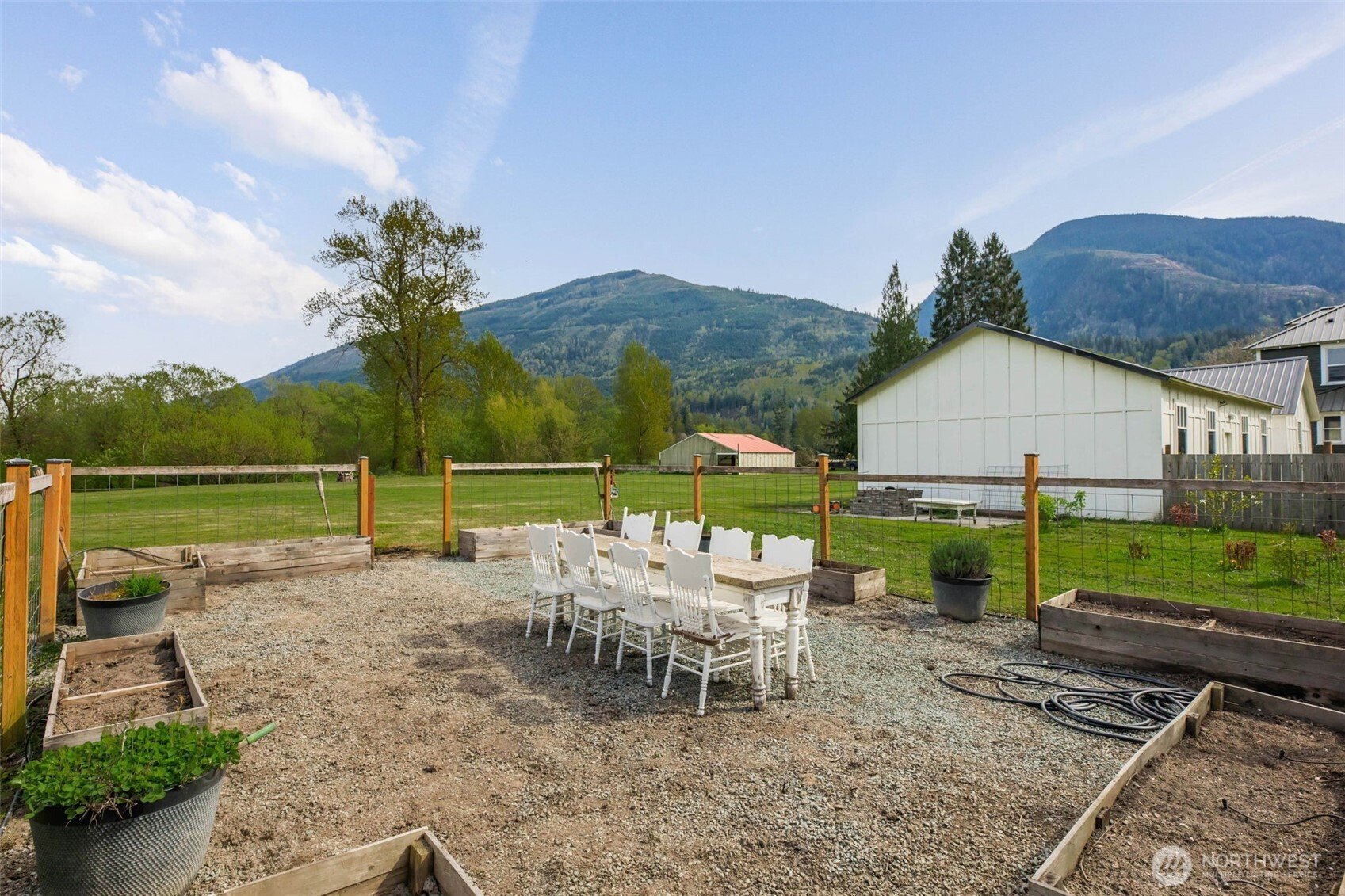 Timeless charm meets country living on 4.2 beautiful acres in the heart of Hamilton. Built in 1908, this stunning 4,323 sq ft farmhouse blends historic character with thoughtful updates and breathtaking 360° mountain and territorial views. Inside you’ll find original fir wood floors, pocket doors leading into the living room, and gorgeous stained glass windows that highlight the home’s rich history. The spacious kitchen features white quartz countertops, white shaker cabinets, a large apron sink, an oversized stove, a barnwood wrapped island, and an original butler’s pantry. Fresh interior and exterior paint and a durable black metal roof add modern appeal while preserving the home’s timeless feel. With 6 bedrooms, two are primary suites—including a main suite with an impressive walk-in closet, an office, and a finished attic space, —there is room for everyone to spread out. Outside, enjoy a classic wraparound porch, an established vegetable garden you can dine in on warm summer nights, a chicken coop, partial fencing, and a barn. The property includes three parcels totaling 4.2 acres with two shops (16x24 detached garage and 24x48 shop), offering endless possibilities for hobbyists, agriculture, or recreation. An unused shared city easement between parcels enhances the sense of privacy and open space. Located near the scenic Skagit River, this property has never experienced water getting inside the home—offering peace of mind along with unmatched beauty.