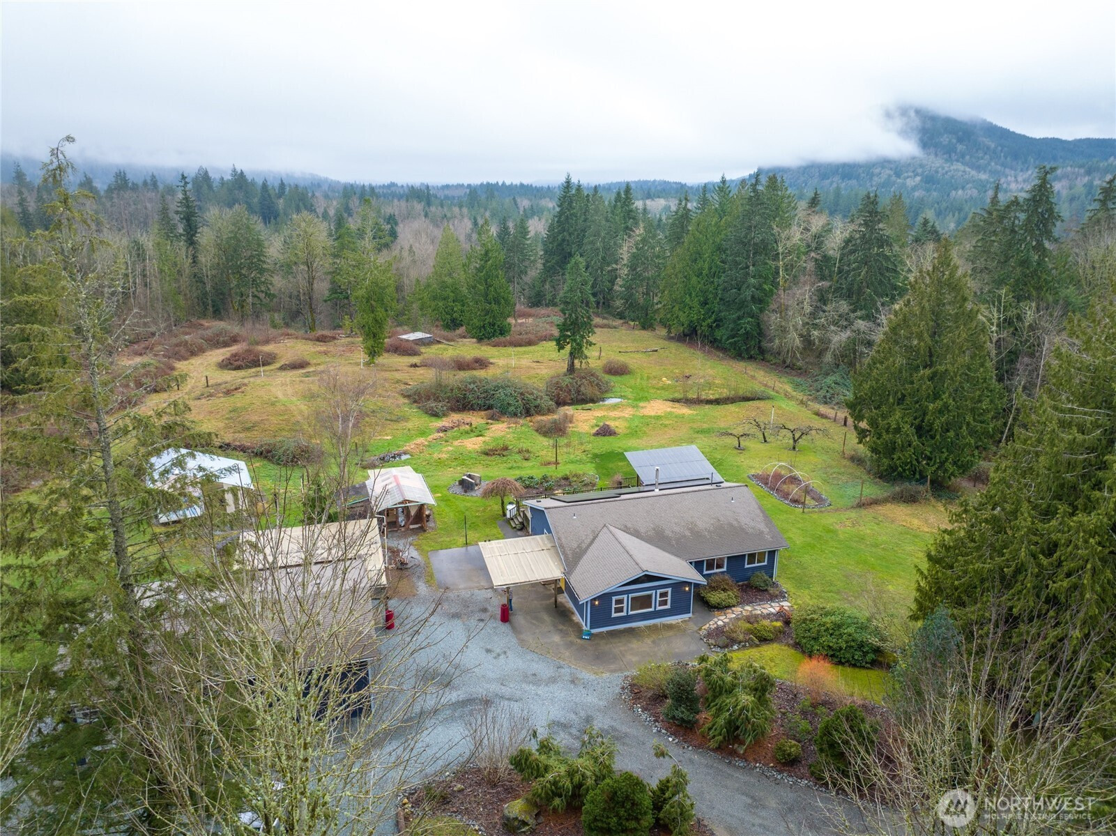 Looking for a farm near Bellingham set up for horses, cows, chickens, sheep with a one story home, a shop and a swanky detached ADU? Look no further. This recently remodeled home has it all. Even a hot tub in the front deck looking out over the pastures, solar panels & in-floor radiant heat. Vaulted ceilings make this open concept home feel even more spacious. 3 bedrooms and 2 full bathrooms inside the house with a large bonus room, dining/kitchen/living all have access onto deck with unending southern exposure. 1188SF shop sits just adjacent from the home which has plenty of space for a workshop plus a beautiful 582 SF ADU w/ 3/4 & 1/2 bath, laundry, kitchen & bedroom. House perched on high ground with southern views and complete privacy. 5 acres, fruit trees & gardens. SF includes both house 1908 and ADU 582 to total 2490.