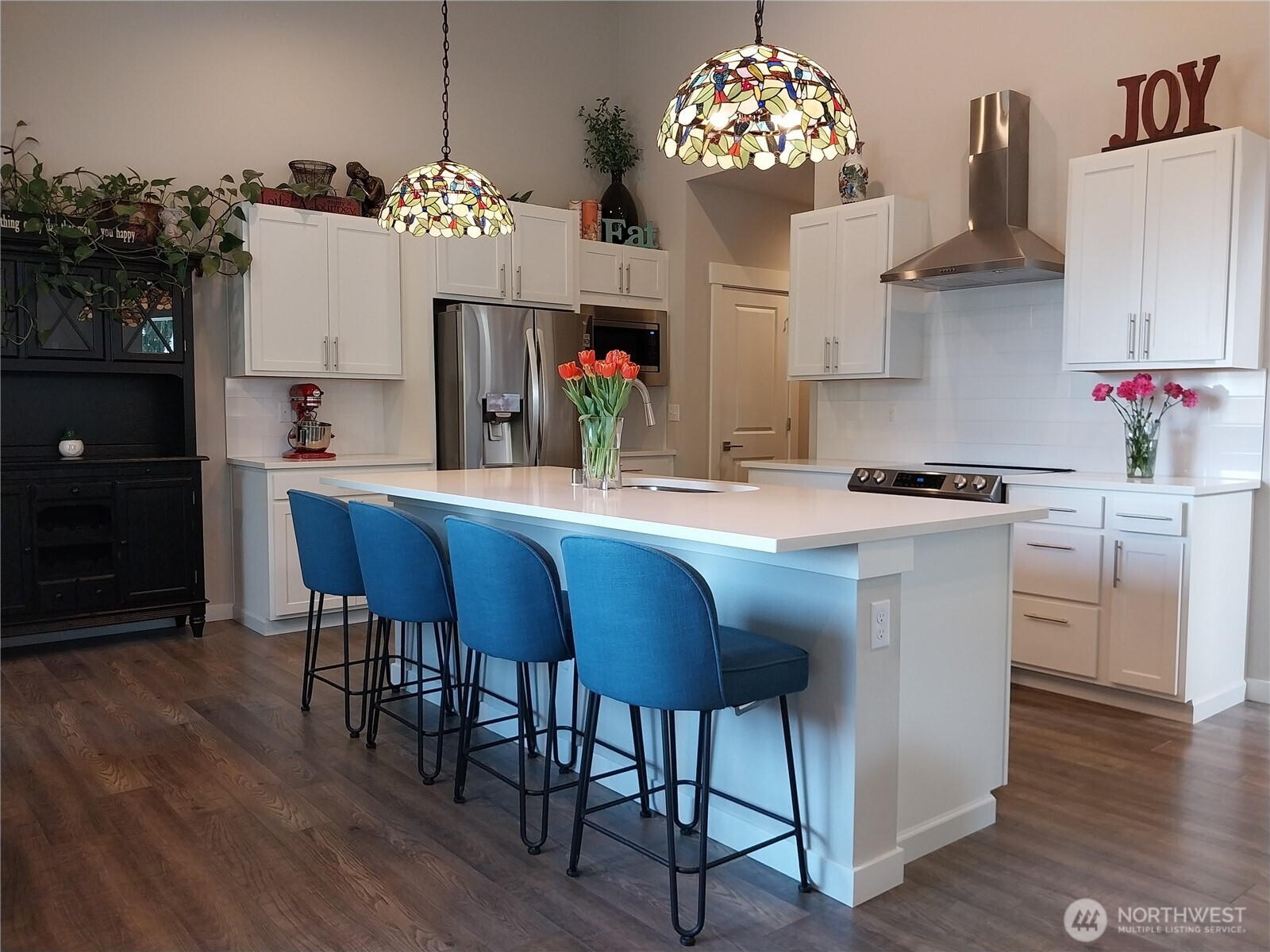 Fantastic floor plan & great location w/ a view! Like new, built 2021,main floor features primary bedroom and 2nd large bedroom w/ adj bath w/ shower. Primary bedroom has vaulted ceilings & luxurious 5-piece bath w/ quartz counters & walk-in closet. French door entry to bright home office. Soaring ceilings in spacious great room, kitchen, & dining area. Huge kitchen w/ large island, quartz counters, & walk-in pantry. Open great room w/ cozy fireplace & windows toward mountain view. Upstairs features versatile bonus room, 2 bedrooms & full bath. High-end laminate flooring in entry, great room, kitchen, hallway, & dining area. Enjoy mountain view from covered rear deck. Fully fenced backyard adjacent to green belt.