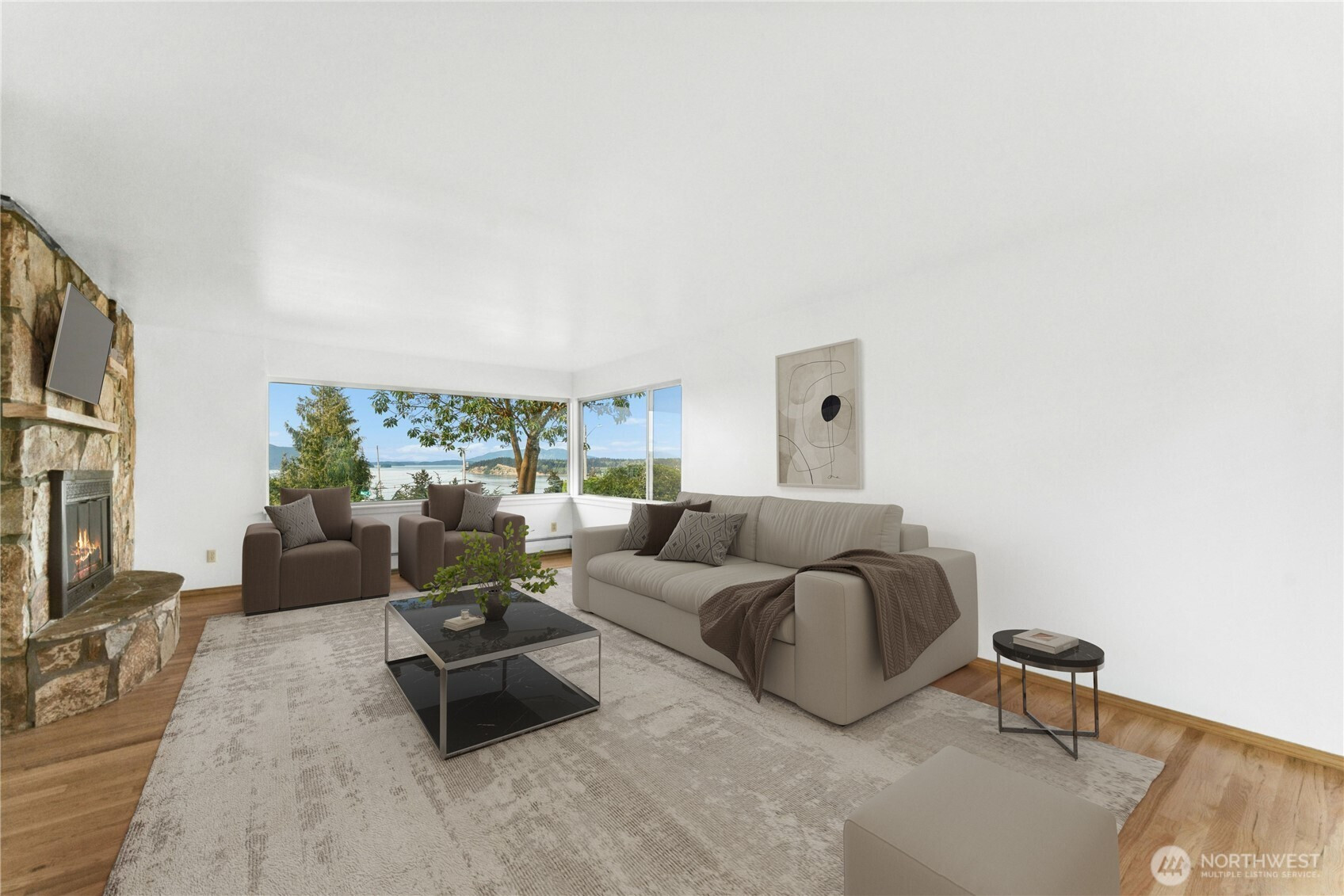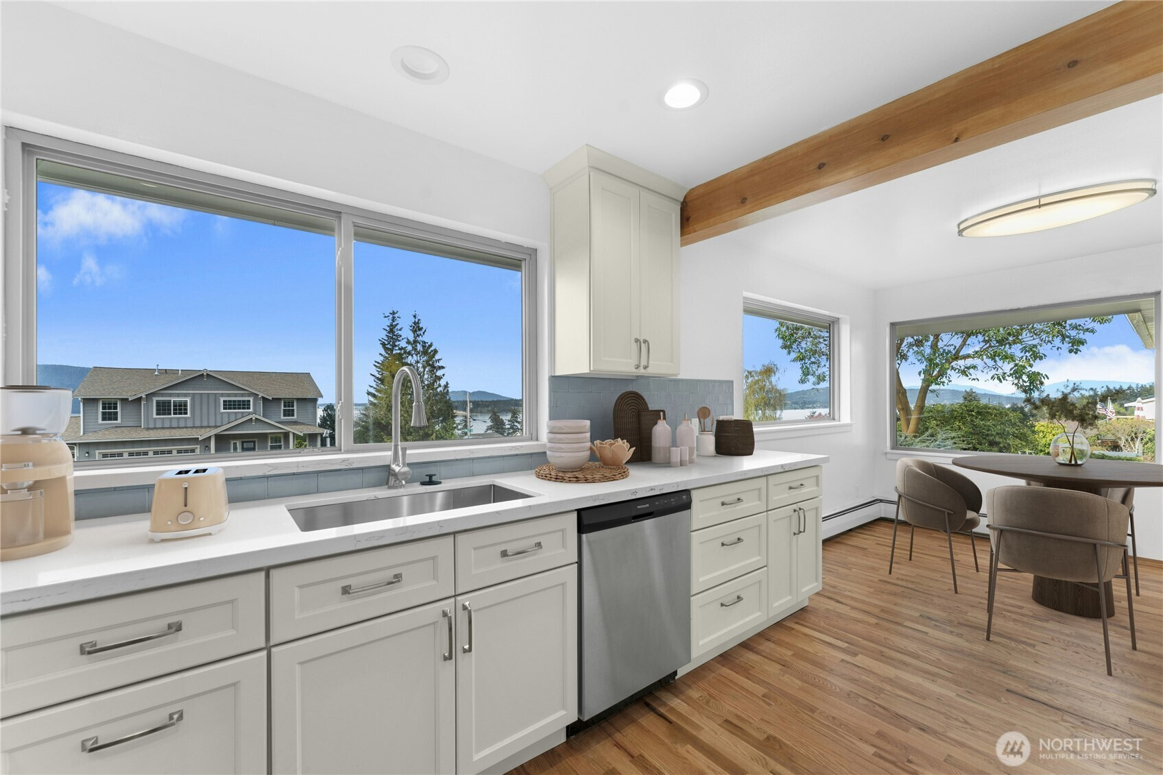 Perched to take in sweeping views of the Salish Sea with iconic Mount Baker as your backdrop, this beautifully updated home embodies the very best of Pacific Northwest living. From glowing sunrises to ever-changing skies, every window captures a scene worth savoring.Thoughtfully remodeled throughout, the home is truly move-in ready with refinished hardwood floors, a new roof, and all-new appliances. The upper level is designed with both comfort and entertaining in mind, featuring a light-filled, open-concept living space that seamlessly connects indoors and out. Step onto the back deck to enjoy morning coffee or host evening gatherings surrounded by stunning natural beauty.The kitchen shines with abundant cabinetry, a pantry tucked behind a stylish barn door & striking quartz countertops—perfect for both everyday living & hosting. Downstairs, a brand-new permitted ADU offers incredible versatility. Whether used for guests, multi-generational living, or as an income-producing rental, this private space creates both opportunity and convenience. Outside, the spacious, FLAT yard is ready for summer—ideal for gardening, play & relaxing. Lots of room to park your boat/toys with alley access. Located just minutes from town, marinas, endless outdoor recreation. Walk to Cranberry Lake from here and enjoy all of the neabry trails, beaches & lakes! Whether you're searching for a primary residence, vacation retreat, or investment, this is a prime opportunity to own a view property!