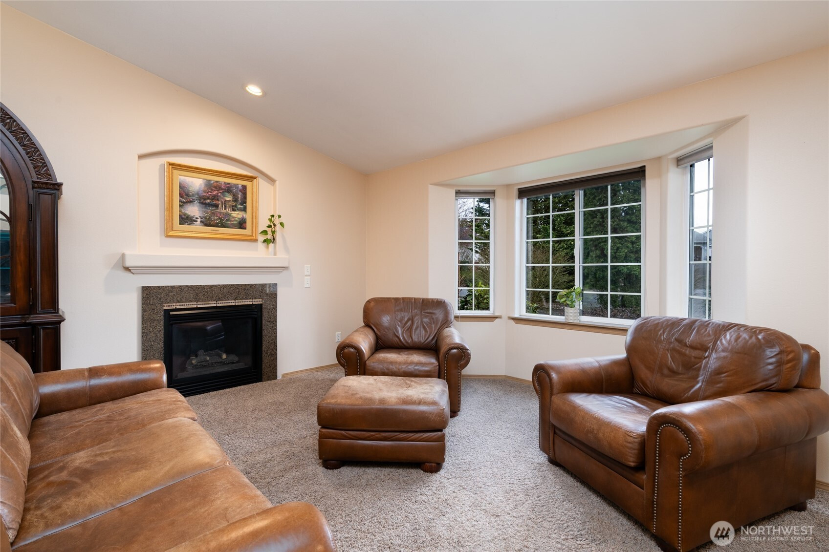 Enjoy easy one-level living in this great rambler home tucked away on a quiet cul-de-sac in Mount Vernon! Situated on a spacious .32-acre lot, this 3-bedroom, 2-bath home features 1,254 sq ft of comfortable living. The open living room showcases vaulted ceilings and a cozy gas fireplace that opens to the kitchen and dining space. Travertine tile flooring adds style and durability throughout the kitchen, bathrooms, and hallway. The primary suite includes a full bath and a large walk-in closet. Door off the kitchen opens to a large deck that is perfect for entertaining or relaxing. Enjoy the fully fenced backyard with apple trees, space for raised garden beds, and room for extra vehicles or parking. New roof in 2024 for added peace of mind. Conveniently located near Haggen, schools, and other local amenities. Complete with a 2-car garage - this home is move-in ready!