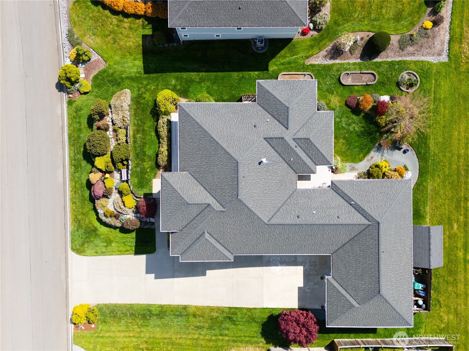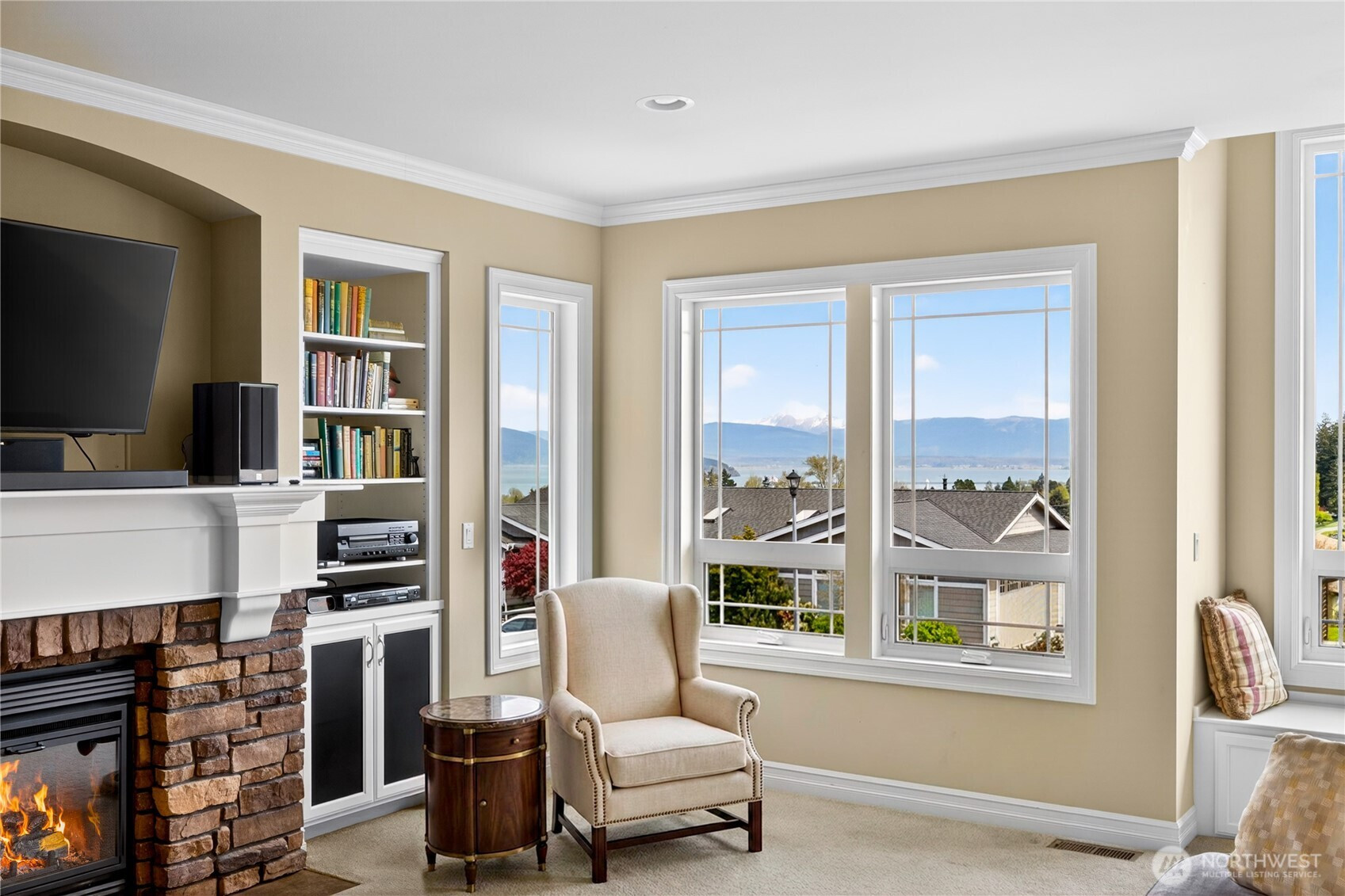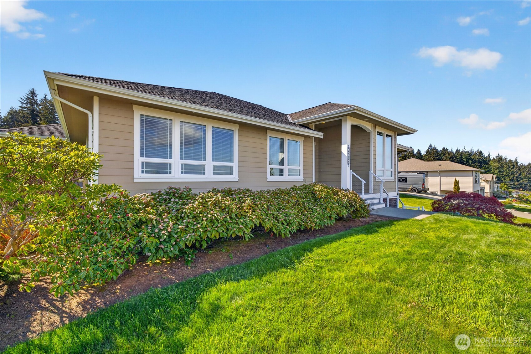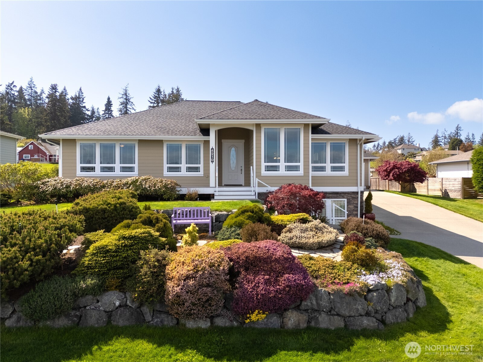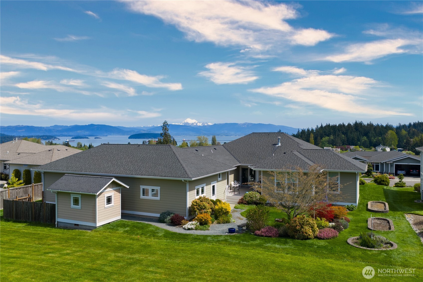 Beautifully maintained custom home with exceptional curb appeal, manicured landscaping, gorgeous views of the water and Mount Baker, and a spacious 3-car garage with a large bonus workshop space that can also be used for additional car storage. This thoughtfully designed home offers bright, open-concept living with large picture windows, soaring ceilings, and elegant built-ins surrounding the cozy gas fireplace. The gourmet kitchen features granite countertops, stainless steel appliances, abundant cabinetry, a large island with seating, and seamless flow into the main living and dining areas—perfect for entertaining. Spacious primary suite includes a luxurious ensuite bath with tiled walk-in shower and oversized walk-in closet. Additional highlights include a temperature-controlled wine room, expansive unfinished basement offering incredible storage or future potential, and quality finishes throughout. Downstairs could be converted into additional living space or used for extra storage. Enjoy peaceful outdoor living from the covered deck overlooking the private backyard with garden area. One of the best views in the entire neighborhood. Detached garden shed/workshop with potting sink adds even more functionality. Located in a quiet, highly desirable neighborhood close to town amenities, parks, and waterfront attractions.