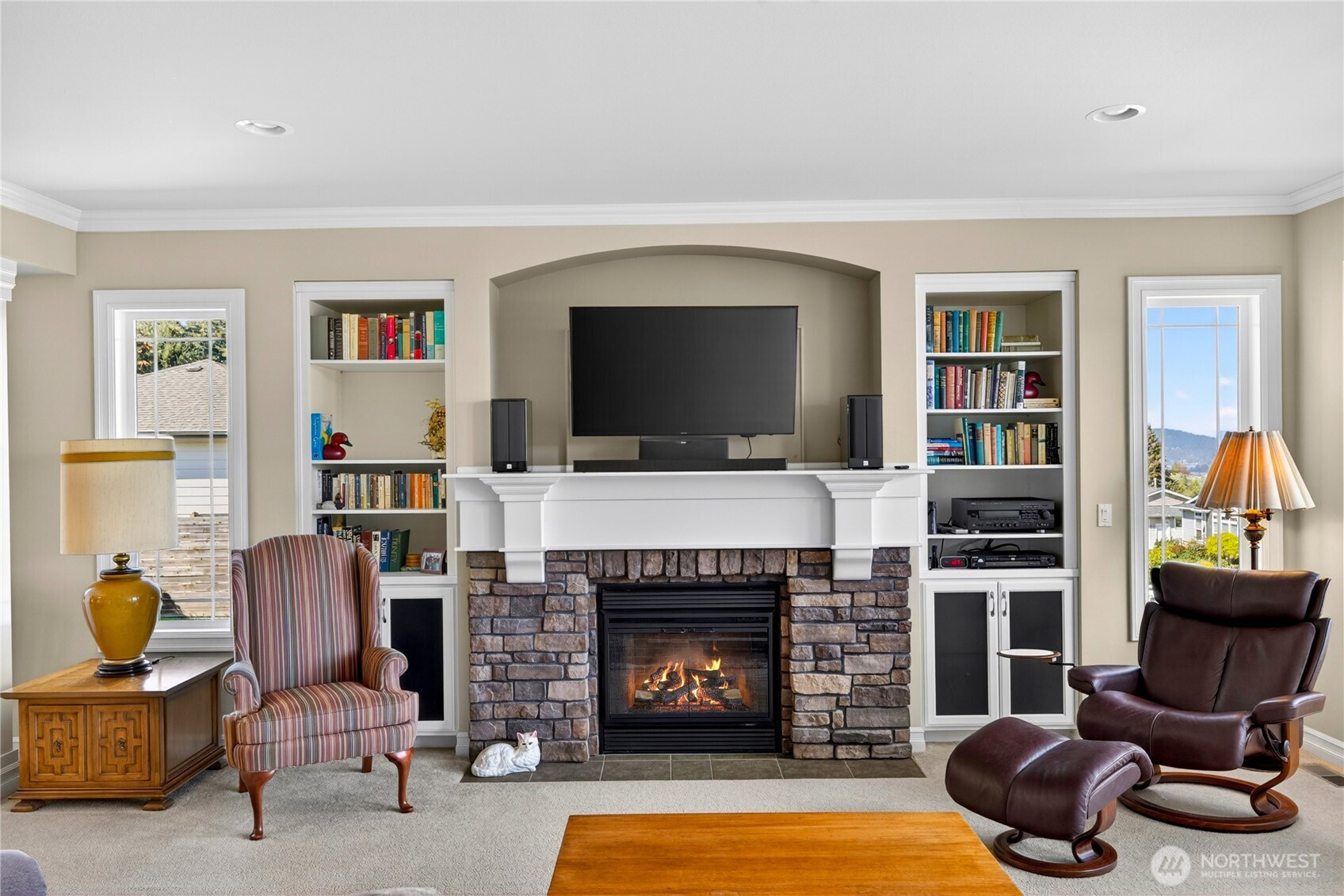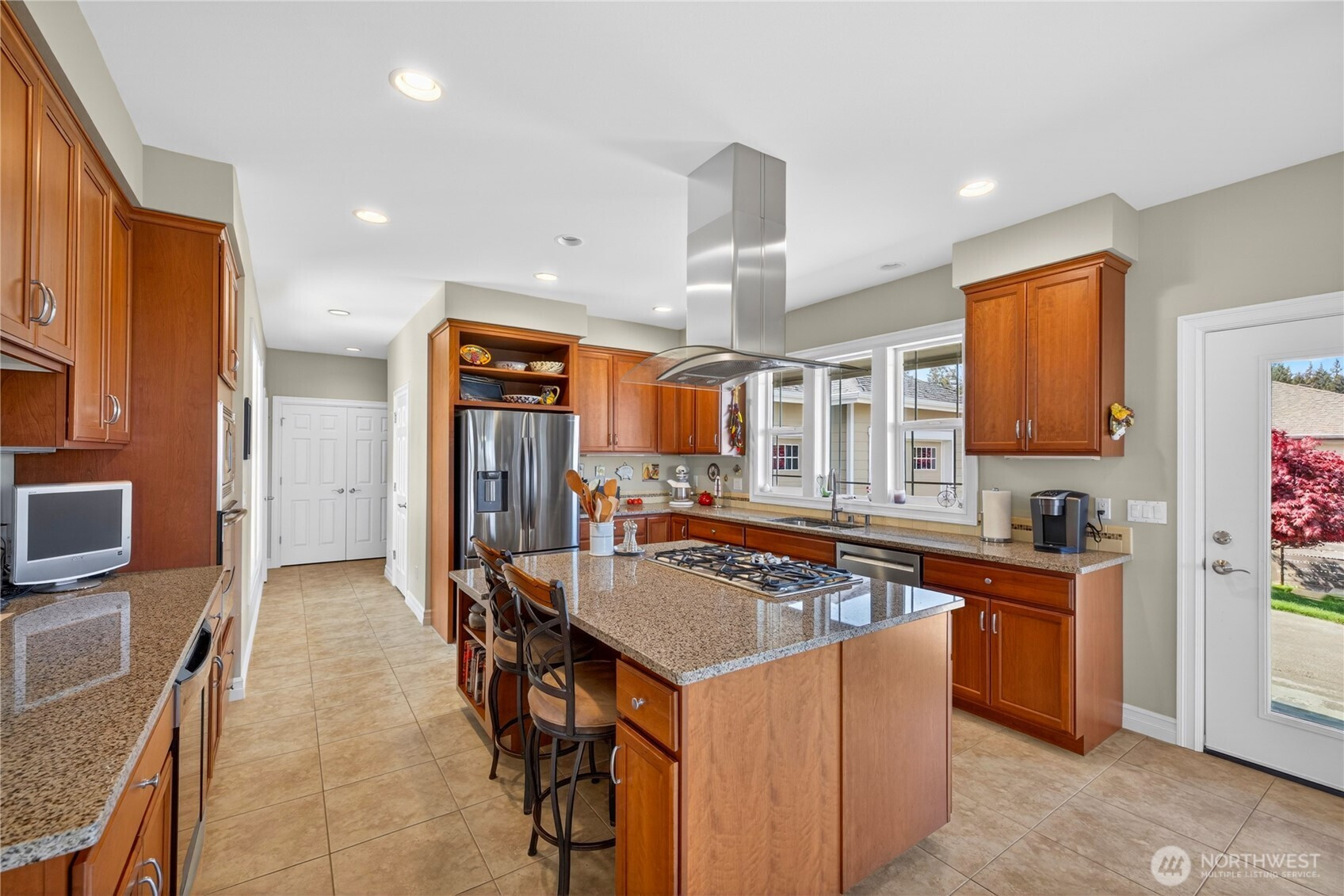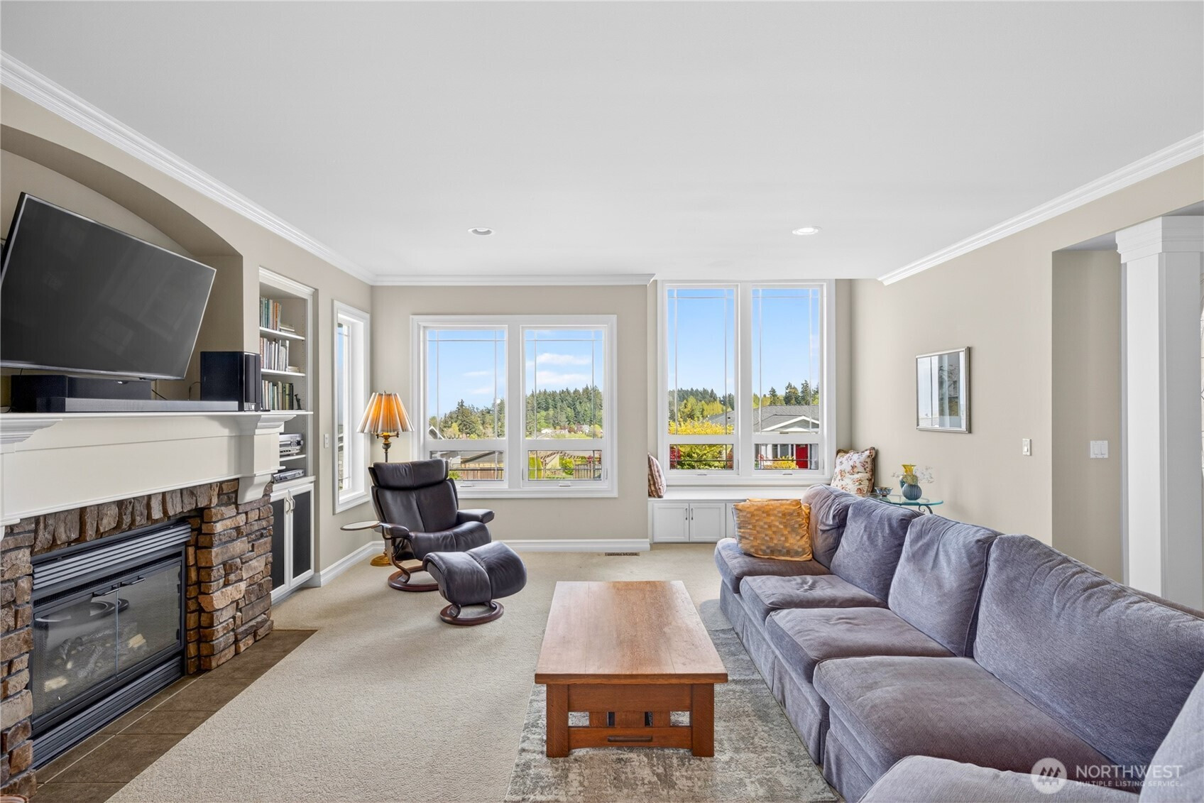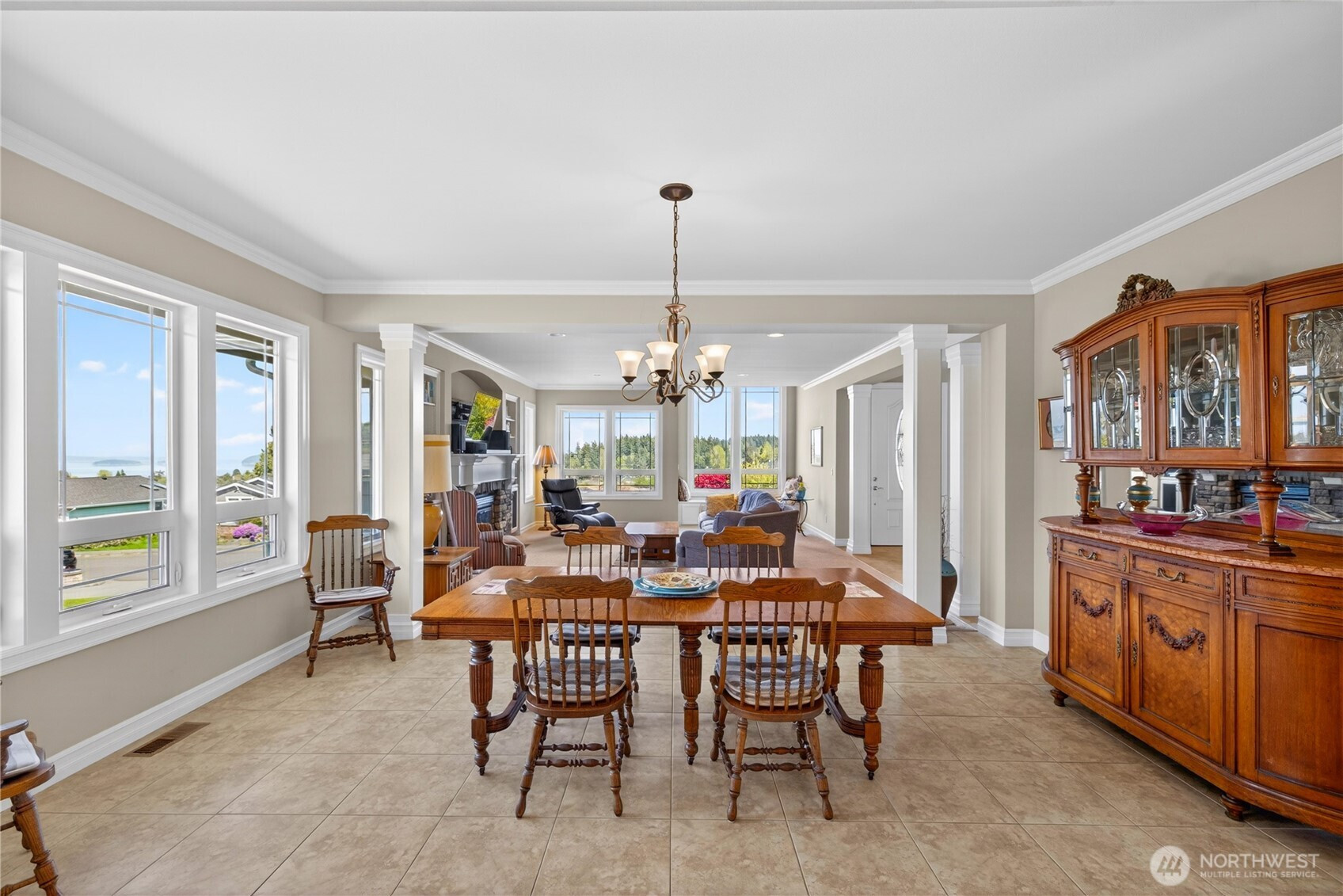 Beautifully maintained custom home with exceptional curb appeal, manicured landscaping, gorgeous views of the water and Mount Baker, and a spacious 3-car garage with a large bonus workshop space that can also be used for additional car storage. This thoughtfully designed home offers bright, open-concept living with large picture windows, soaring ceilings, and elegant built-ins surrounding the cozy gas fireplace. The gourmet kitchen features granite countertops, stainless steel appliances, abundant cabinetry, a large island with seating, and seamless flow into the main living and dining areas—perfect for entertaining. Spacious primary suite includes a luxurious ensuite bath with tiled walk-in shower and oversized walk-in closet. Additional highlights include a temperature-controlled wine room, expansive unfinished basement offering incredible storage or future potential, and quality finishes throughout. Downstairs could be converted into additional living space or used for extra storage. Enjoy peaceful outdoor living from the covered deck overlooking the private backyard with garden area. One of the best views in the entire neighborhood. Detached garden shed/workshop with potting sink adds even more functionality. Located in a quiet, highly desirable neighborhood close to town amenities, parks, and waterfront attractions.