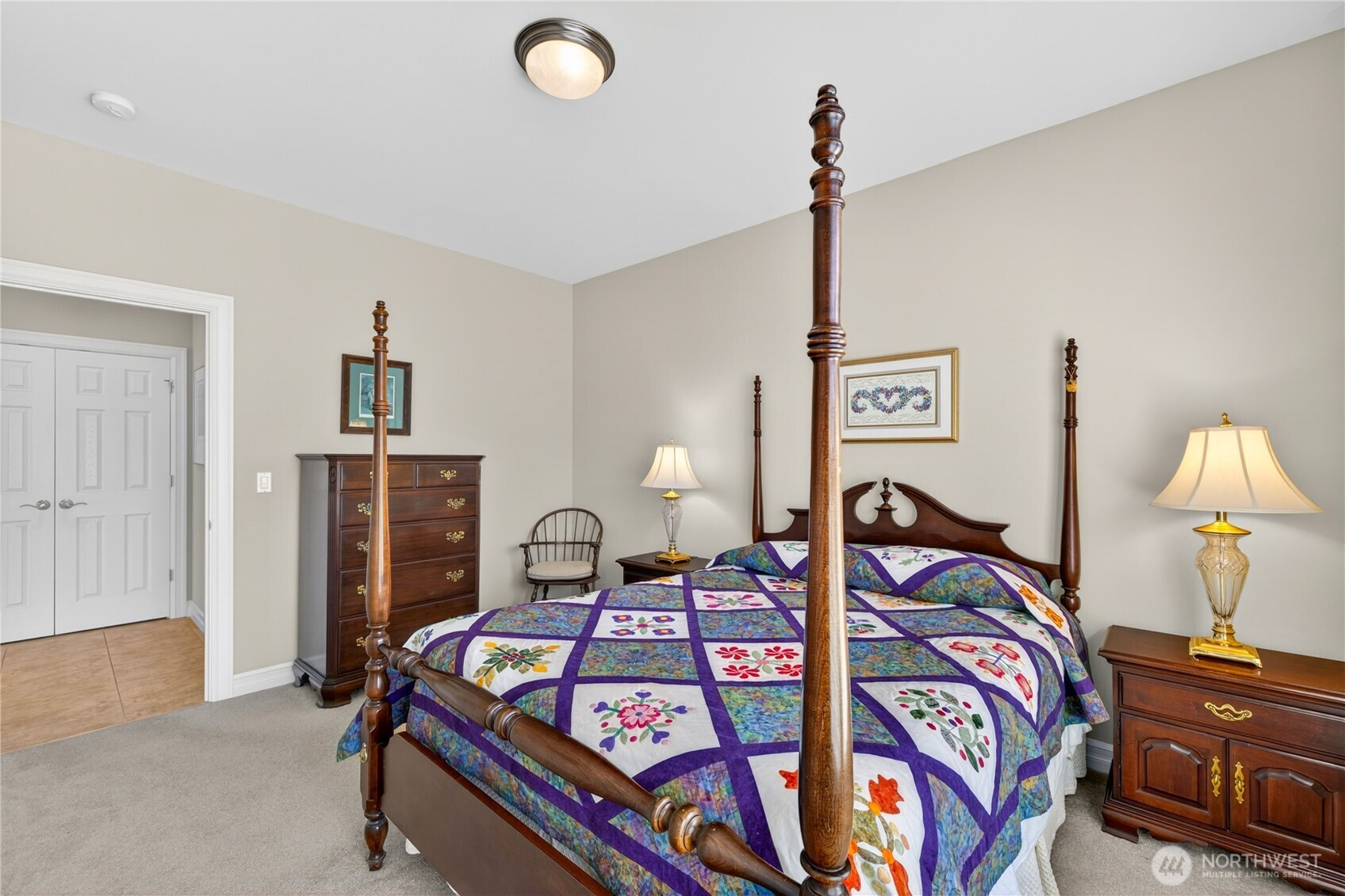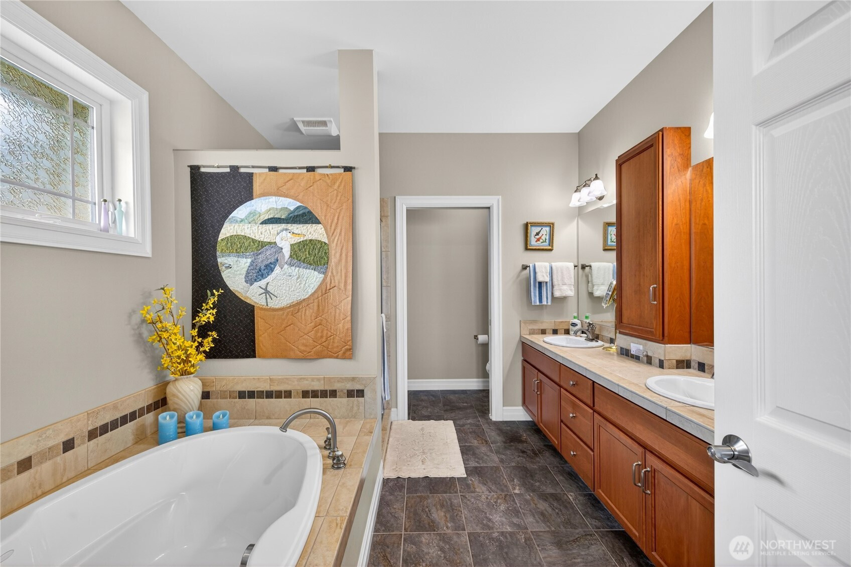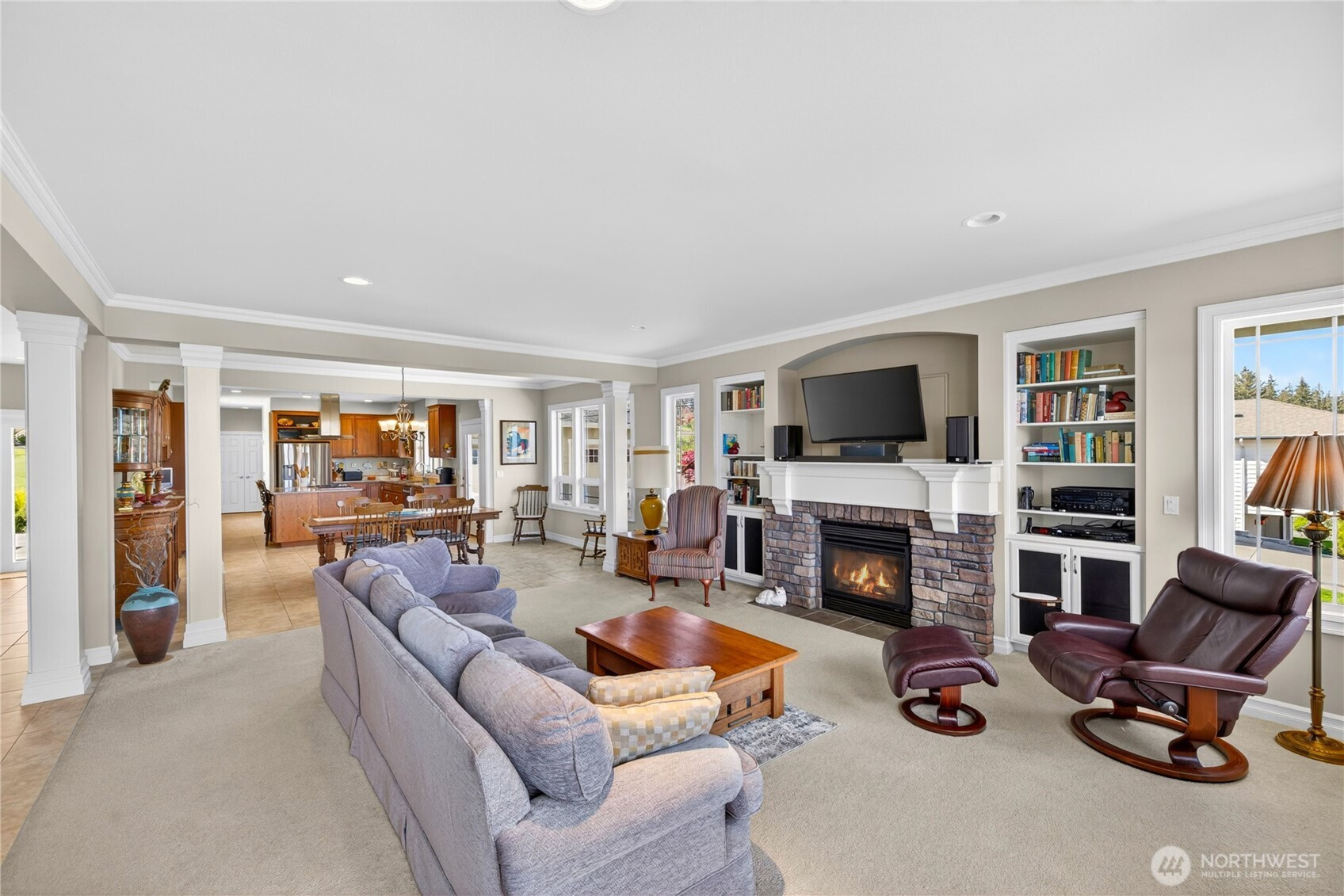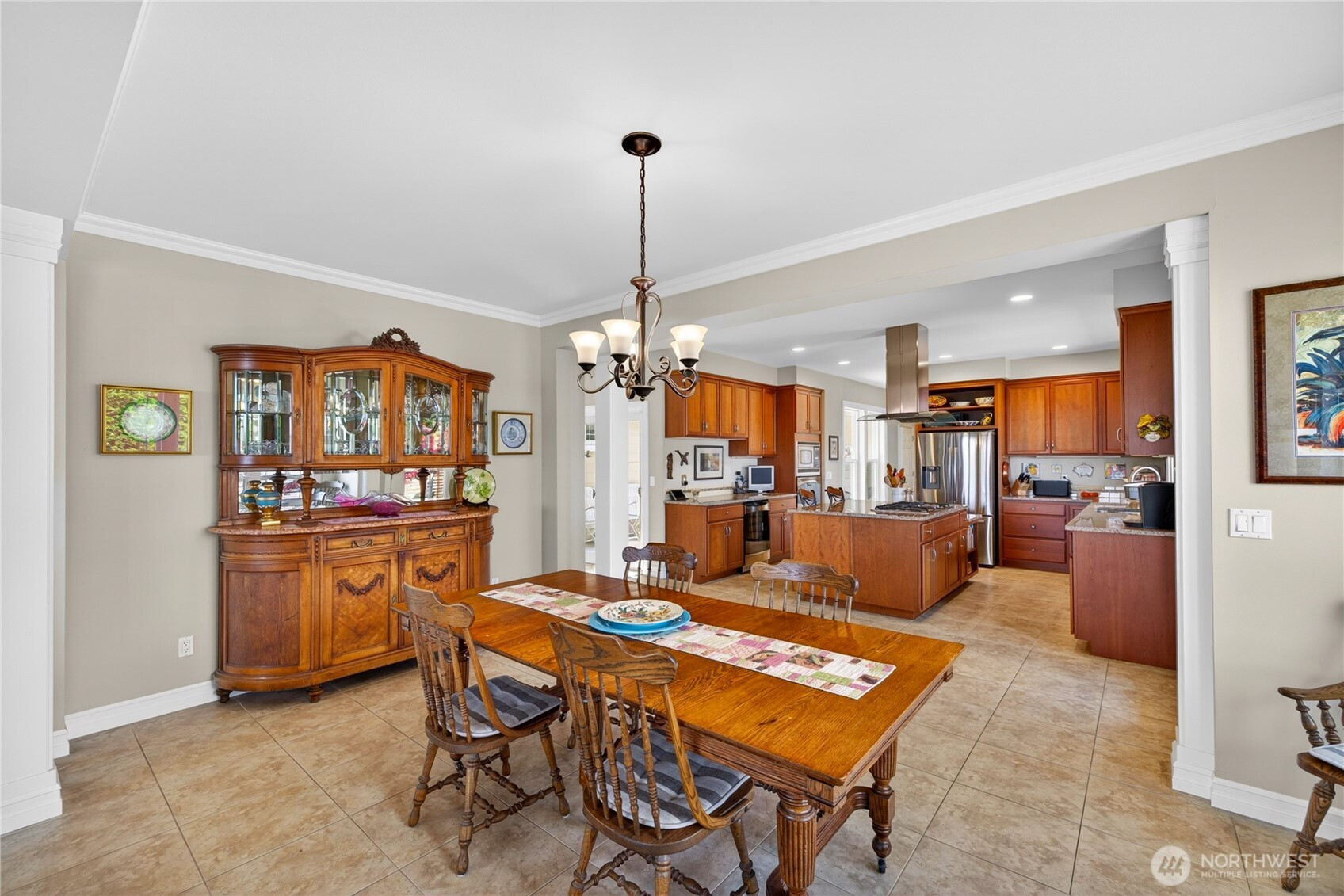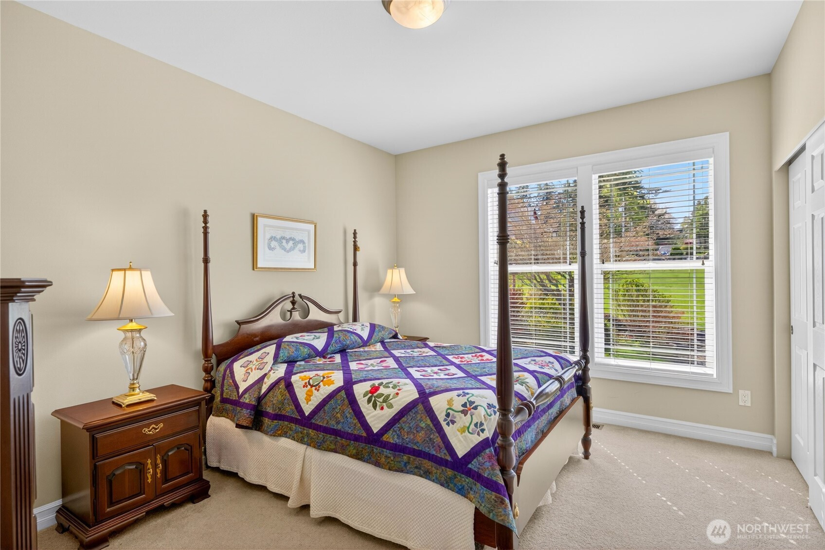 Beautifully maintained custom home with exceptional curb appeal, manicured landscaping, gorgeous views of the water and Mount Baker, and a spacious 3-car garage with a large bonus workshop space that can also be used for additional car storage. This thoughtfully designed home offers bright, open-concept living with large picture windows, soaring ceilings, and elegant built-ins surrounding the cozy gas fireplace. The gourmet kitchen features granite countertops, stainless steel appliances, abundant cabinetry, a large island with seating, and seamless flow into the main living and dining areas—perfect for entertaining. Spacious primary suite includes a luxurious ensuite bath with tiled walk-in shower and oversized walk-in closet. Additional highlights include a temperature-controlled wine room, expansive unfinished basement offering incredible storage or future potential, and quality finishes throughout. Downstairs could be converted into additional living space or used for extra storage. Enjoy peaceful outdoor living from the covered deck overlooking the private backyard with garden area. One of the best views in the entire neighborhood. Detached garden shed/workshop with potting sink adds even more functionality. Located in a quiet, highly desirable neighborhood close to town amenities, parks, and waterfront attractions.
