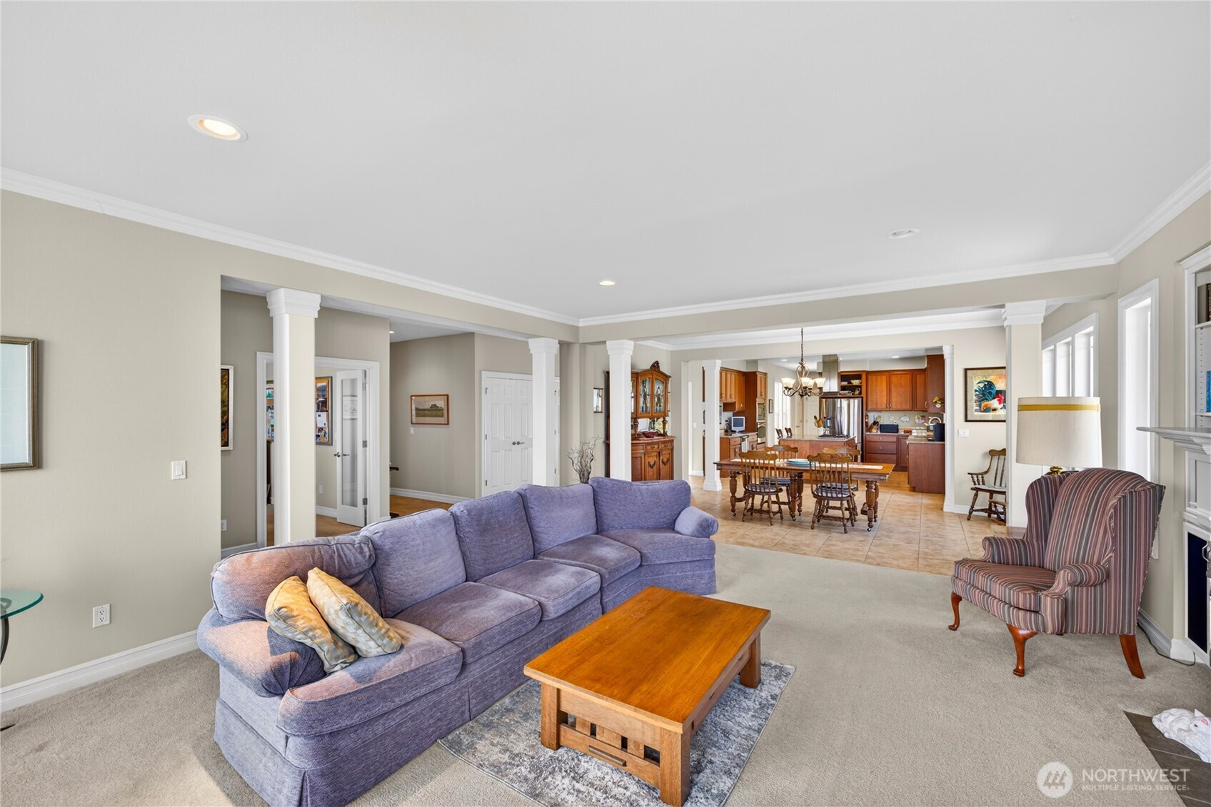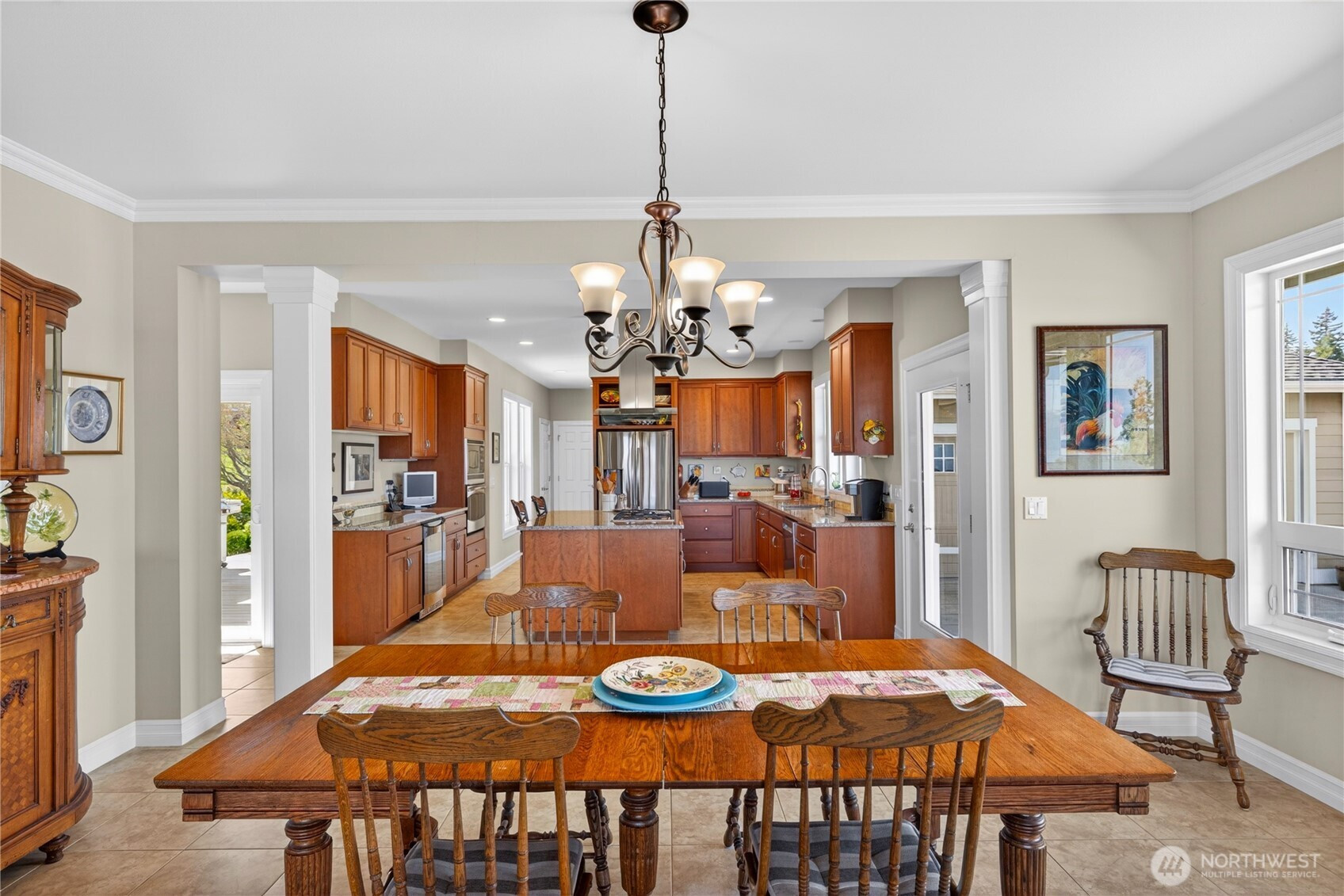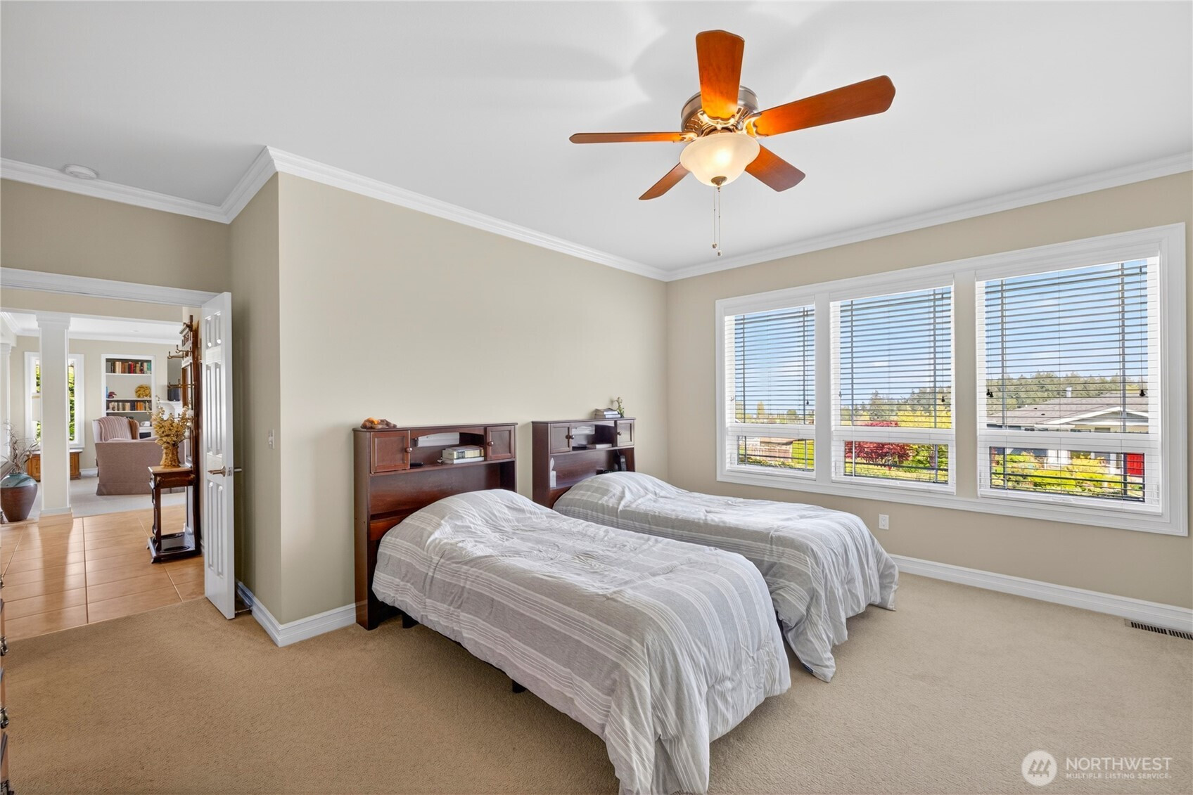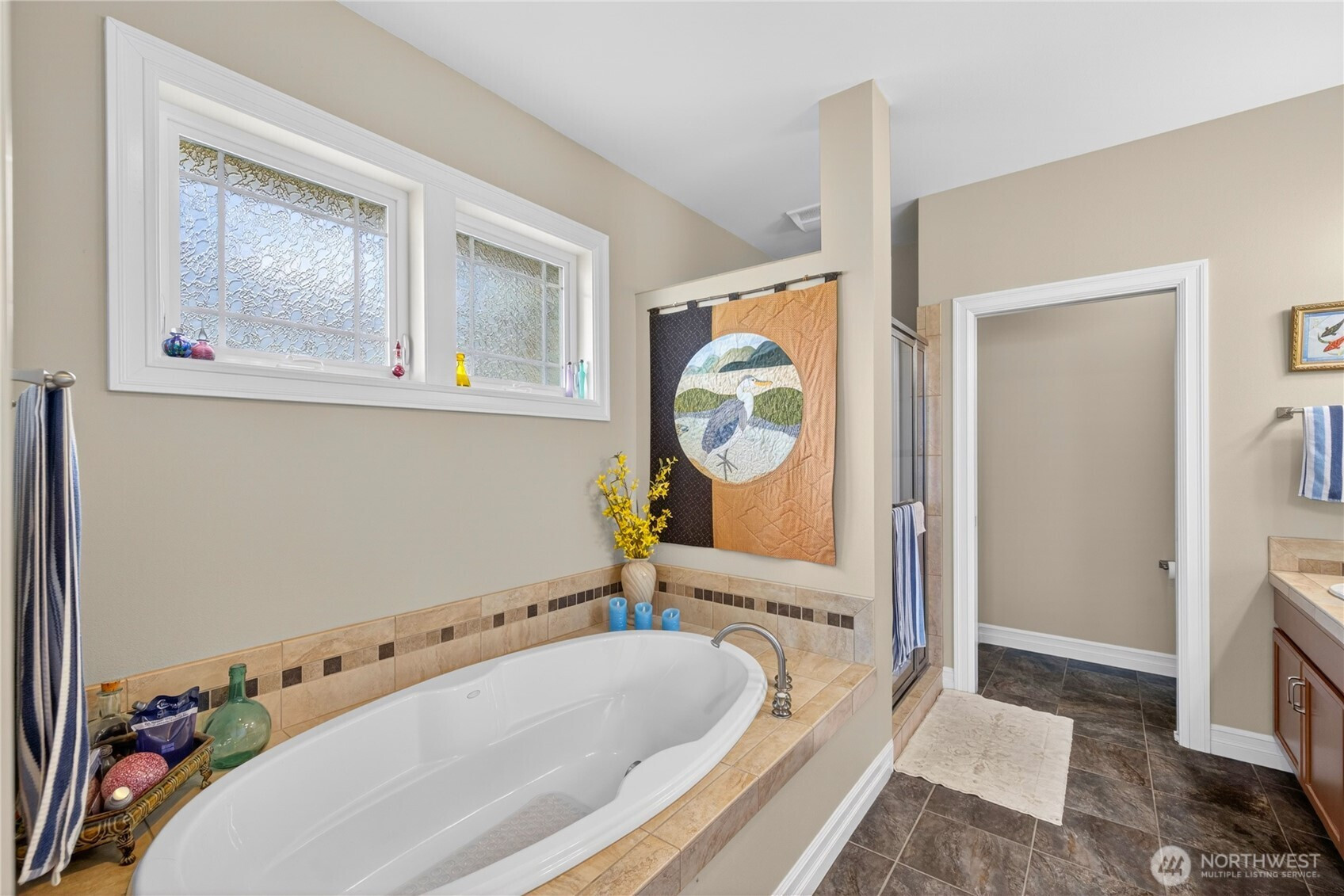 Beautifully maintained custom home with exceptional curb appeal, manicured landscaping, gorgeous views of the water and Mount Baker, and a spacious 3-car garage with a large bonus workshop space that can also be used for additional car storage. This thoughtfully designed home offers bright, open-concept living with large picture windows, soaring ceilings, and elegant built-ins surrounding the cozy gas fireplace. The gourmet kitchen features granite countertops, stainless steel appliances, abundant cabinetry, a large island with seating, and seamless flow into the main living and dining areas—perfect for entertaining. Spacious primary suite includes a luxurious ensuite bath with tiled walk-in shower and oversized walk-in closet. Additional highlights include a temperature-controlled wine room, expansive unfinished basement offering incredible storage or future potential, and quality finishes throughout. Downstairs could be converted into additional living space or used for extra storage. Enjoy peaceful outdoor living from the covered deck overlooking the private backyard with garden area. One of the best views in the entire neighborhood. Detached garden shed/workshop with potting sink adds even more functionality. Located in a quiet, highly desirable neighborhood close to town amenities, parks, and waterfront attractions.