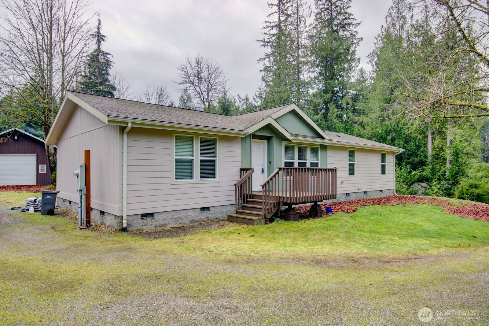 Discover serene country living on this private 1.46-acre parcel in a serene park-like community, tucked away on a quiet dead-end road just 10 minutes north of Sedro-Woolley. This impeccably maintained manufactured home sits on a solid block foundation and boasts a full-length south-facing deck perfect for enjoying sunny days and peaceful views. Step inside to an inviting layout with bedrooms at opposite ends for added privacy, a cozy family room, and a spacious open living/dining area filled with natural light. The property includes a generous 30x36 shop with overhead storage. Fully cleared and level, the land is a blank canvas ready for your garden, animals, oroutdoor dreams. Don't miss this blend of privacy, convenience,and potential!