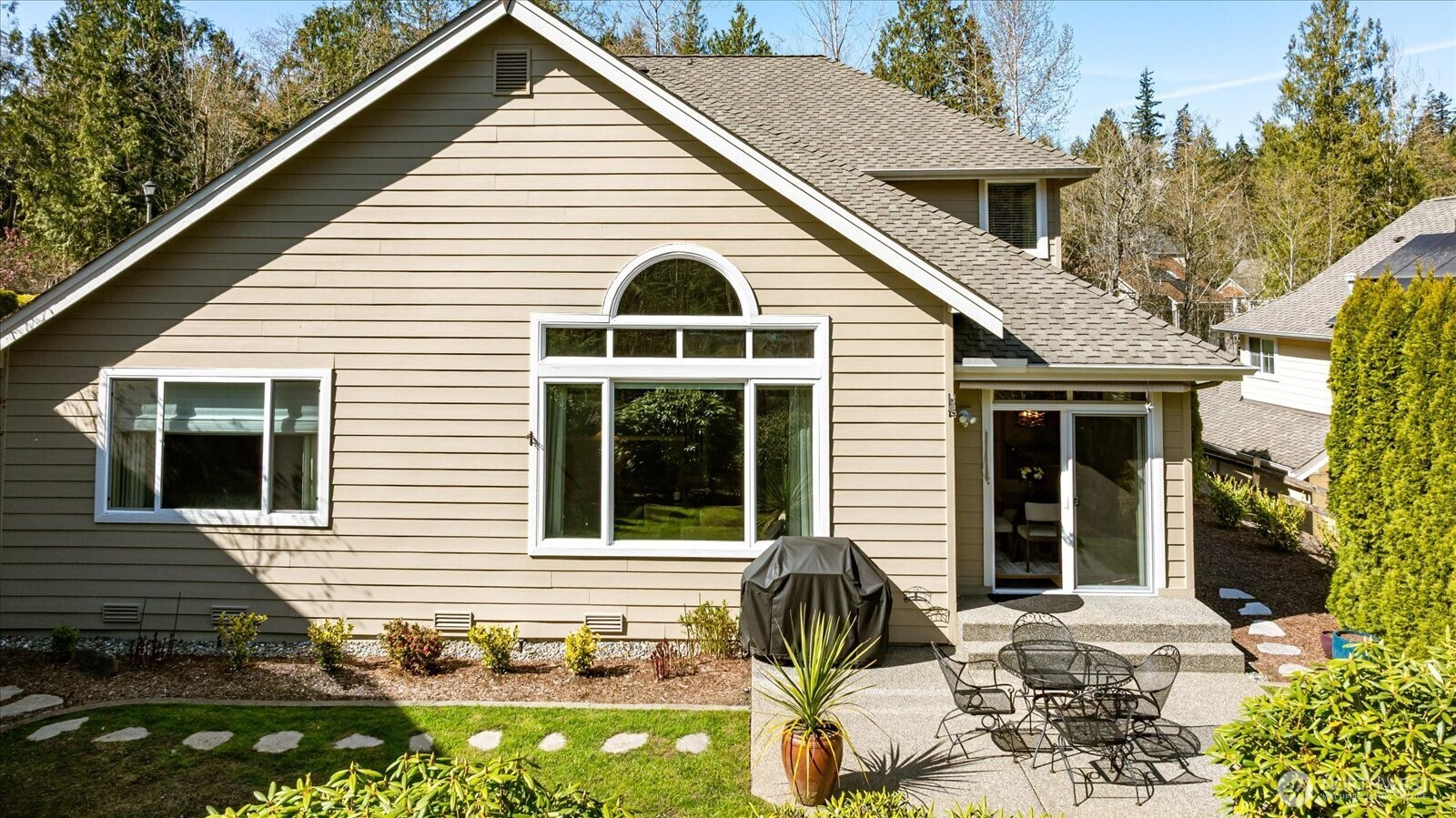 Welcome to The Terrace at Eaglemont, where thoughtful design meets exceptional pride of ownership. This beautifully landscaped, west-facing home offers a warm and inviting presence, with afternoon & evening light pouring into the living spaces and a private backyard backing to a peaceful greenbelt an ideal setting for relaxing or entertaining on the patio.This two-story 4-bedroom home features a primary suite w/full bath on the main level, offering comfort & convenience for everyday living, along with a dedicated office perfect for today’s flexible work-from-home lifestyle. The open-concept design is both functional and comfortable, anchored by a cozy living room with gas fireplace and an updated chef-inspired kitchen featuring granite countertops, a walk-in pantry, all new appliances, and an eating space that overlooks the serene backyard. A private dining room on the main level offers an additional inviting space for gatherings, holidays, or quiet evenings at home. Upstairs, you’ll find three generously sized bedrooms and a spacious bonus room filled with natural light—ideal for a media room, play space, or additional living area along with a fully remodeled full bath. Add'l highlights include a three-car garage with ample space for storage, hobbies, or recreational gear, and recent system upgrades including a new furnace, air conditioning, and hot water heater. Immaculately maintained & move-in ready, this home truly stands out in one of Mount Vernon's sought after areas.