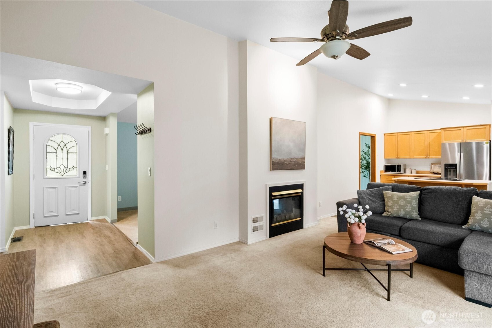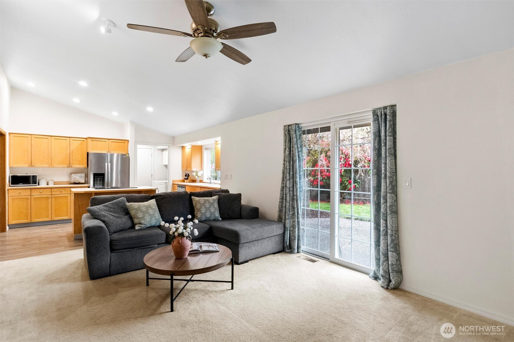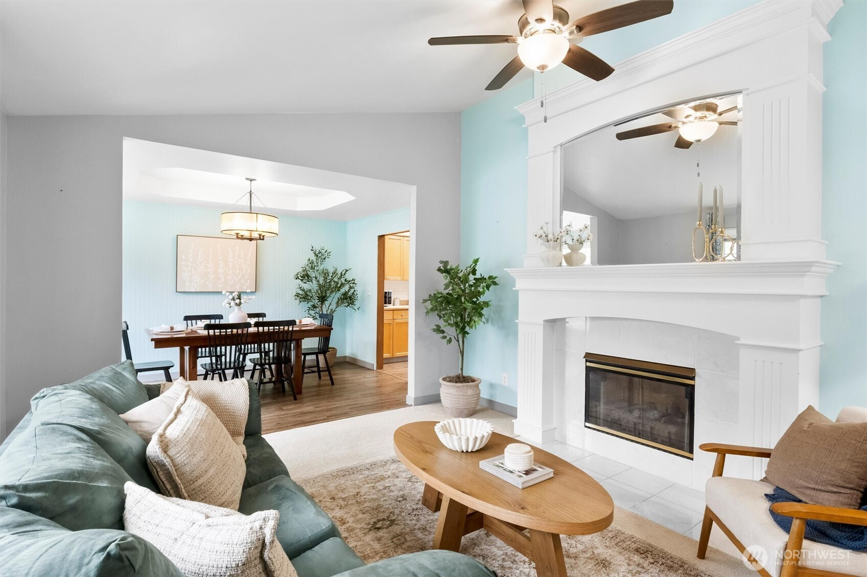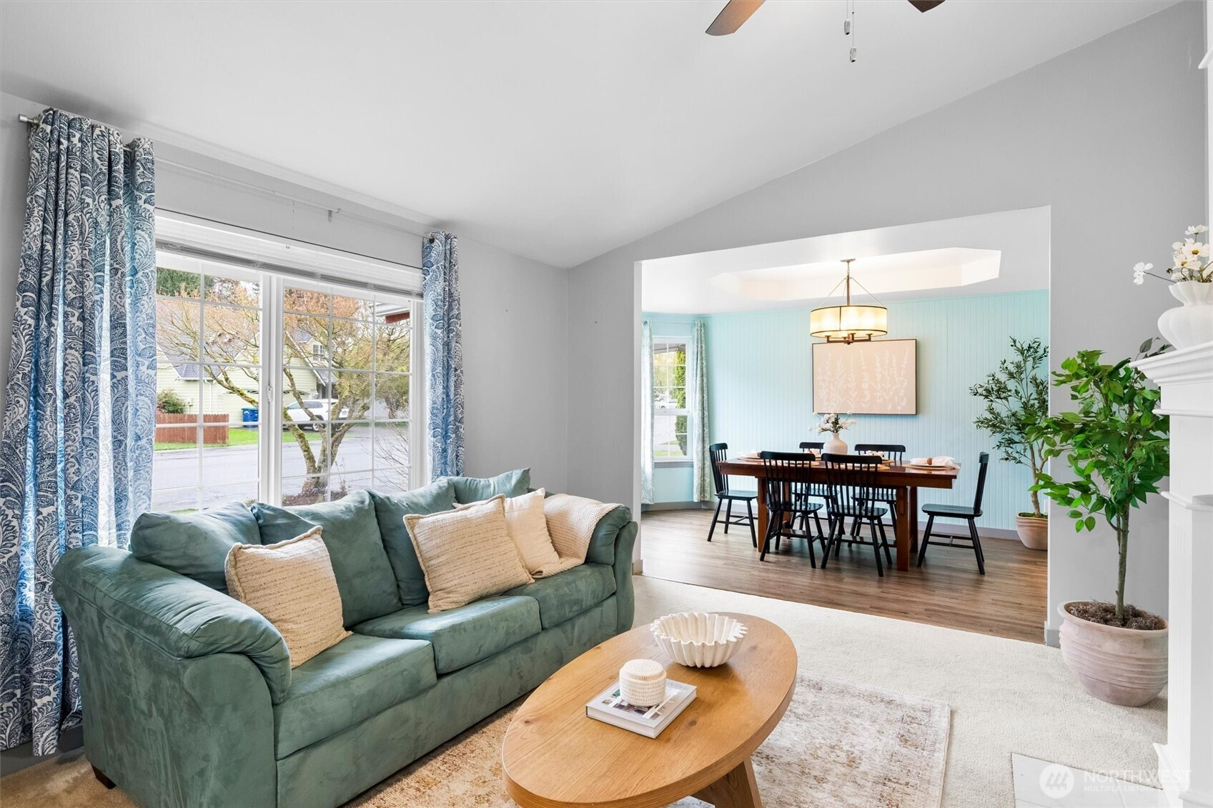 3 bed, 2 bath rambler in a quiet Sedro-Woolley setting featuring two separate living areas and a formal dining space, offering flexibility for everyday living and entertaining. A double-sided fireplace connects the living spaces, adding warmth and character. The kitchen provides ample cabinetry. Primary suite includes an updated bathroom with vanity and walk-in closet. Roof and solar installed in 2024, with furnace and water heater updated in 2020. Fully fenced yard features a Japanese maple and space for outdoor use, with convenient access to local amenities and commuter routes.