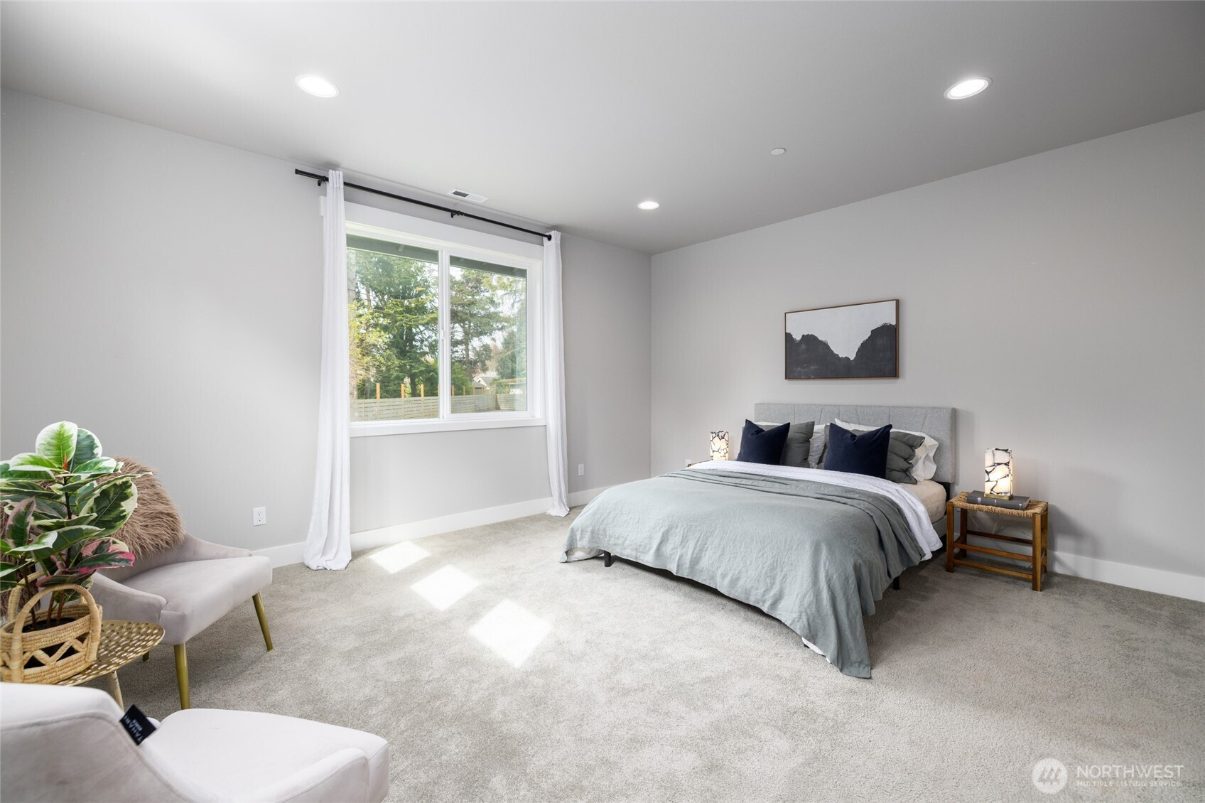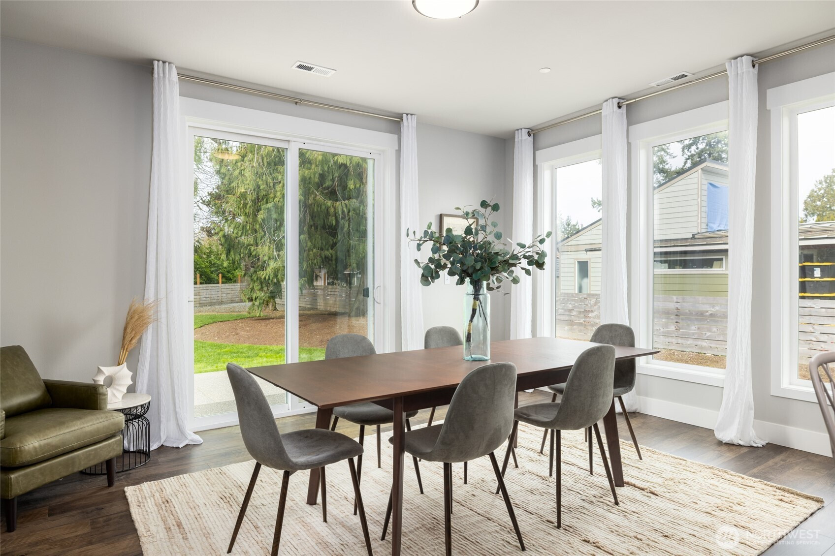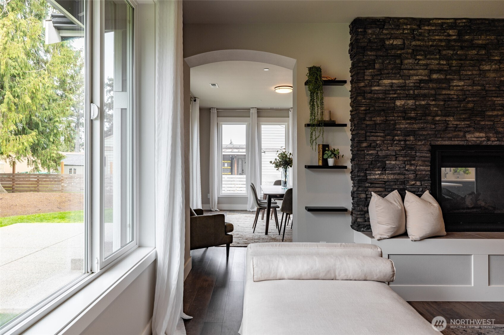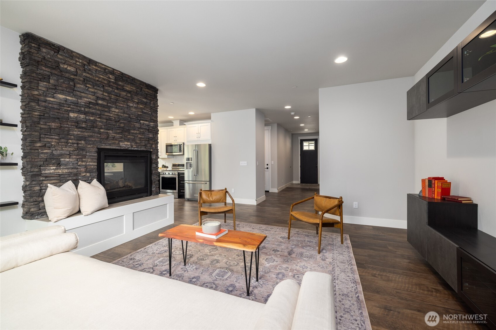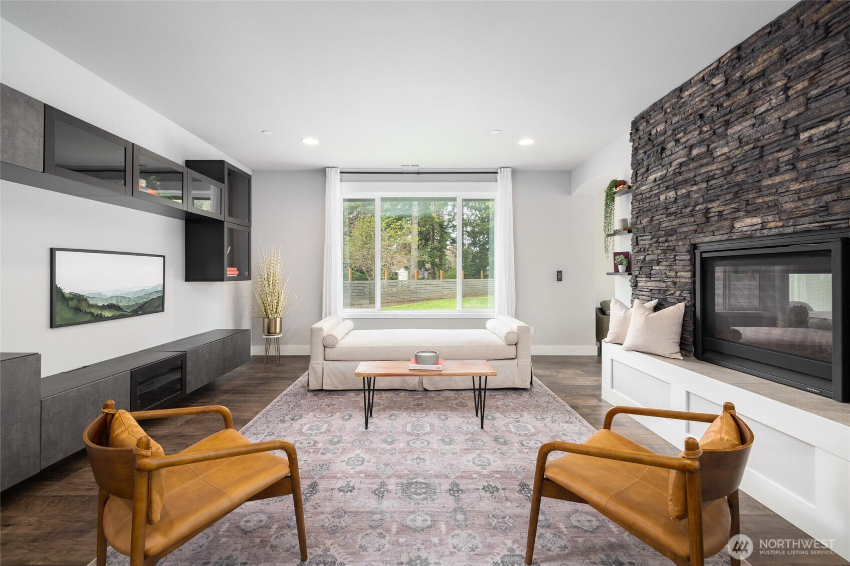 Immaculate custom luxury rambler nestled in a serene, established Mount Vernon neighborhood, offering refined single level living on over one-third acre. Soaring ceilings and light filled open architecture create an elegant, airy atmosphere, while oversized windows invite an abundance of natural light. Main living spaces are beautifully appointed with luxury vinyl plank flooring and centered around a striking see-through stone fireplace that adds warmth and sophistication to both the living and dining areas. Entertainment kitchen features glistening quartz countertops, full tile splash, soft close cabinetry, stainless steel appliances, gas range, bar seating, and a generous walk-in pantry. The expansive dining room and gracious living area offer the ideal blend of everyday comfort and effortless entertaining. The private primary suite is a true retreat with a spa inspired 5-piece bath, dual vanity, oversized tiled walk-in shower, and generous walk-in closet. Two spacious guest bedrooms and a full guest bath offer flexibility and complete the layout. Step outside to enjoy a fully fenced backyard with manicured, easy-care grounds and a wonderful patio designed for year-round enjoyment. Oversized 3-car garage, hot and cold exterior water, and ample space for all the toys, including trailer or RV parking. Fantastic location close to medical services, shopping, outstanding parks, hiking and biking trails, and just minutes to historic downtown.