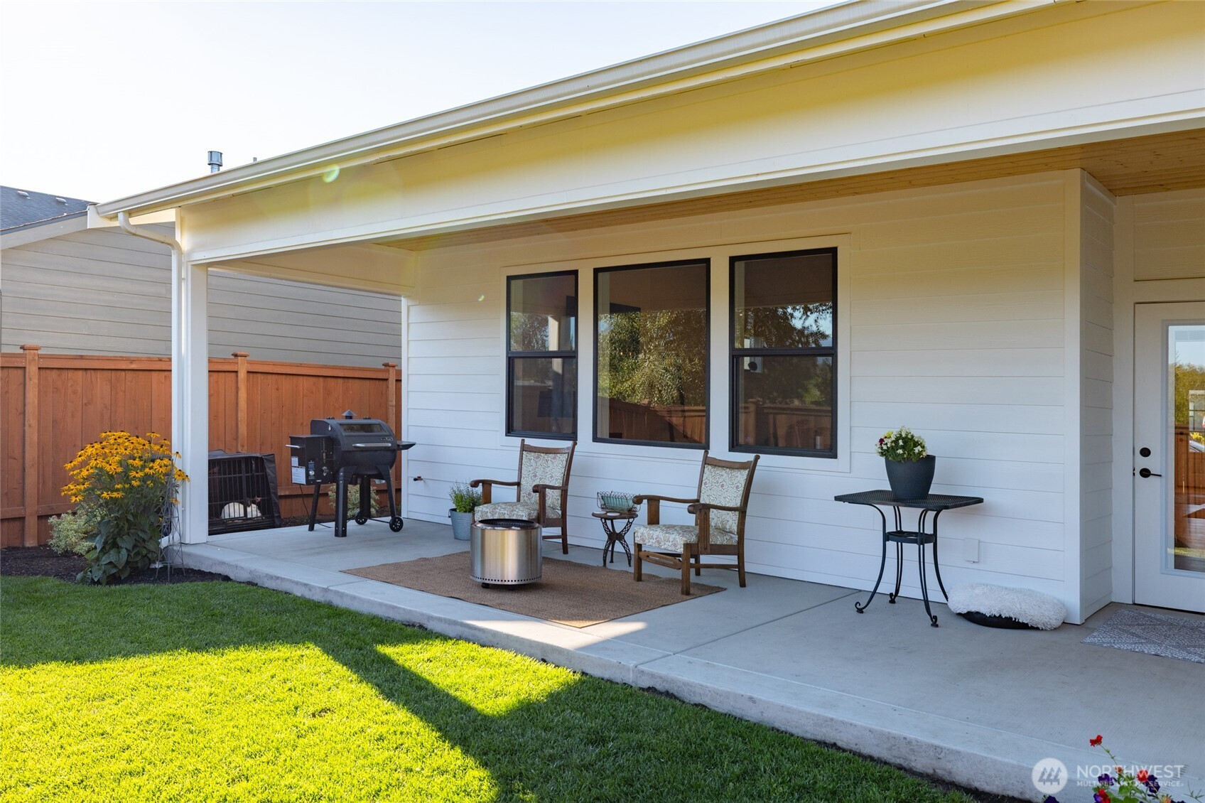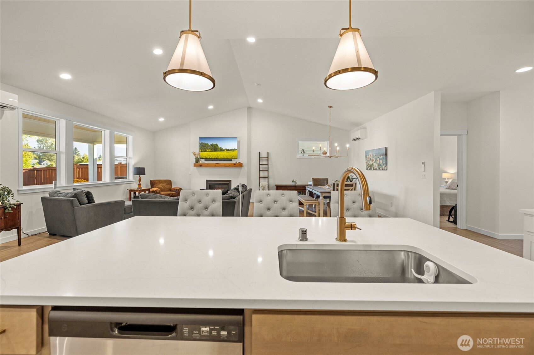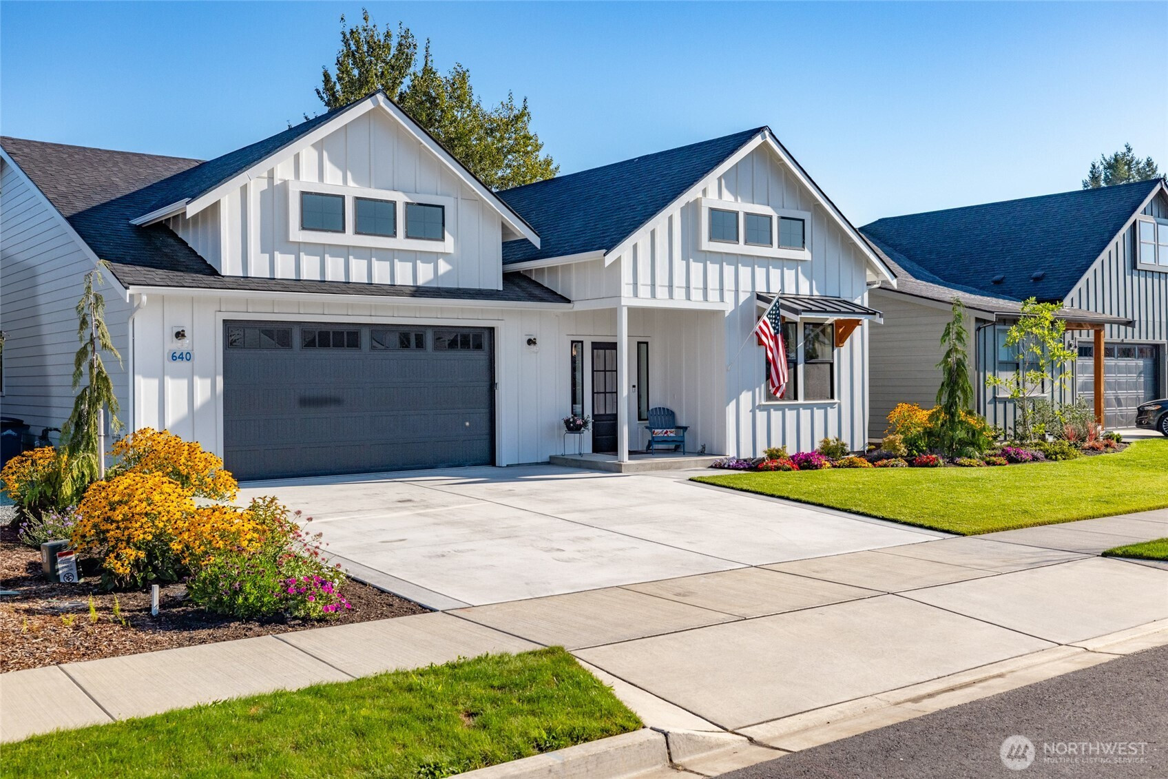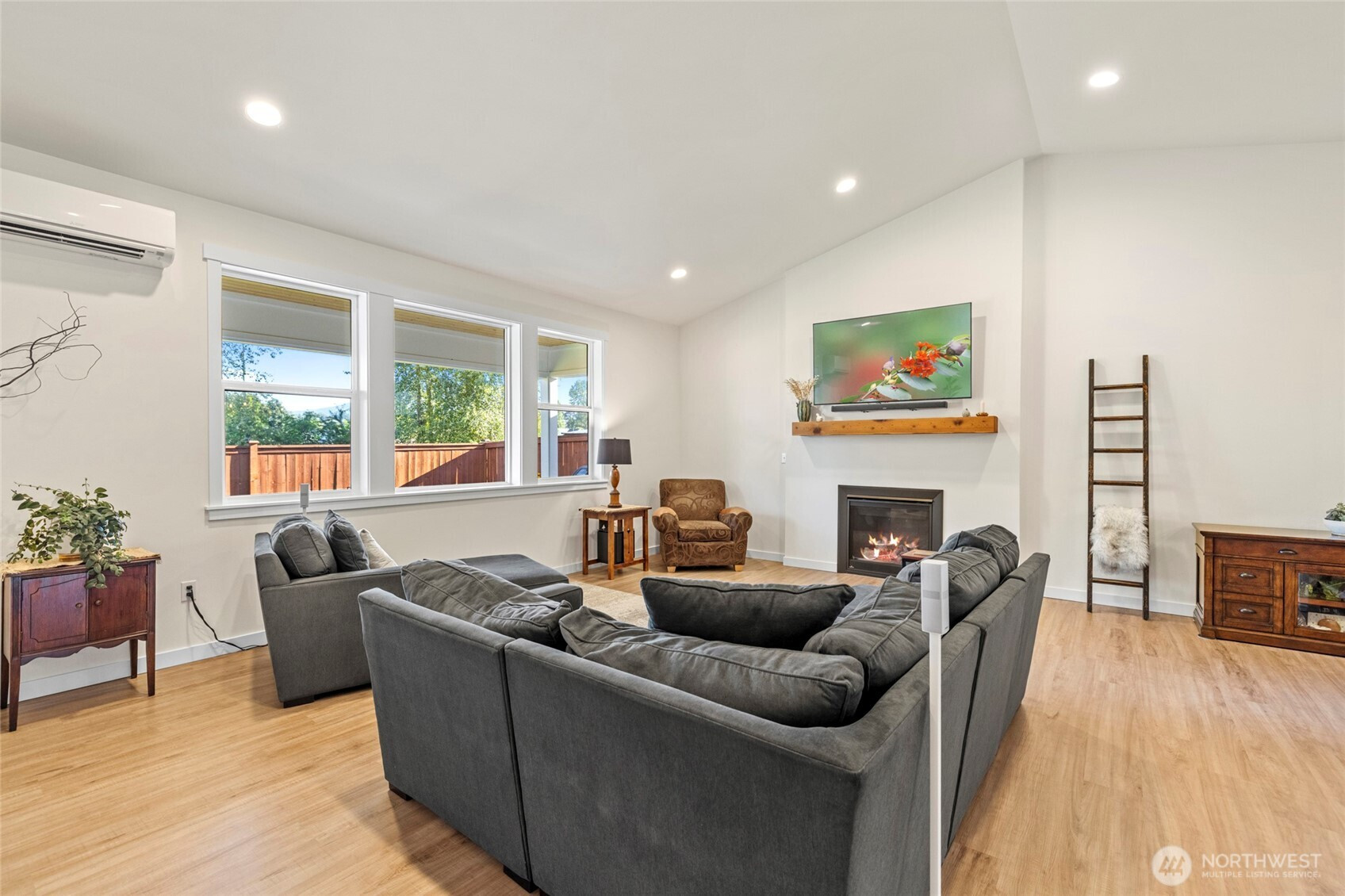 Just like new but with the benefit of more developed landscaping and a feel of "home". This single level floor plan has a great open concept. Wide entryway leads to an expansive great room, vaulted ceilings, gas fireplace & LVP flooring. Kitchen with Quartz counters, gas range, 36" upper Blonde cabinets, ample storage & great size island for functionality. All upgraded lighting & plumbing fixtures. Utility room has ample storage adjacent to the kitchen. Mini splits provide heat/AC. The primary bedroom has vaulted ceilings, ensuite bath w/a tile floor & shower, double sinks and walk in closet. Two generous guest bedrooms with lots of light. Private covered patio with beautiful yard fully landscaped & fenced w/plenty of room for gardening.