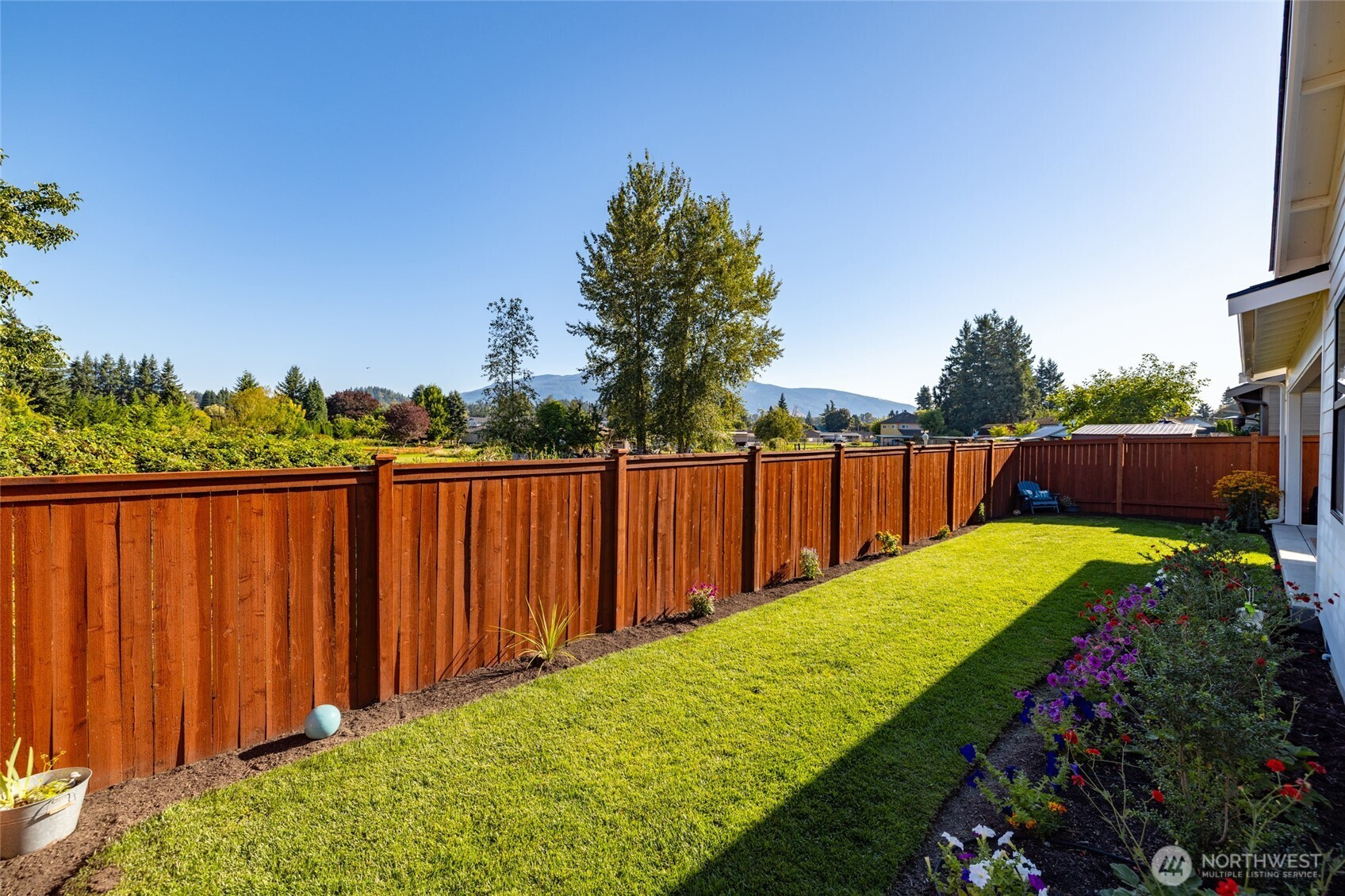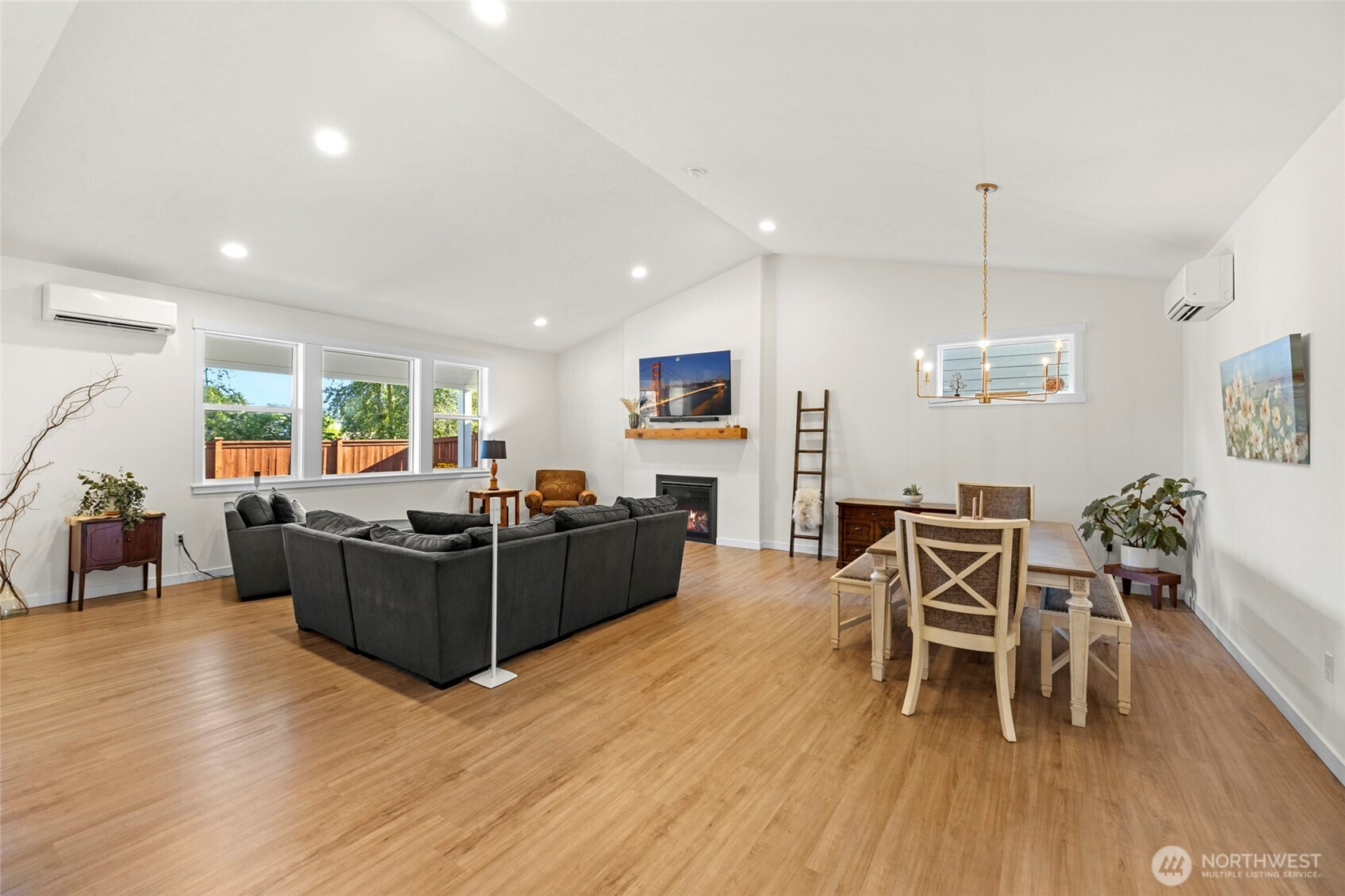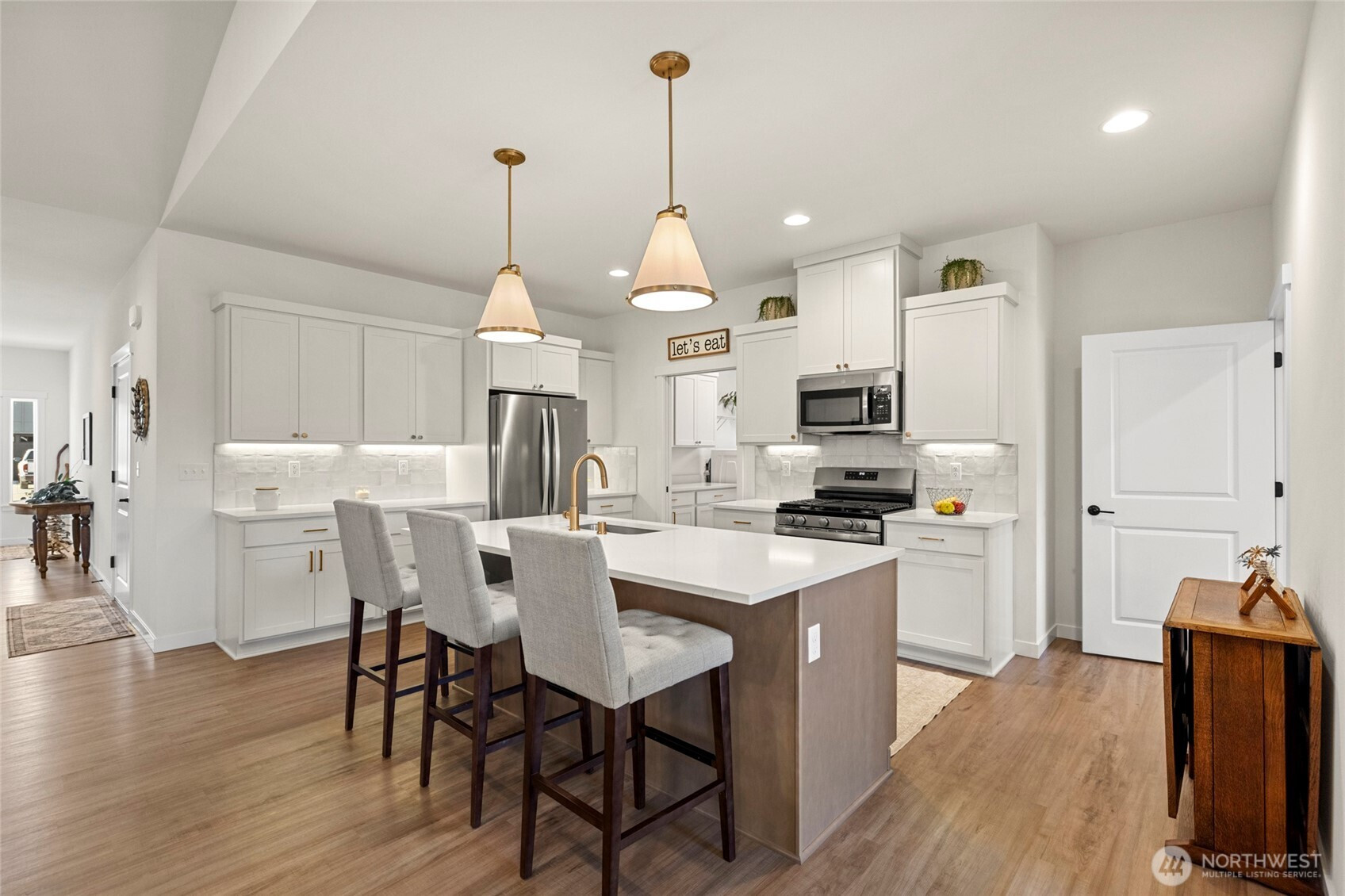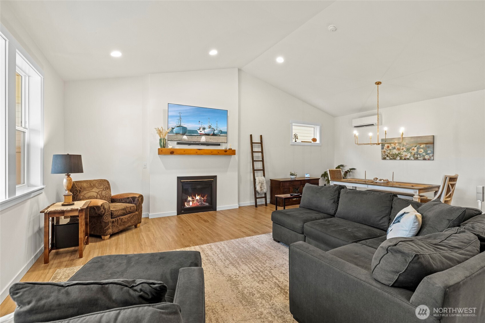 Just like new but with the benefit of more developed landscaping and a feel of "home". This single level floor plan has a great open concept. Wide entryway leads to an expansive great room, vaulted ceilings, gas fireplace & LVP flooring. Kitchen with Quartz counters, gas range, 36" upper Blonde cabinets, ample storage & great size island for functionality. All upgraded lighting & plumbing fixtures. Utility room has ample storage adjacent to the kitchen. Mini splits provide heat/AC. The primary bedroom has vaulted ceilings, ensuite bath w/a tile floor & shower, double sinks and walk in closet. Two generous guest bedrooms with lots of light. Private covered patio with beautiful yard fully landscaped & fenced w/plenty of room for gardening.
