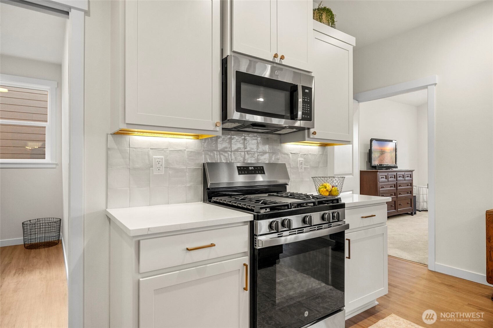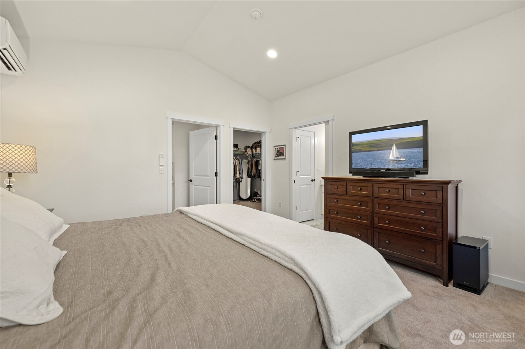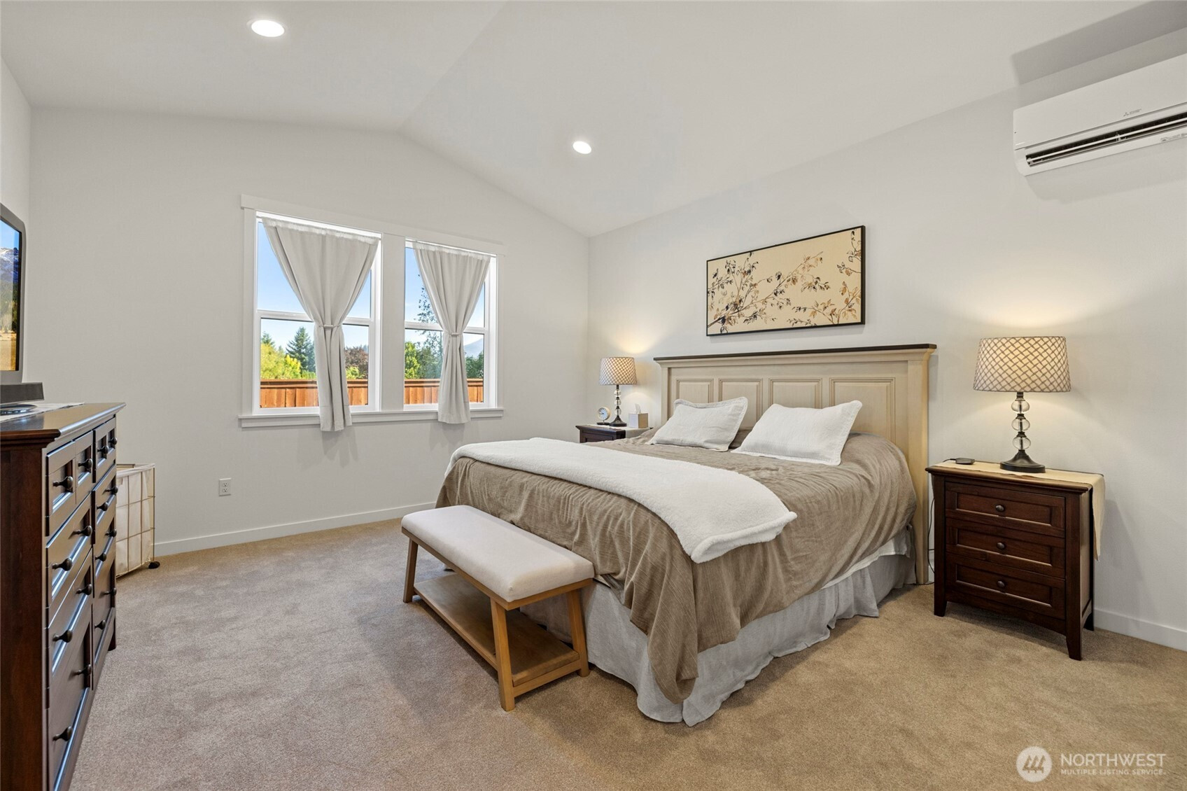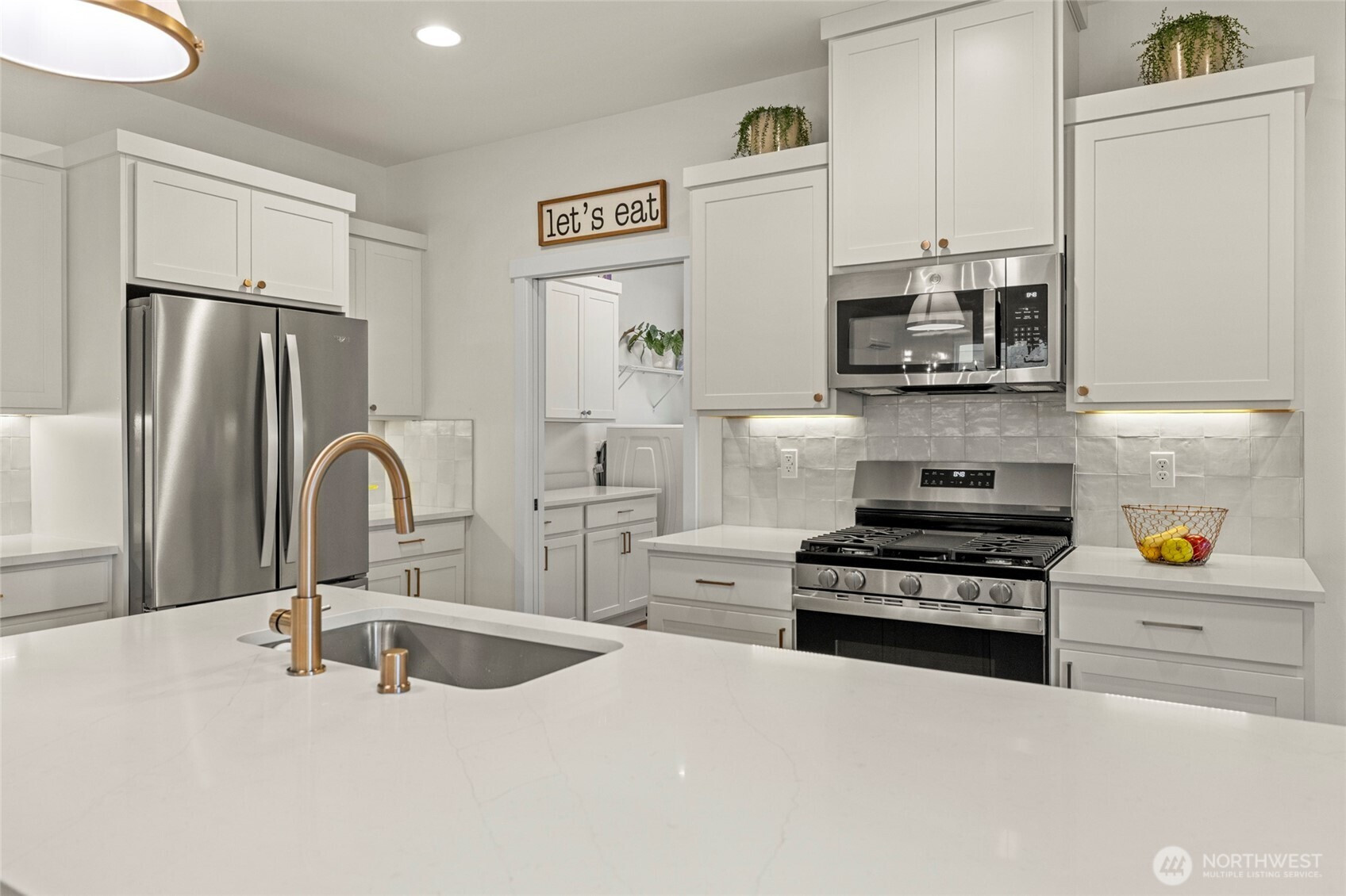 Just like new but with the benefit of more developed landscaping and a feel of "home". This single level floor plan has a great open concept. Wide entryway leads to an expansive great room, vaulted ceilings, gas fireplace & LVP flooring. Kitchen with Quartz counters, gas range, 36" upper Blonde cabinets, ample storage & great size island for functionality. All upgraded lighting & plumbing fixtures. Utility room has ample storage adjacent to the kitchen. Mini splits provide heat/AC. The primary bedroom has vaulted ceilings, ensuite bath w/a tile floor & shower, double sinks and walk in closet. Two generous guest bedrooms with lots of light. Private covered patio with beautiful yard fully landscaped & fenced w/plenty of room for gardening.