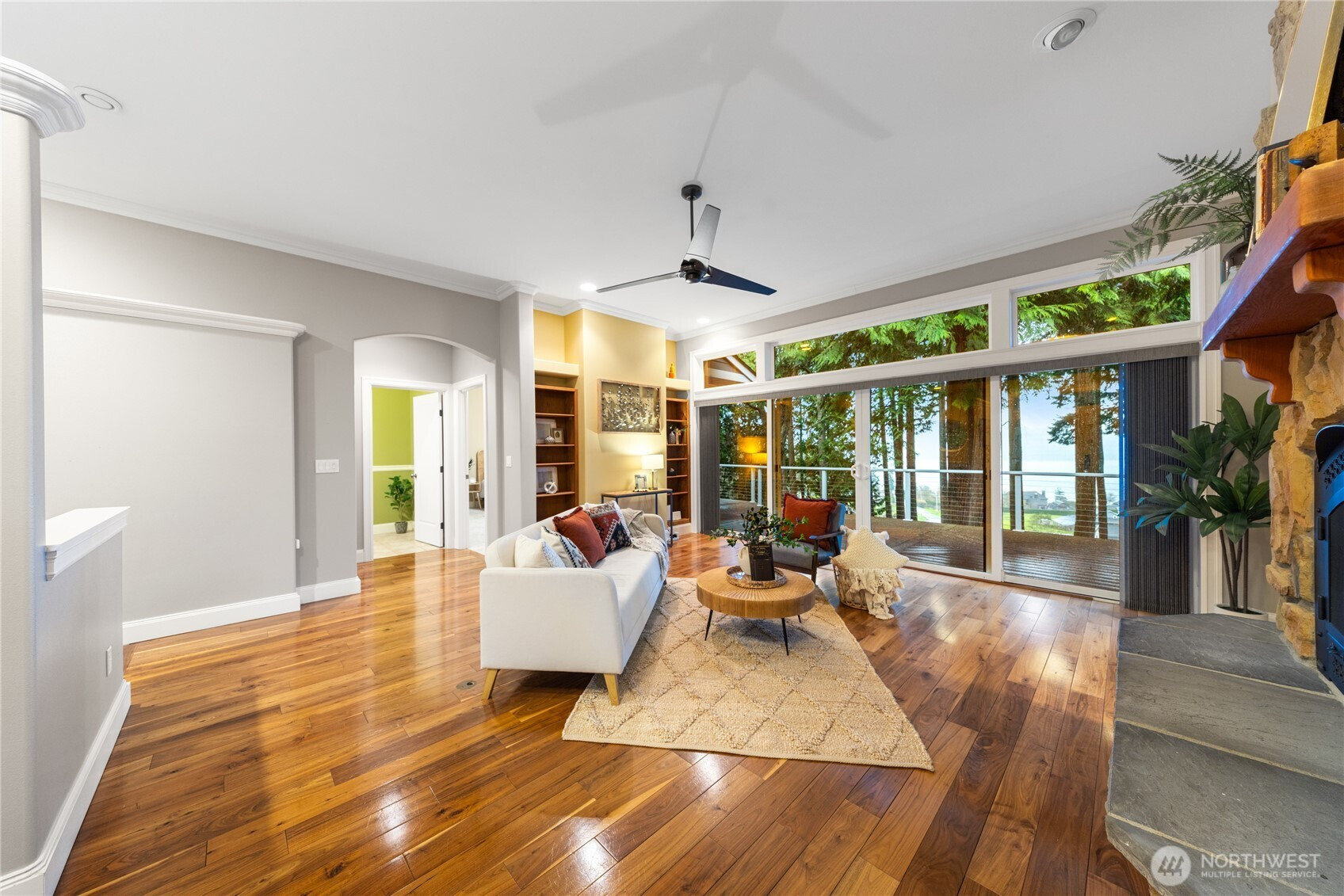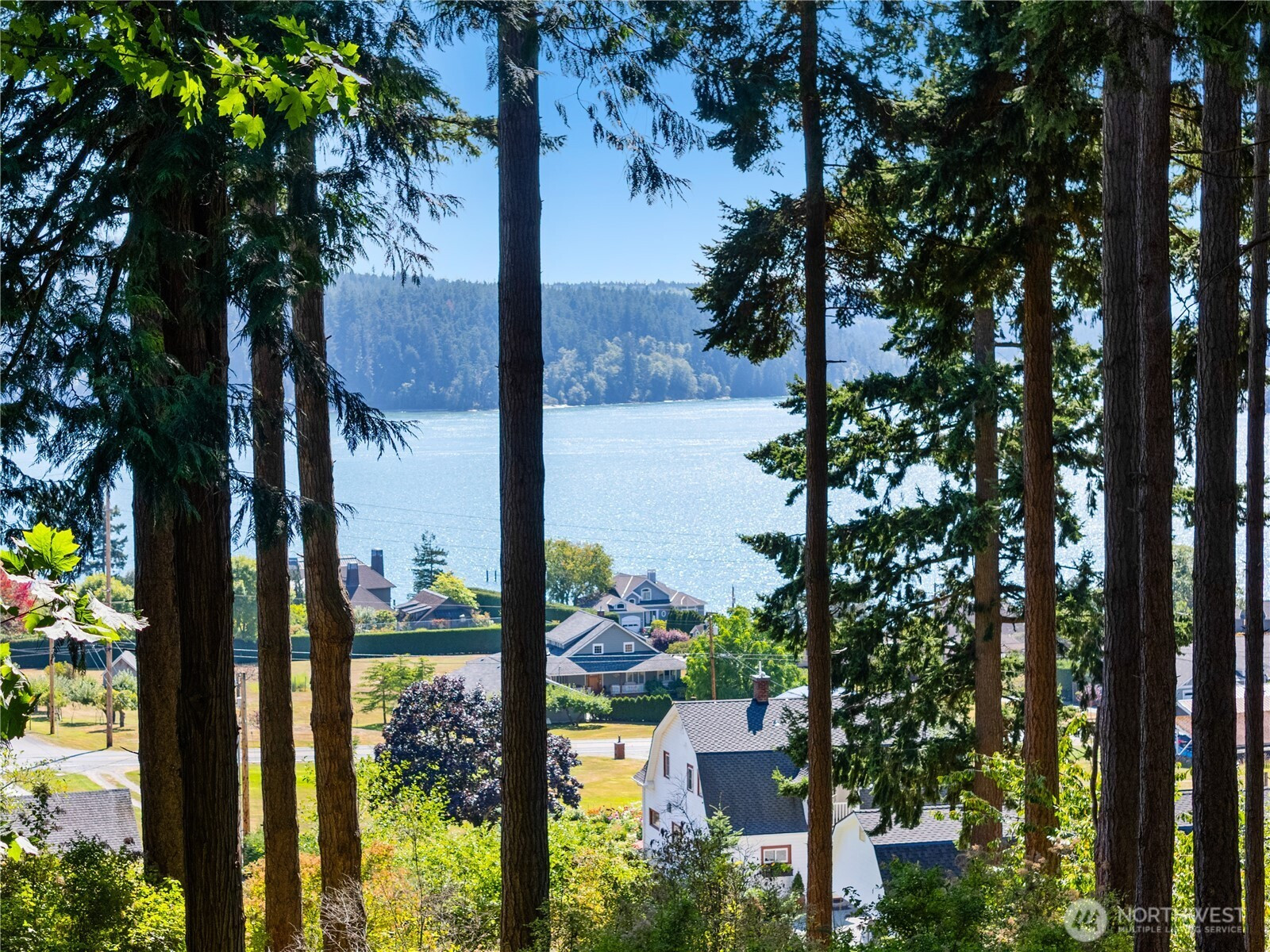 Set on over three private acres, this serene retreat captures sweeping views of the bay, mountains, sound, and strait. The main level welcomes you with a spacious living room anchored by a striking stone fireplace and sliding doors that open to an expansive view deck. The kitchen and dining area are designed to frame the water, featuring an island ideal for gathering and everyday living. The primary suite is a true sanctuary with its own brick fireplace, bay windows, walk-in closet, and spa-inspired ensuite with double vanity, soaking tub, and separate shower. Laundry on both levels adds everyday ease. The lower level offers a second living space that flows seamlessly to a secluded patio, perfect for relaxing or hosting guests. Outside, lush landscaping surrounds the home, while a substantial three-car garage with extra workspace provides room for storage, hobbies, or projects. This is privacy, comfort, and connection—thoughtfully woven into one exceptional property.