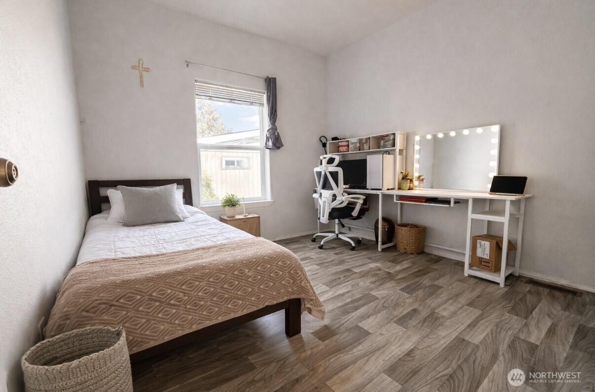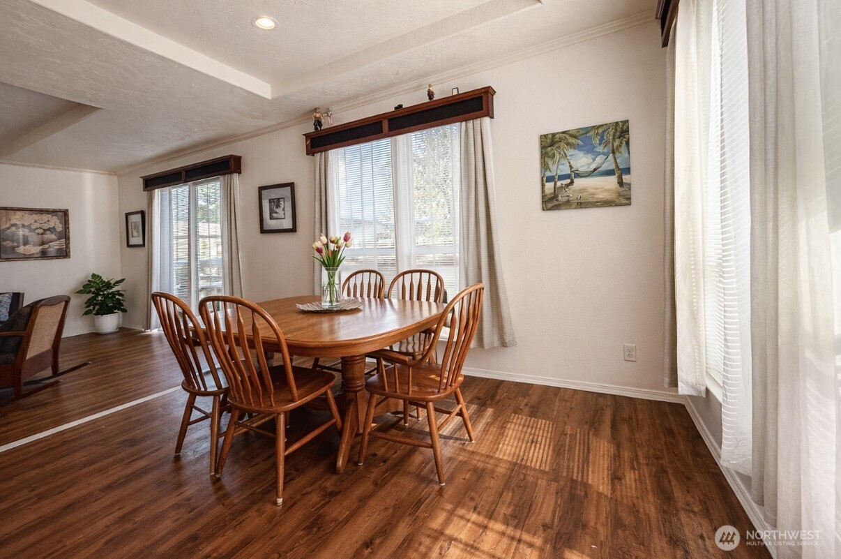 Well-maintained 3-bedroom, 2-bath home located in Valley View Mobile Home Court featuring an open-concept floor plan with vaulted ceilings and abundant natural light. Spacious living area flows seamlessly into the dining space and kitchen, complete with a breakfast bar, ample cabinetry, and tiled backsplash. Functional layout offers two secondary bedrooms and a full bath off the main hallway, along with a conveniently located utility room with exterior access. Private primary suite positioned at the end of the hall includes an ensuite bath with soaking tub, vanity, and linen storage. A great opportunity for comfortable and easy living!