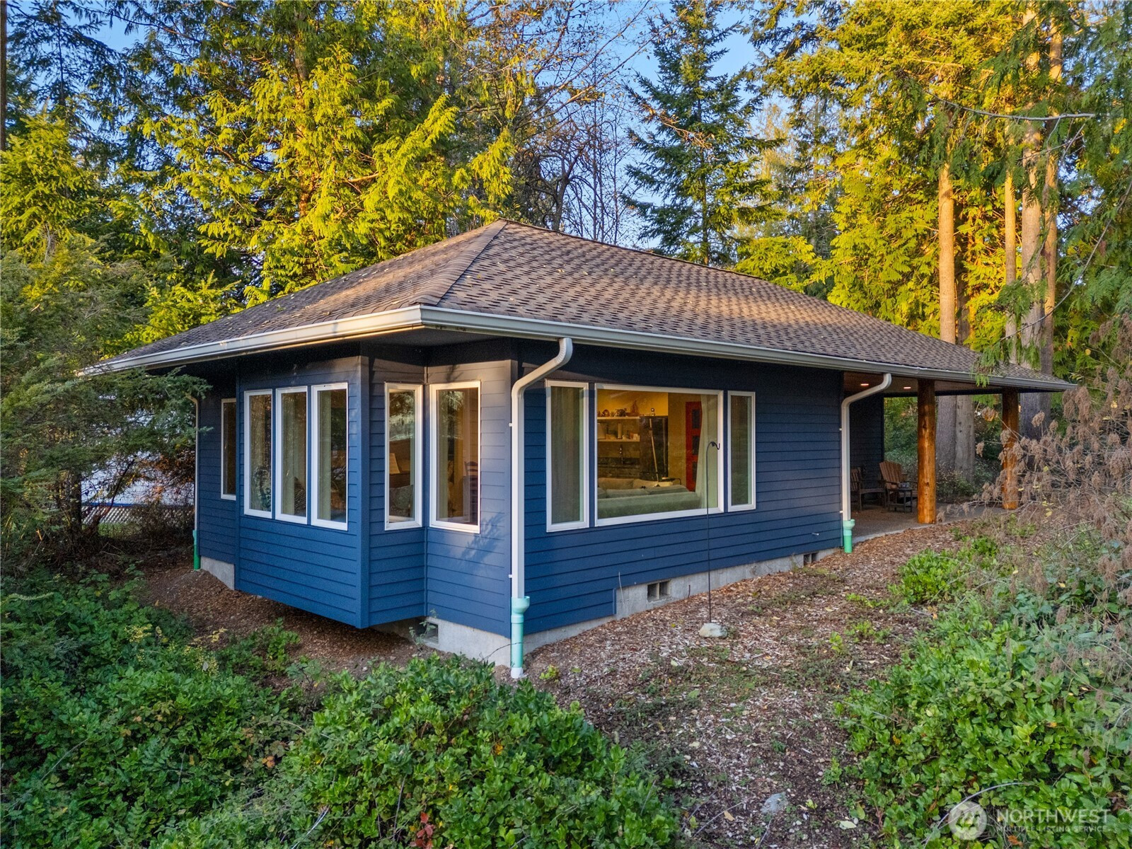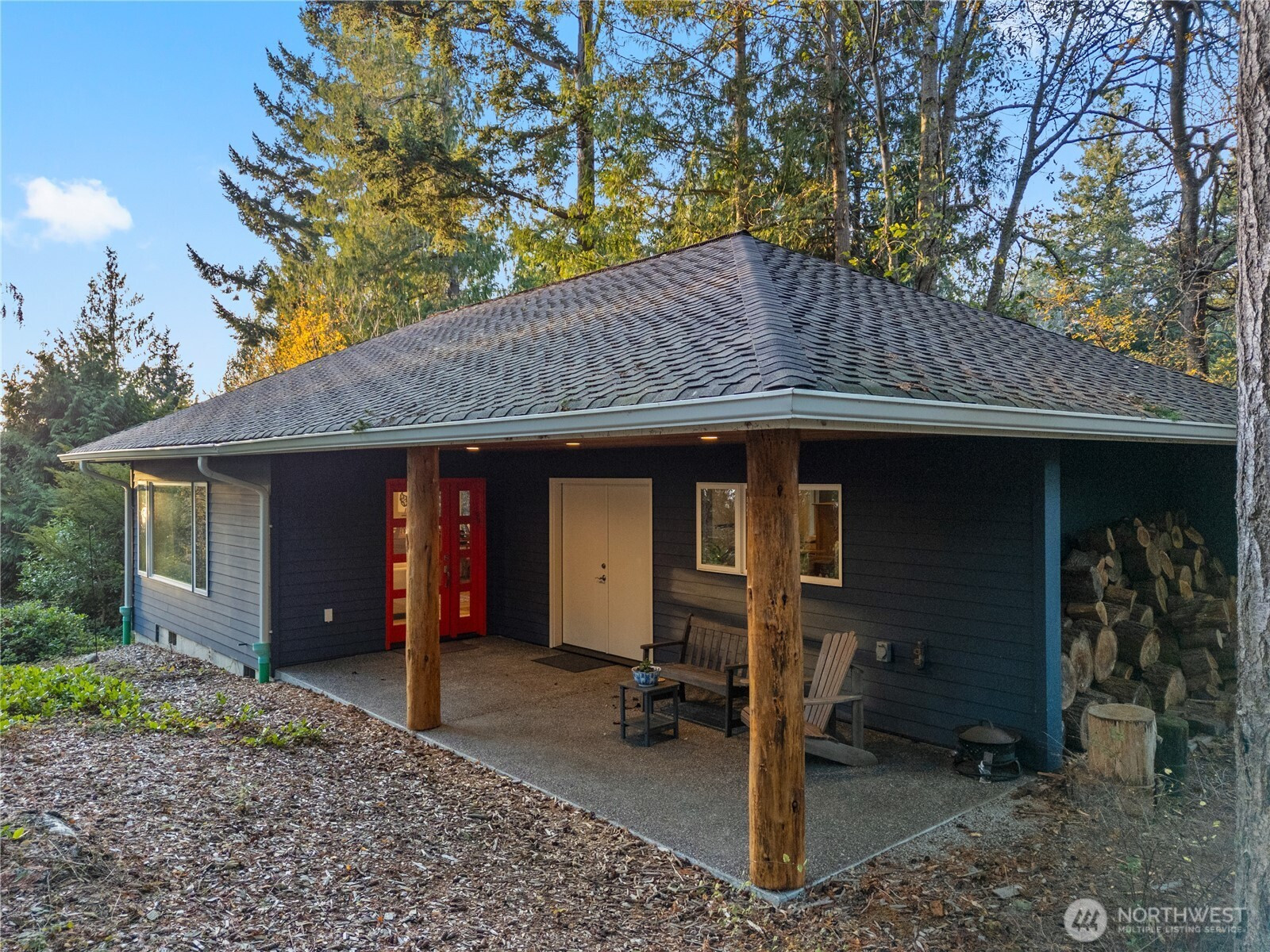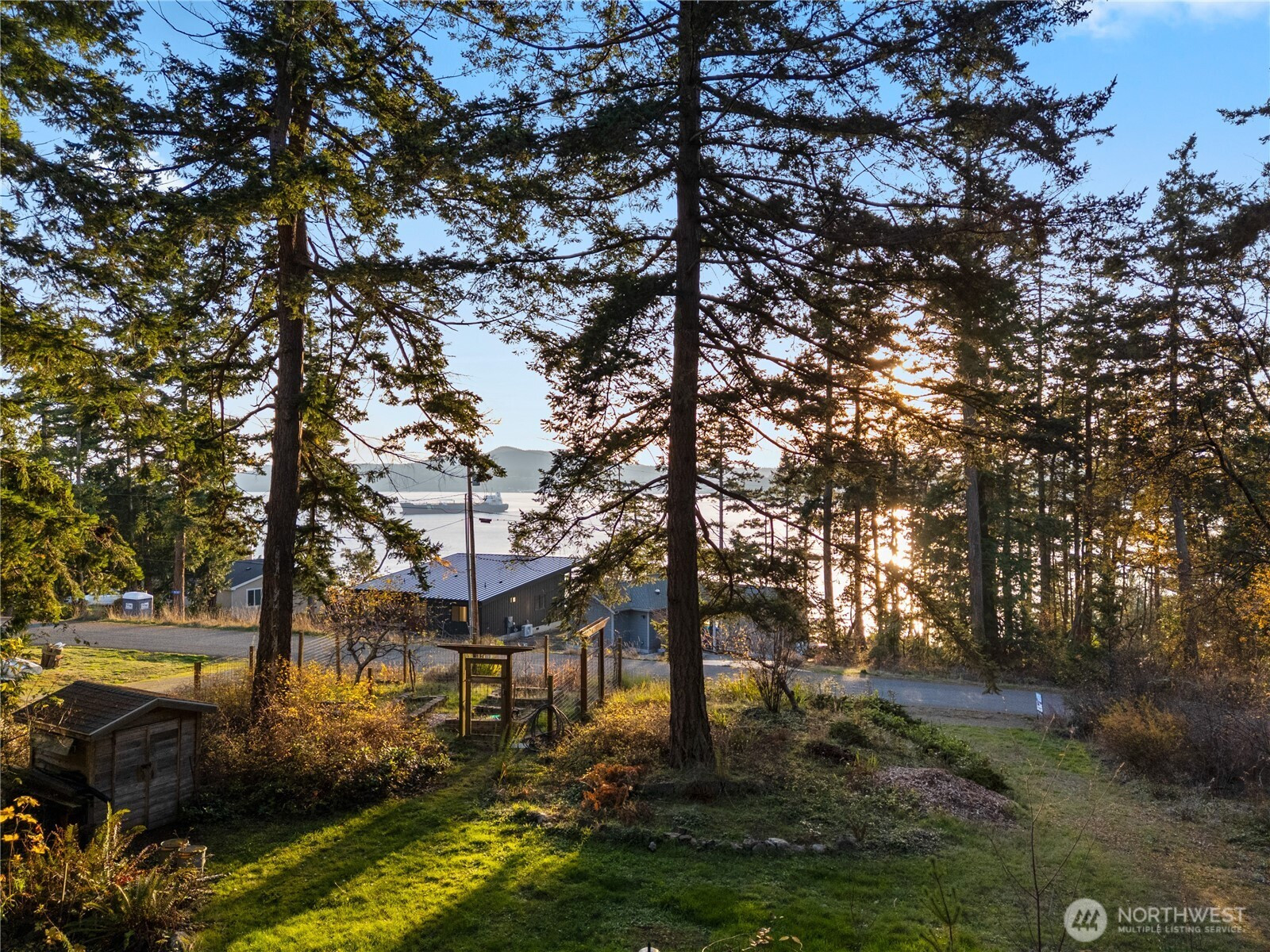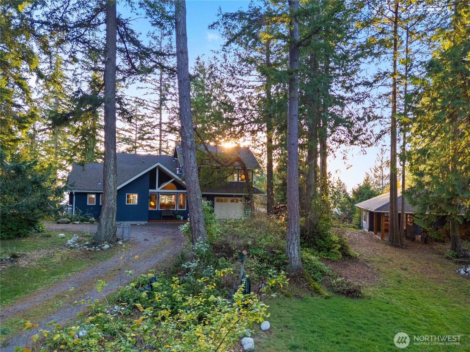 Welcome to your treetop hideaway with water views drifting through the trees. You’ll find two primaries (main + upper), a dreamy guest studio, cozy library, large storage room, and a 10,000 gallon rain-catchment system for garden watering (or for the home with the installed filtration) alongside the community water supply. Upstairs also offers an extra bedroom/office for work or guests. Relax in the sauna, stroll through native landscaping, or tend your fenced veggie garden. The loop driveway, tons of parking, automatic backup generator, and bonus lot with water share and 2-bedroom septic open the door to future plans. All just minutes from the 5-minute ferry to Anacortes and the stunning Guemes Mountain trail with panoramic island views.