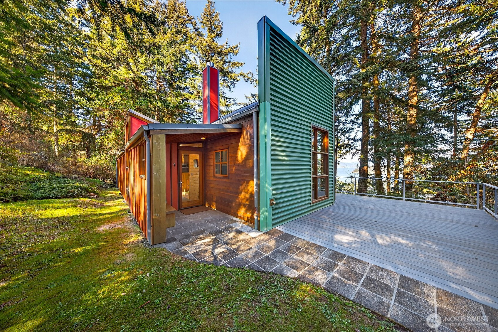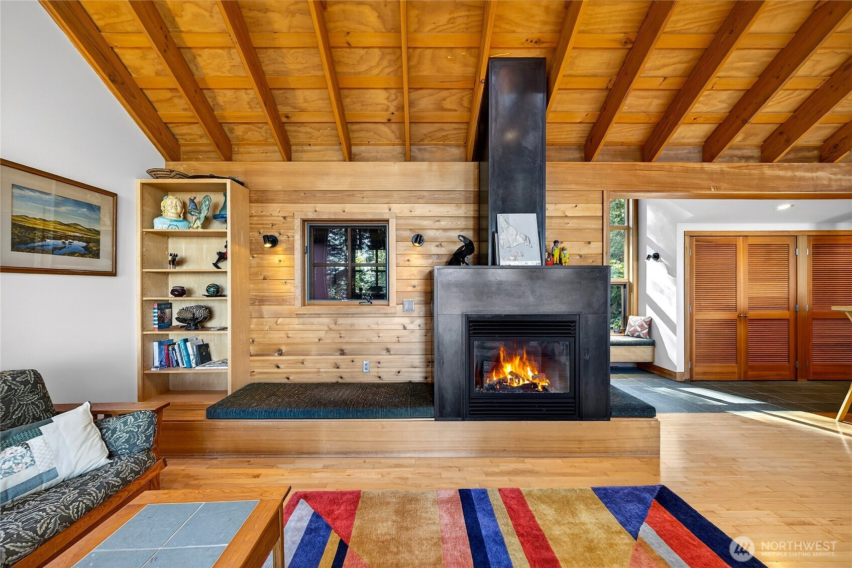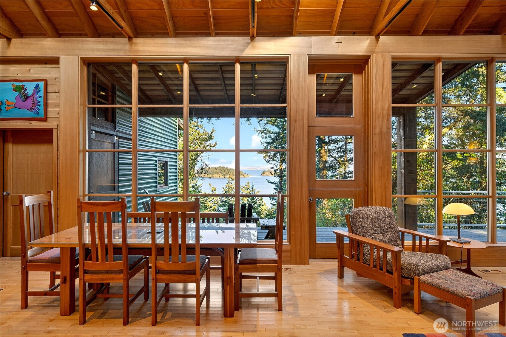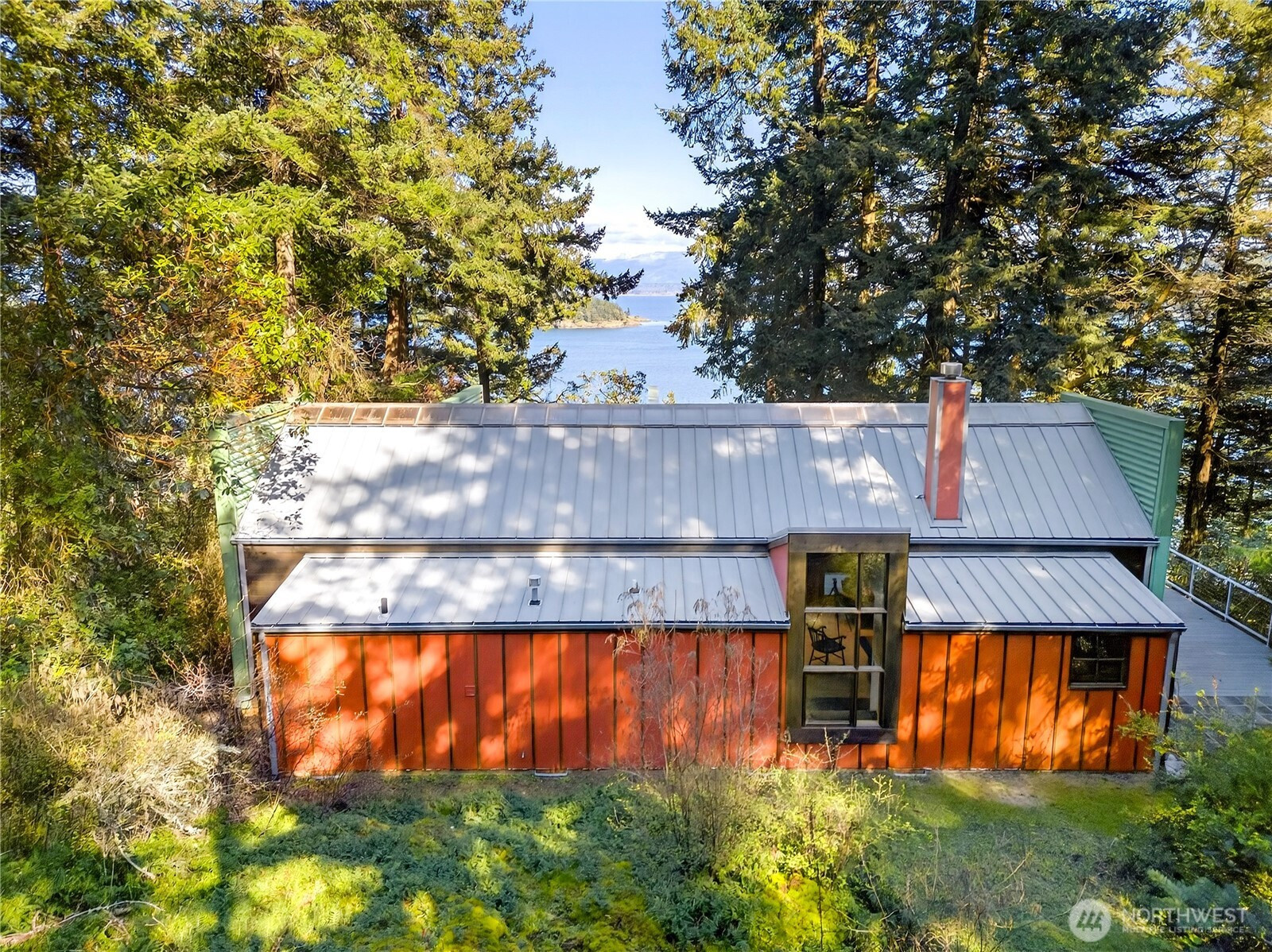 Set above the shoreline on more than an acre of medium-bank waterfront, this Northwest contemporary one-level home frames stunning views of Huckleberry and Saddlebag Islands, Padilla Bay, and Cascade Mountains.Designed by renowned architect Robert Hull, this coastal retreat embraces natural light and scenery with expansive windows and a continuous skylight running along the roof peak. The great room features a vaulted ceiling, hardwood floors, and a cozy fireplace—an inviting space that frames the ever-changing island and mountain vistas.A well-planned hallway offers abundant storage along with the forced-air furnace and hot water heater. The guest bedroom includes a Murphy bed, ensuite bath, and a loft area ideal for sleeping or storage.The exterior blends durability and Northwest character with a metal roof and a mix of metal and cedar siding. A path leads to a serene viewing area—perfect for taking in the bay, islands and wildlife. This community has beach rights to three coves. One of which has a boat ramp.Enjoy the ease of island living with the convenience of a 7-minute ferry ride from Anacortes