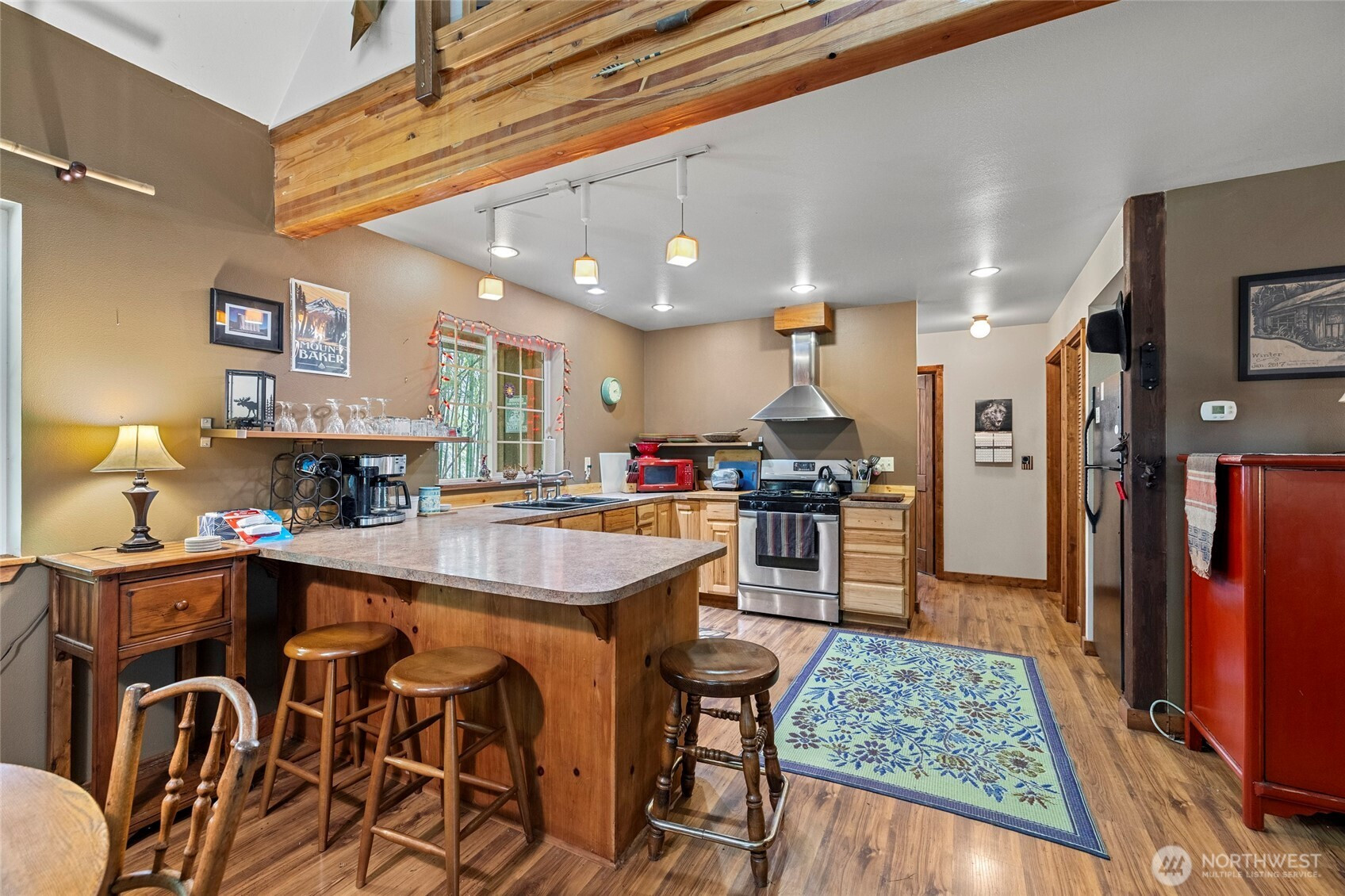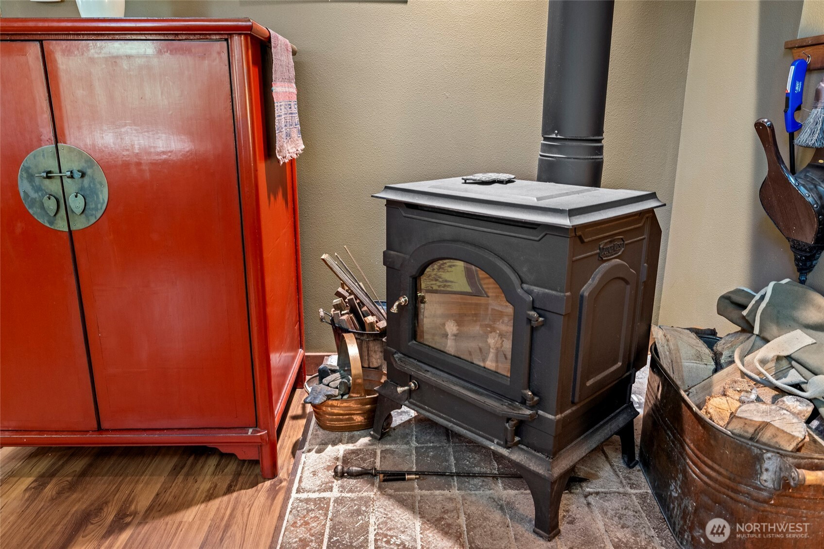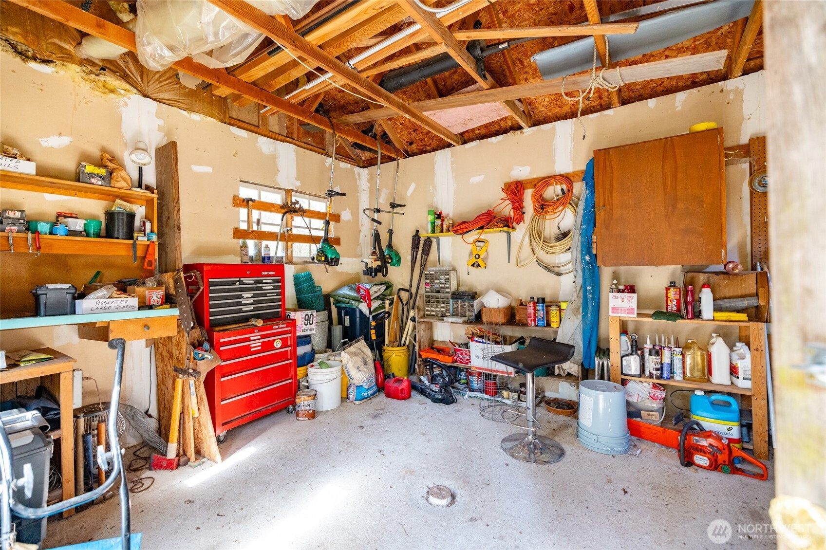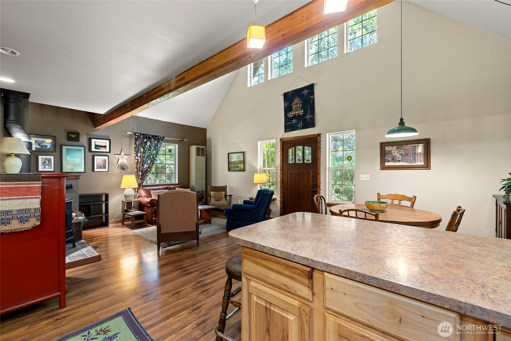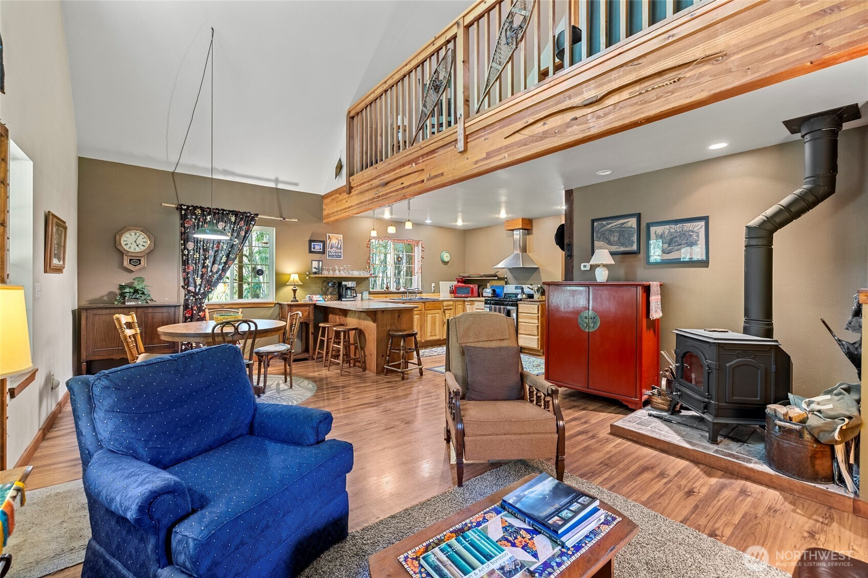 Experience the beauty of nature tucked away in the woods, this lovely 2-bed, 1.5 bath cabin is perfect for weekend getaways or a quiet place to call home. Enjoy the spacious wrap around porch, perfect for morning coffee or unwind inside where the warmth of the wood and thoughtfully decorated cabin create a cozy retreat. The soaring ceilings and windows create an open natural feel. Multiple outbuildings include a 3-stall pole building, ideal for vehicles, projects or storage, tool shed, woodshed, a small cottage, plus the original cabin is still standing with loads of potential with some TLC. Garden space galore, fruit trees, trails, beautifully wooded and open grassy spaces complete this lovely 5-acre property. The possibilities are endless. Located on a private gated drive you are minutes from town where you will have tranquility and convenience. Partially furnished. New roof in 2017 & new drainfield in 2020. Your serene, wooded escape awaits!