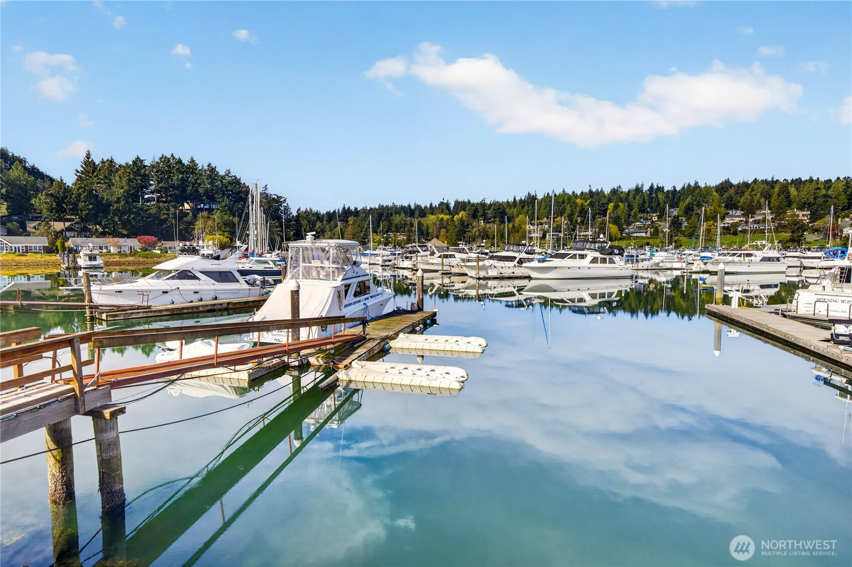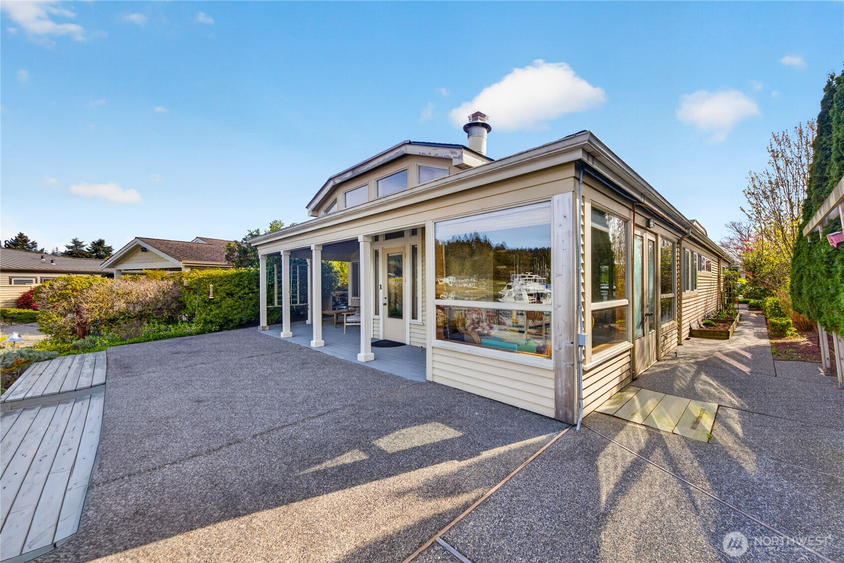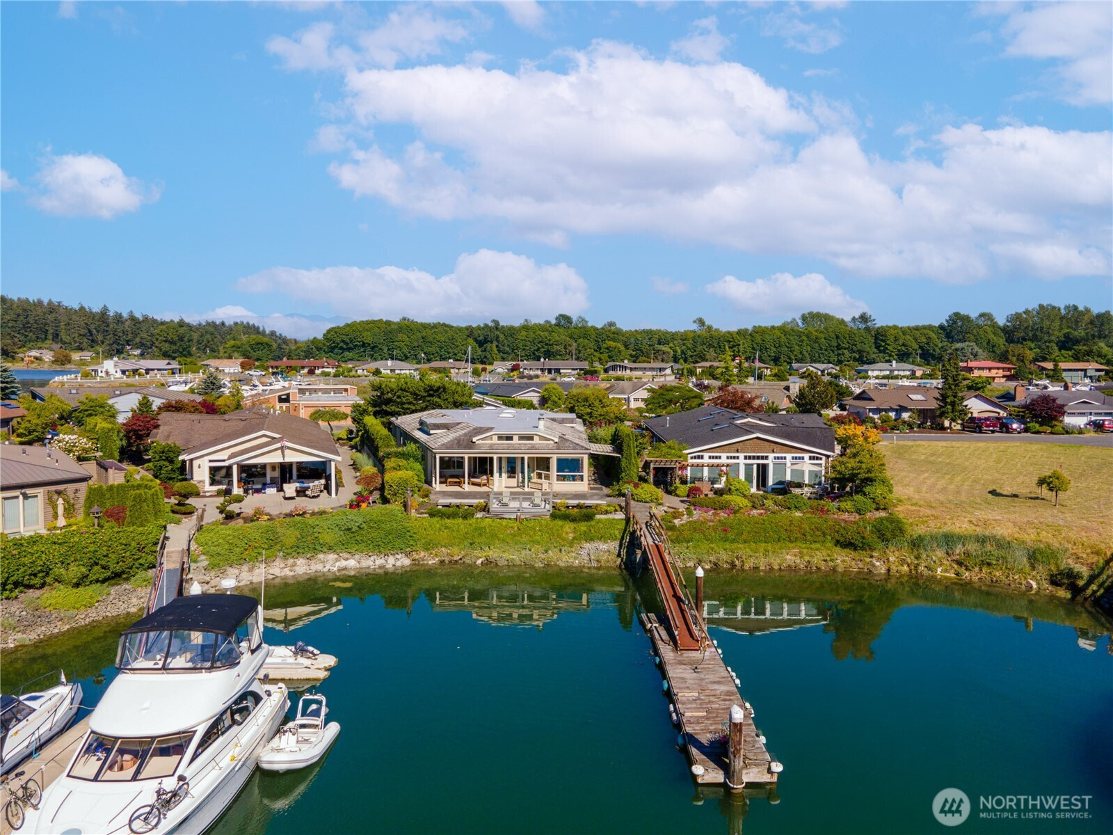 Welcome home to elevated waterfront living in the heart of Shelter Bay, where every detail is designed to capture the beauty of the coastal lifestyle. This stunning residence features a shared 40-foot dock, offering effortless access to the water and endless days of boating, crabbing, and sunset cruising right from your backyard. Inside, the open-concept design invites natural light to pour in, seamlessly connecting the living, dining, and gourmet kitchen spaces. Outfitted with high-end appliances and refined finishes, the kitchen is both a showpiece and a place to gather. The primary suite is a true retreat, complete with a cozy fireplace, a peaceful sitting area, and a spa-inspired ensuite featuring a luxurious soaking tub—your own private escape at the end of the day. Take in sweeping waterfront views from your dock, entertain with ease, or simply unwind in a setting that feels like a year-round getaway. Located in the sought-after Shelter Bay community on leased land, residents enjoy access to a marina, private beach, clubhouse, sports courts, and more—bringing together lifestyle, location, and luxury in one unforgettable property.