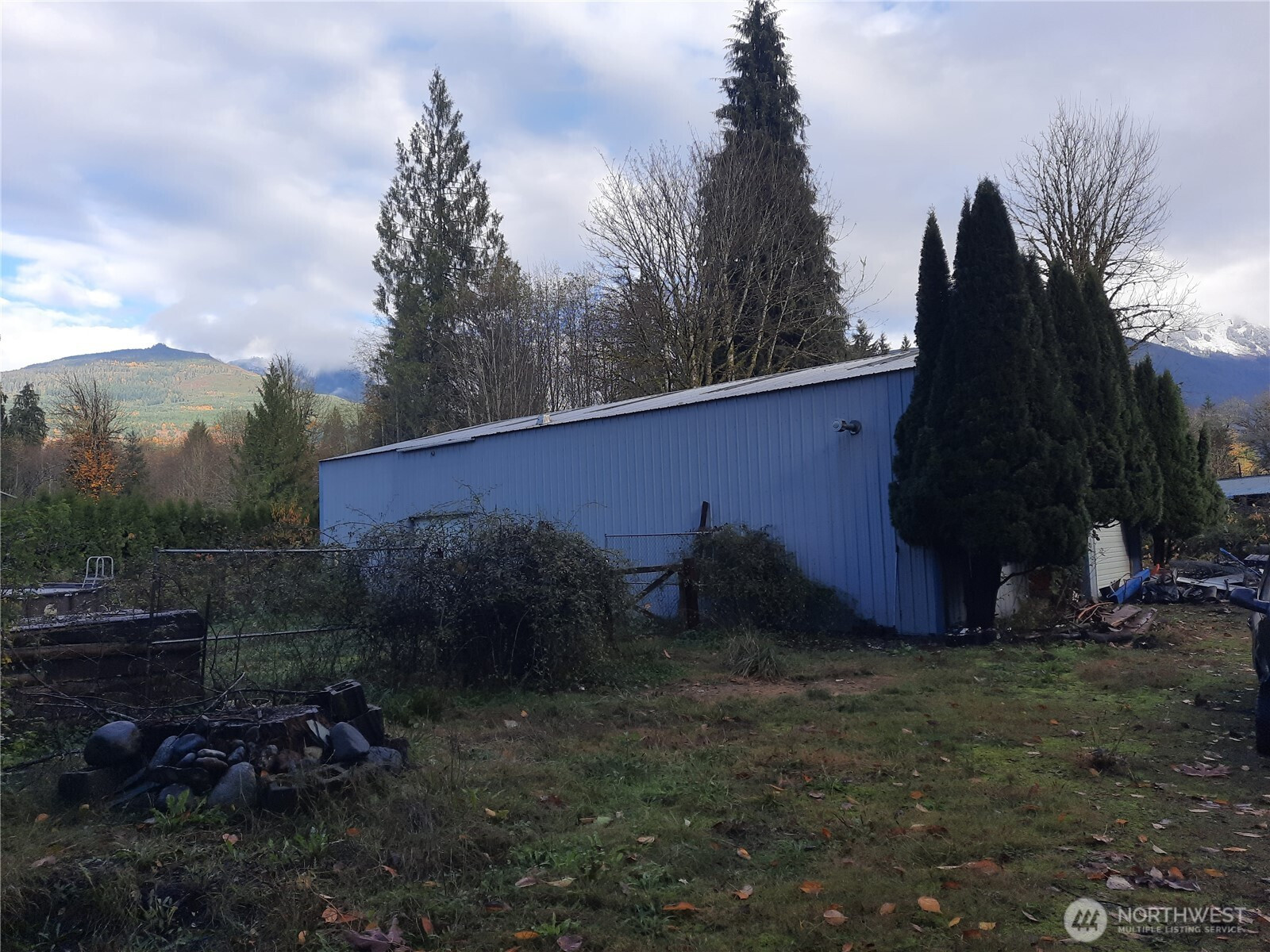 Excellent opportunity to make this fixer shine. 2008 manufactured home with 2 bedrooms and a large den/office on shy one acre double lot with metal roof, huge shop, garden space, above ground pool, and views of Mt. Sauk. Flooring has been removed, ready for your renovation choice. Small leak in kitchen recently repaired. Large shop (2400 sq ft, excluding loft) has 3 garage doors, a spacious loft, 2 overhead propane heaters and a half bathroom.