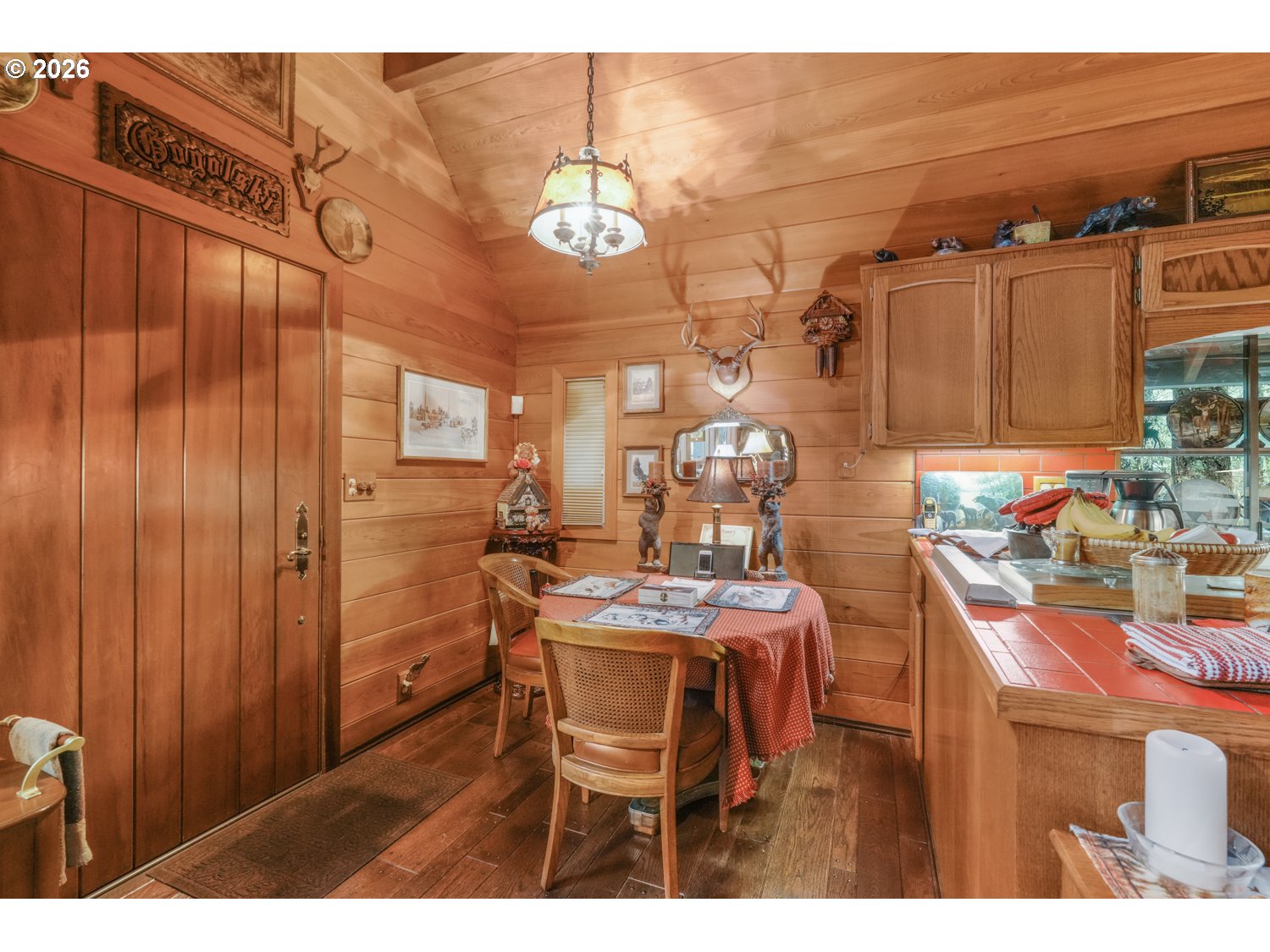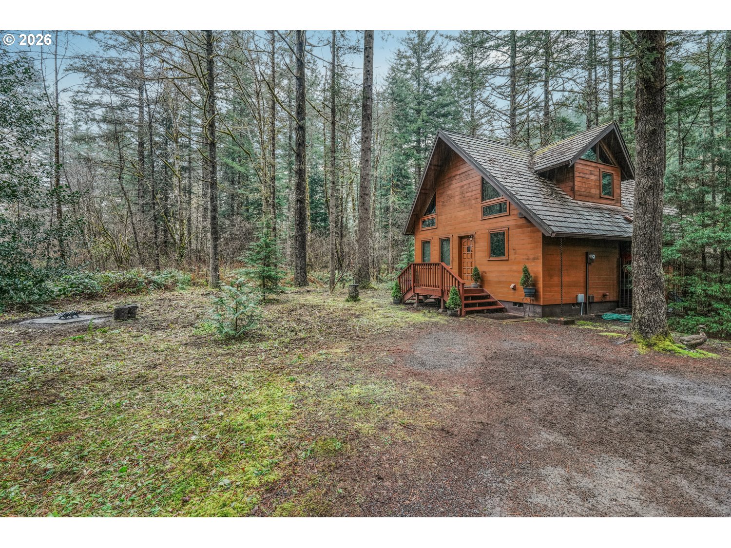 Escape to your own private cabin in the woods, surrounded by towering trees, natural beauty, and the peaceful sound of a river running through the property which has 250 ft of river frontage. This charming retreat features upscale wood paneling, vaulted and beamed ceilings, and an inviting open-concept main living space designed to capture the true cabin feel. The great room showcases beautiful flooring, a stunning stone fireplace, and dramatic floor-to-ceiling windows that fill the home with natural light while framing serene forest views. The kitchen includes an eating area and direct access to a spacious 24x12 deck, perfect for indoor/outdoor entertaining or simply relaxing while watching wildlife and listening to the nearby river. The main level also offers a bedroom, full bathroom, convenient laundry area, and a large storage pantry. Upstairs you'll find a stunning primary suite featuring vaulted beamed ceilings and a private half bath, along with a versatile loft space ideal for a home office, reading nook, or additional living area. Outside, the secluded setting provides ultimate privacy with peaceful forest surroundings. A tool shed with covered firewood storage adds convenience and functionality. Spend your evenings on the deck enjoying the sights and sounds of nature in this tranquil setting. All of this just 30 minutes to dining and shopping and approximately 40 minutes to PDX, offering the perfect balance of peaceful retreat and accessibility.