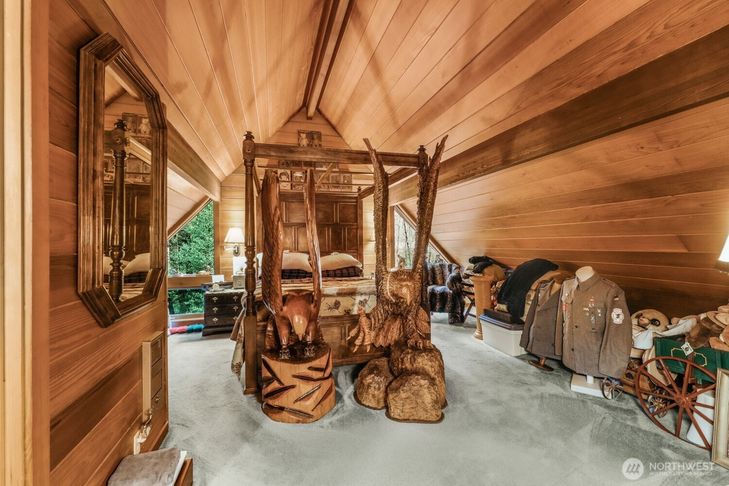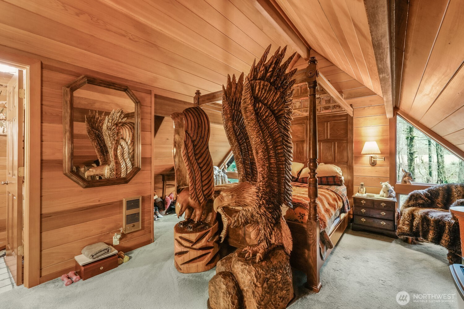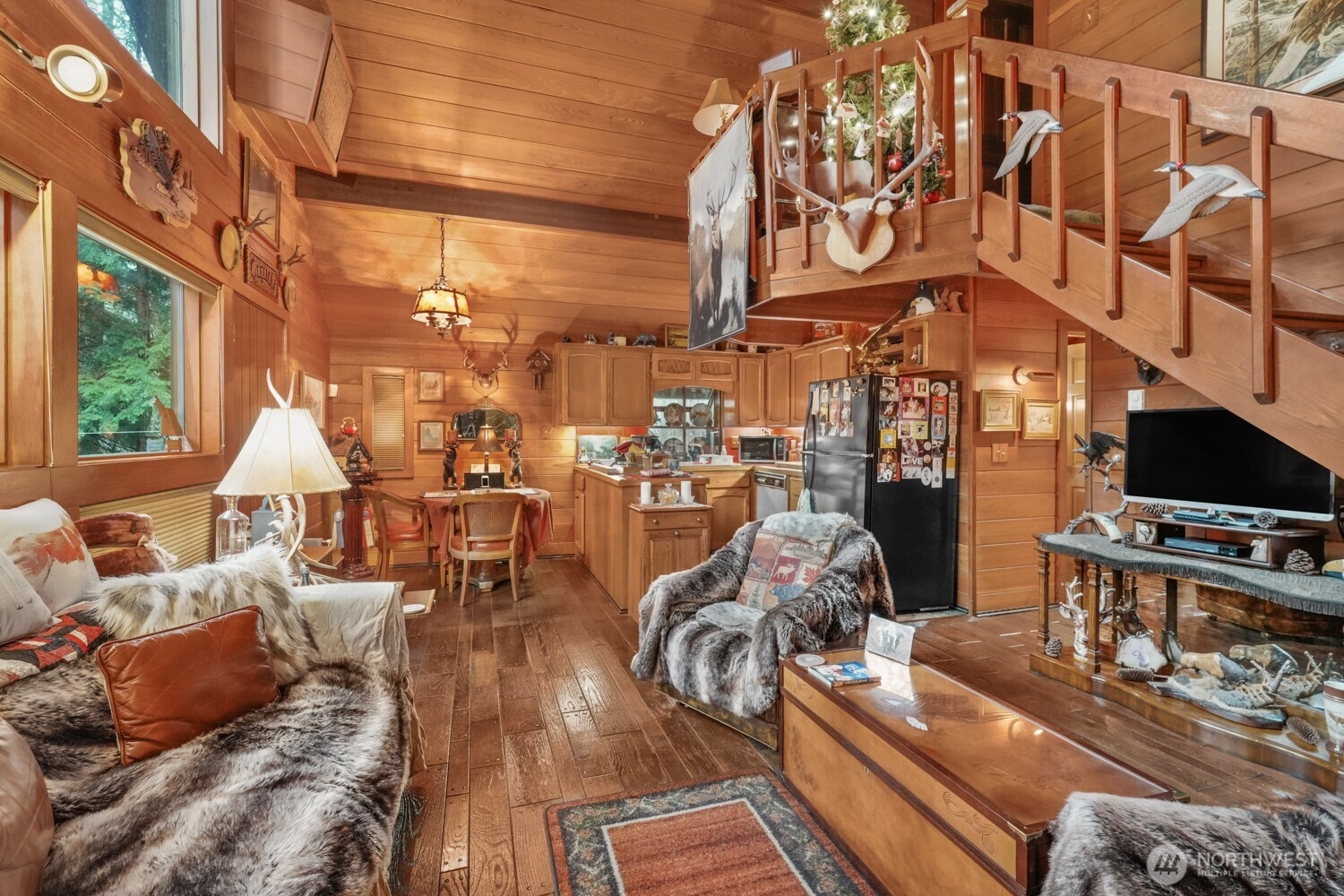 Escape to your own private cabin in the woods, surrounded by towering trees, natural beauty, and the peaceful sound of a river running through the property which has 250 ft of river frontage. This charming retreat features upscale wood paneling, vaulted and beamed ceilings, and an inviting open-concept main living space designed to capture the true cabin feel. The great room showcases beautiful flooring, a stunning stone fireplace, and dramatic floor-to-ceiling windows that fill the home with natural light while framing serene forest views. The kitchen includes an eating area and direct access to a spacious 24x12 deck, perfect for indoor/outdoor entertaining or simply relaxing while watching wildlife and listening to the nearby river. The main level also offers a bedroom, full bathroom, convenient laundry area, and a large storage pantry. Upstairs you'll find a stunning primary suite featuring vaulted beamed ceilings and a private half bath, along with a versatile loft space ideal for a home office, reading nook, or additional living area. Outside, the secluded setting provides ultimate privacy with peaceful forest surroundings. A tool shed with covered firewood storage adds convenience and functionality. Spend your evenings on the deck enjoying the sights and sounds of nature in this tranquil setting. All of this just 30 minutes to dining and shopping and approximately 40 minutes to PDX, offering the perfect balance of peaceful retreat and accessibility.