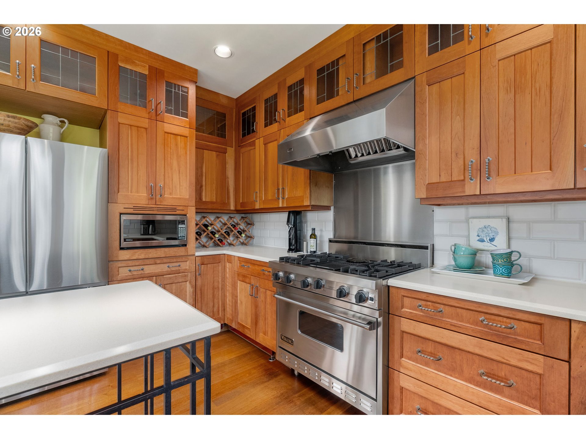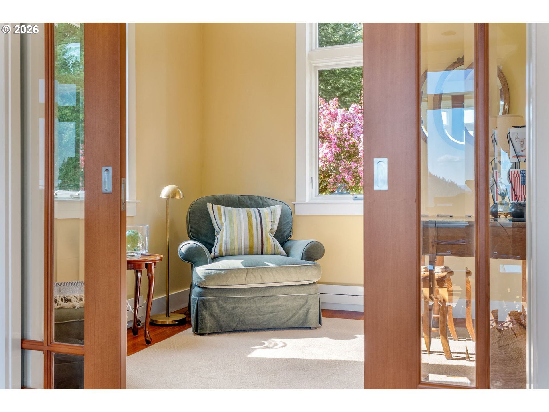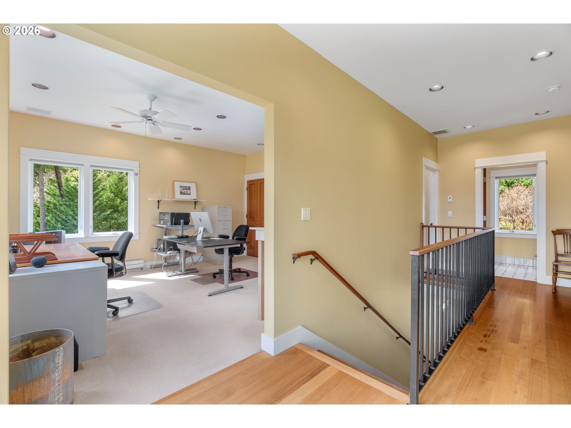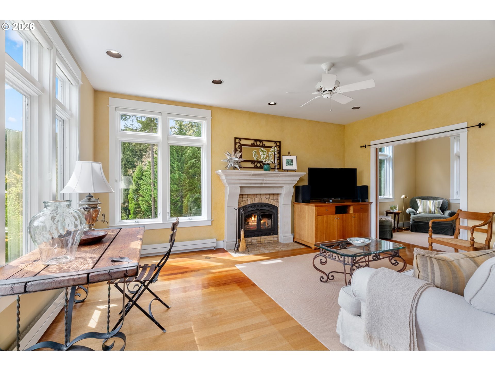 Set on a gently elevated knoll in Upper White Salmon, this architect-designed home offers quality craftsmanship in a private, tranquil Gorge setting. Situated on nearly five landscaped acres of open meadow and mature trees, the property provides a peaceful, park-like environment with seasonal color and full irrigation for ease of maintenance. The one-owner, 3 bedroom + den, 3 bath home reflects thoughtful design and meticulous care throughout. The light-filled interior features 9-foot ceilings, Merbau tropical hardwood floors, and Pella wood casement windows that capture natural light and surrounding views. The main level includes a gourmet kitchen with Viking range and hood, an open living area with fireplace, and an office or den with Simpson fir and glass pocket doors. A mudroom with laundry, utility sink, exterior access, and a full bath completes the main level. Upstairs, the primary suite includes a cast iron soaking tub and walk-in shower, along with two additional bedrooms, all finished with wool carpeting. Bathrooms feature Ann Sacks tile, Porcher fixtures, and radiant towel warmers. An upstairs balcony offers an elevated vantage point to take in the surrounding landscape and beauty. Outdoor living is well integrated with a covered deck and a fully screened east-facing porch for year-round enjoyment. A detached two-car garage/barn provides additional storage and workspace. Built for energy efficiency with solid insulation and passive solar design. The home is equipped with a whole-house Generac standby generator with automatic transfer switch and WiFi capability. 172 Upper Lakeview Rd is a place to settle in, stretch out, and take in the quiet rhythm of the Gorge.