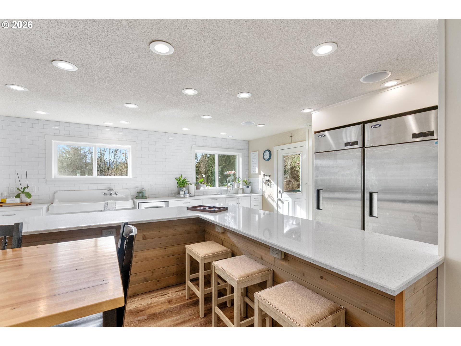 Your Gorge Homestead awaits — Remodeled farmhouse on 2 private acres with greenhouse, gardens, orchard, shop, a massive kitchen and a wraparound porch just minutes from downtown Stevenson. The heart of the home is a stunning open-concept kitchen designed for gathering, featuring a large island, quartz countertops, farmhouse sink, illuminated cabinetry, and a butler’s pantry, all flowing into the dining area and living room. The main level includes a mudroom, spacious laundry room with water closet, full bathroom, and bedroom with walk-in closet currently used as an office. Upstairs offers three additional bedrooms with walk-in closets, a flexible family room or potential fifth bedroom, and a full bathroom. Radiant floor heating supported by a wood-burning boiler keeps the home comfortable year-round. Outside, enjoy the lifestyle this property offers with a wraparound covered porch, gated entry, detached shop/garage, 70x35 greenhouse, chicken coop, small livestock barn, seasonal pond, and creek along the property edge. Established orchard with peach, cherry, plum, pear, fig, and apple trees, raised garden beds with irrigation, and ample parking create the ideal Gorge hobby farm or homestead retreat, just minutes from downtown, hiking trails, and Columbia River recreation.