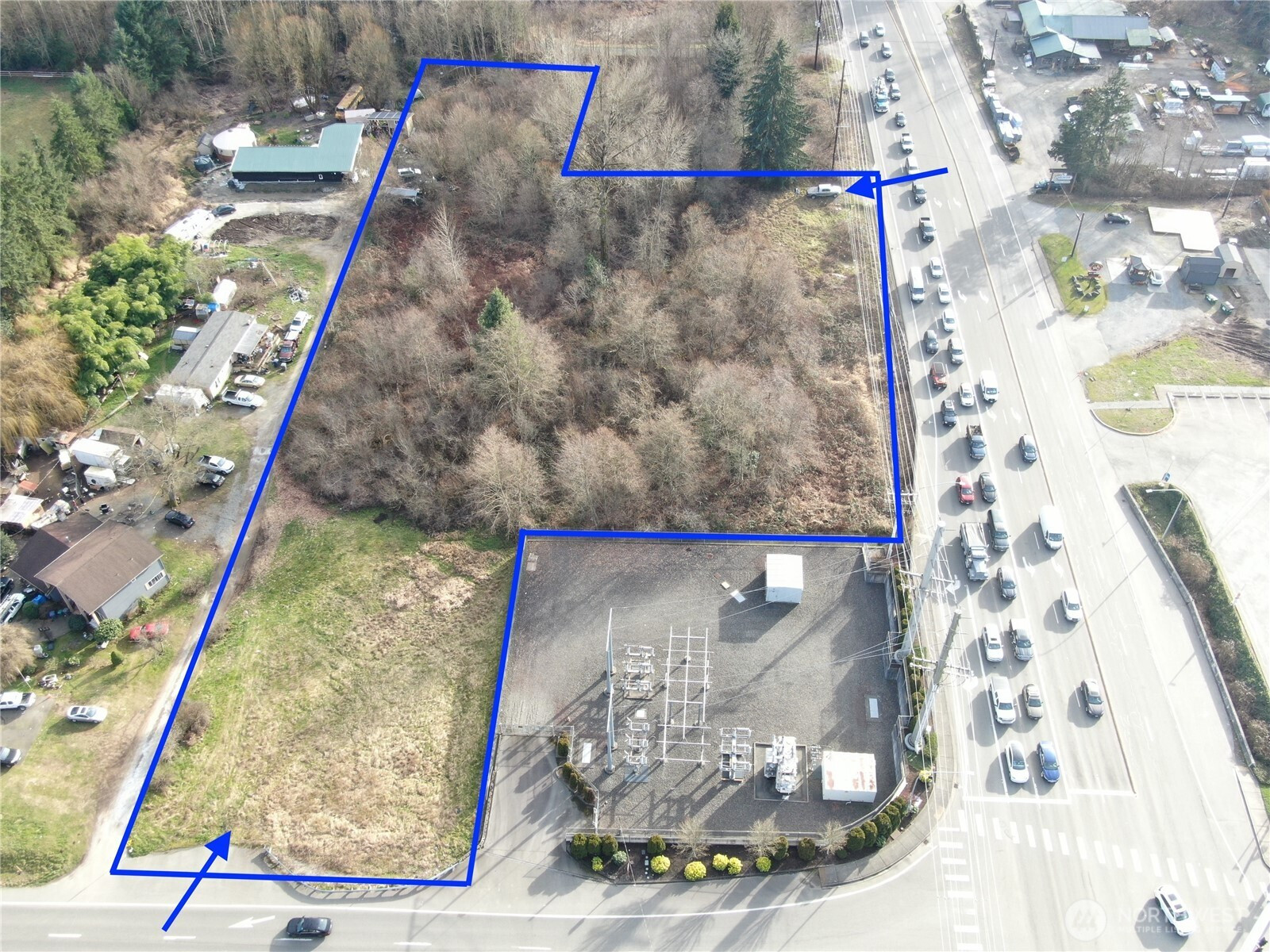 Prime commercial opportunity at Turners Corner in one of Woodinville’s most traveled corridors. Zoned RB & positioned at the signalized intersection of Highway 9 AND Highway 524 (Maltby Road), this 2.73-acre parcel offers outstanding visibility to over 45,000 vehicles per day. Ideal for an espresso stand, food trucks, equipment storage, contractor storage yard, fleet parking, RV/boat storage, modular office, billboard placement, cell tower site, small retail structure, landscape supply, seasonal sales lot & more. With separate driveway access from both highways, the site provides flexible ingress/egress & strong branding exposure from two major arterials—an increasingly rare advantage in this high-traffic location. A wetland study has been completed. While a majority of the land is impacted by wetlands, critical areas, & required setbacks, it is assumed that Snohomish Co. Reasonable Use provisions may allow for 4,000 square feet of improvements. Development beyond that is unknown, will require a full CAS. Water and power are available in the street. Located one mile from Costco & hwy 522, across from gas, grocery & more, the property benefits from consistent consumer activity and strong surrounding retail synergy. High-visibility commercial land with dual access, strong traffic counts, and flexible zoning—an exceptional opportunity for investors, operators, or long-term land holders. Buyer to verify all information to their satisfaction. Ideal Investment Opportunity!