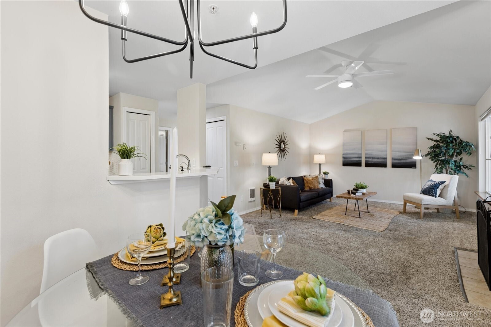 Welcome home to this beautifully updated top-floor condo! This turnkey unit features 2 Bed, 1 Bath, with vaulted ceilings and updated kitchen and bathroom with new washer and dryer in unit. The kitchen features white quartz countertops and upgraded stainless steel appliances and sink. The bathroom has been tastefully renovated with modern finishes including new shower, tile, and quartz counters. Newer carpet and laminate floors throughout. Don't miss the cozy wood burning fireplace. Pet-friendly condo community, no rental cap, w/ basketball court, playground, 2 assigned parking spots including a covered carport and visitor parking. HOA dues covers water, sewer and garbage. HOA recently replaced roof. Close to I-5, Boeing, Silver Lake, Transit Center and Park & Ride. Pre-inspected, ask agent for details.