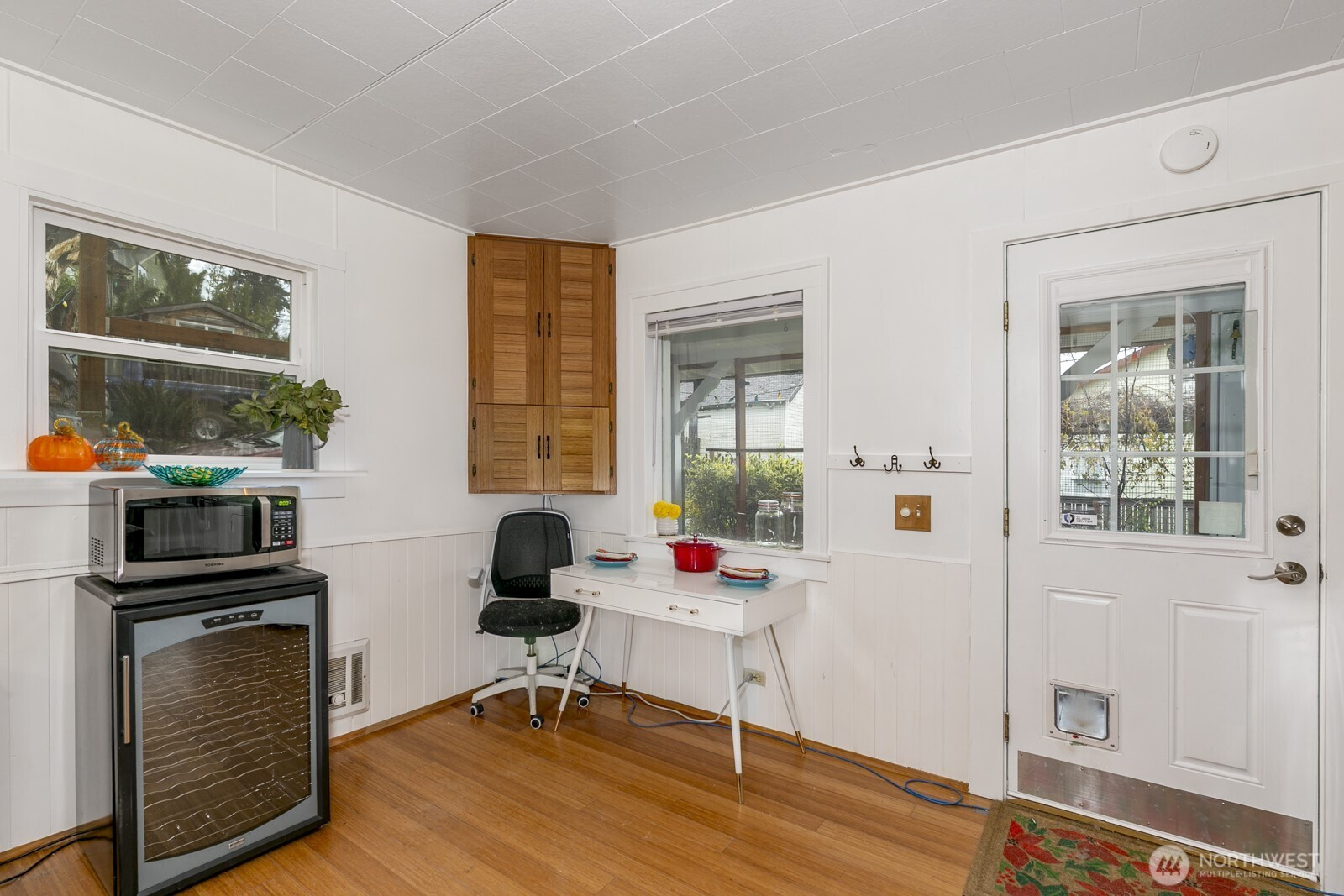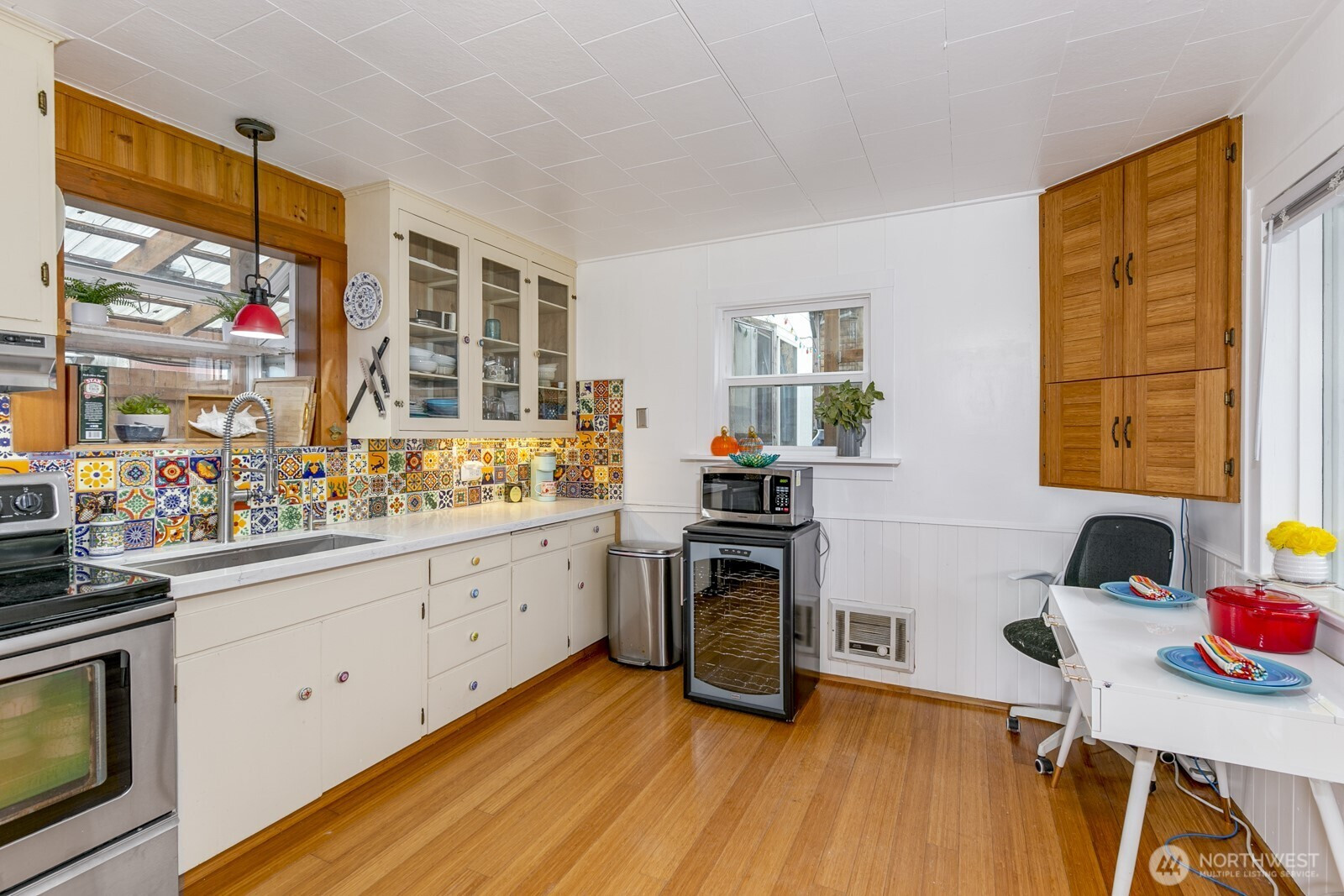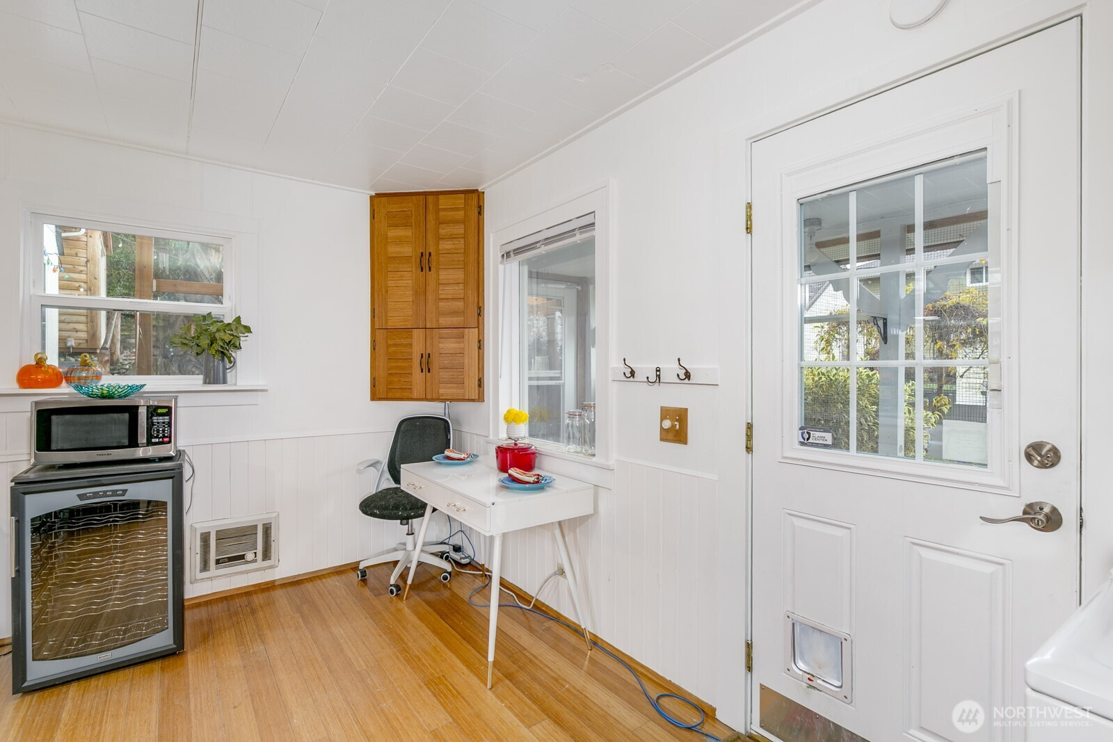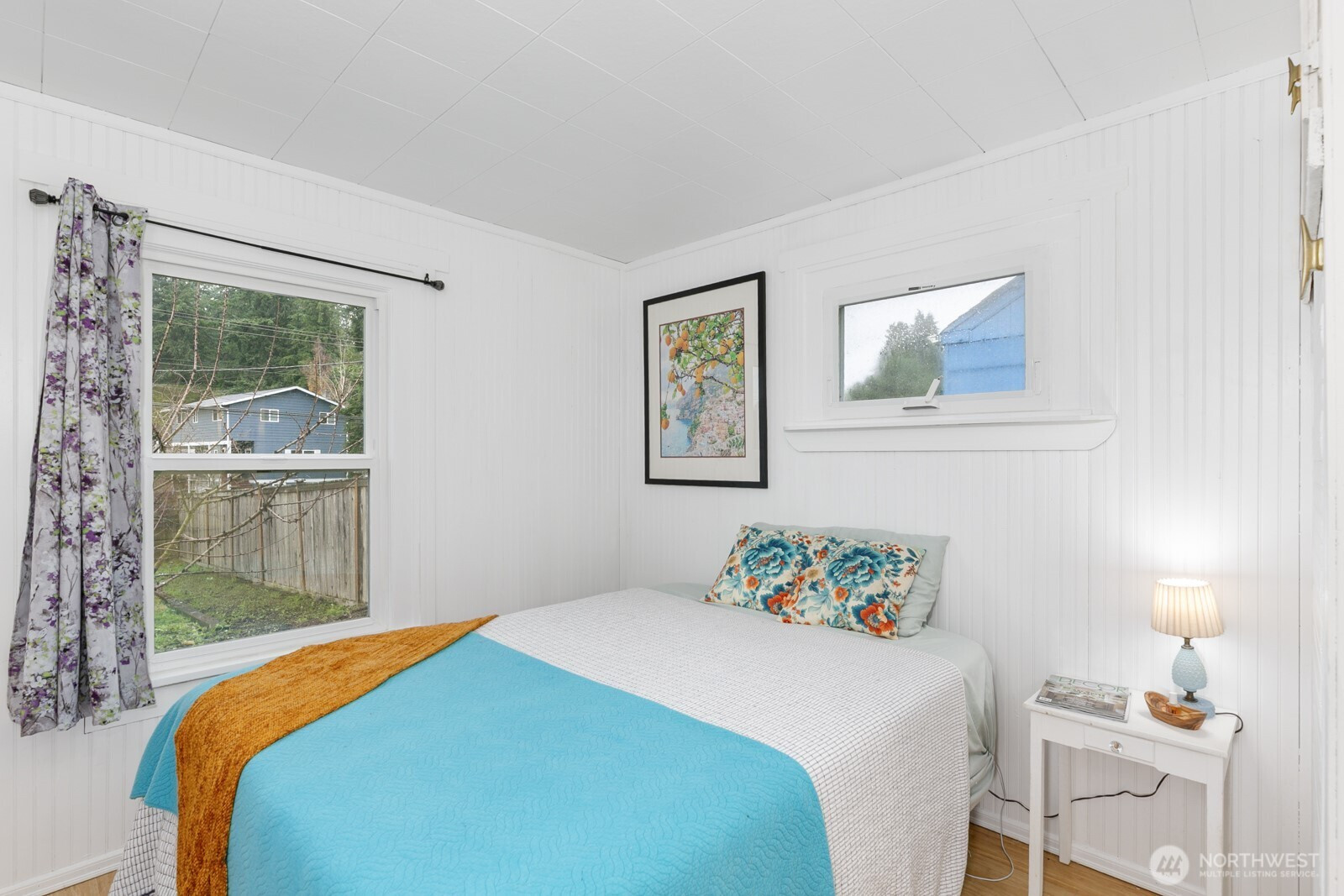 Charming 1BR cottage blends cozy character with modern updates in a convenient location near I-5, parks, shopping, hospitals and transit. Light, airy home with new flooring, refreshed kitchen and bath, quartz counters, farmhouse sink, updated appliances and thoughtful finishes. Enjoy Mount Baker and water views from the lush front garden with mature fruit trees. Four versatile outbuildings (three insulated with electricity) are perfect for office, studio, gym, so many possibilities. Two parking spaces plus shared drive. New washer stays. A peaceful retreat with room to work, create and grow.