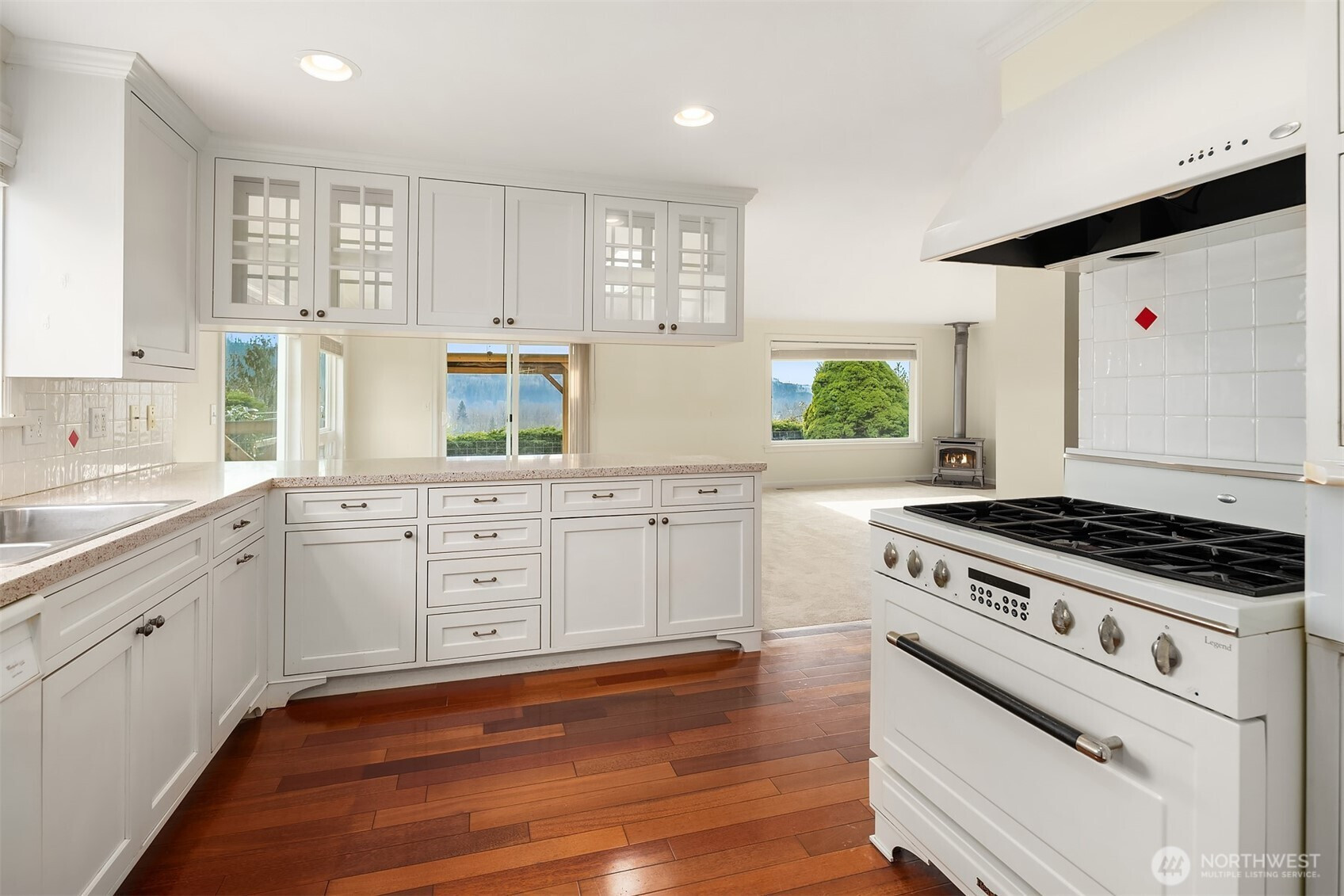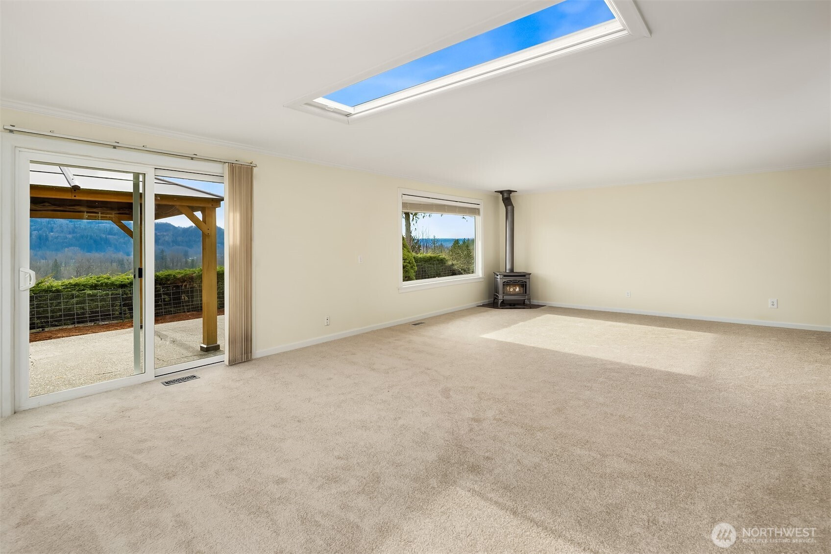 Sweeping mountain and valley views, main level living, quiet street location just minutes from downtown Monroe! This well-maintained four-bedroom, two-bathroom home boasts new carpeting, paint and hardwood flooring throughout. Spacious living room is bright and open complete with skylight and cozy free-standing gas stove. Beautiful kitchen features 19th century style Heartland six-burner gas stove and warming tray. Separate dining room with ample space for all your social gatherings. Large primary bedroom with three closets and primary bathroom. Exterior boasts professional landscaping and oversized detached 1-car garage with power and sufficient room for a large shop. Two utility outbuildings, both with power and concrete flooring provide plenty of dry storage; the larger of which contains a work bench, shelving and an extra fridge + separate freezer. NEWER ROOF, forced-air gas heating, RV parking, gazebo and fenced back yard add to the tremendous value of this lovely home.
