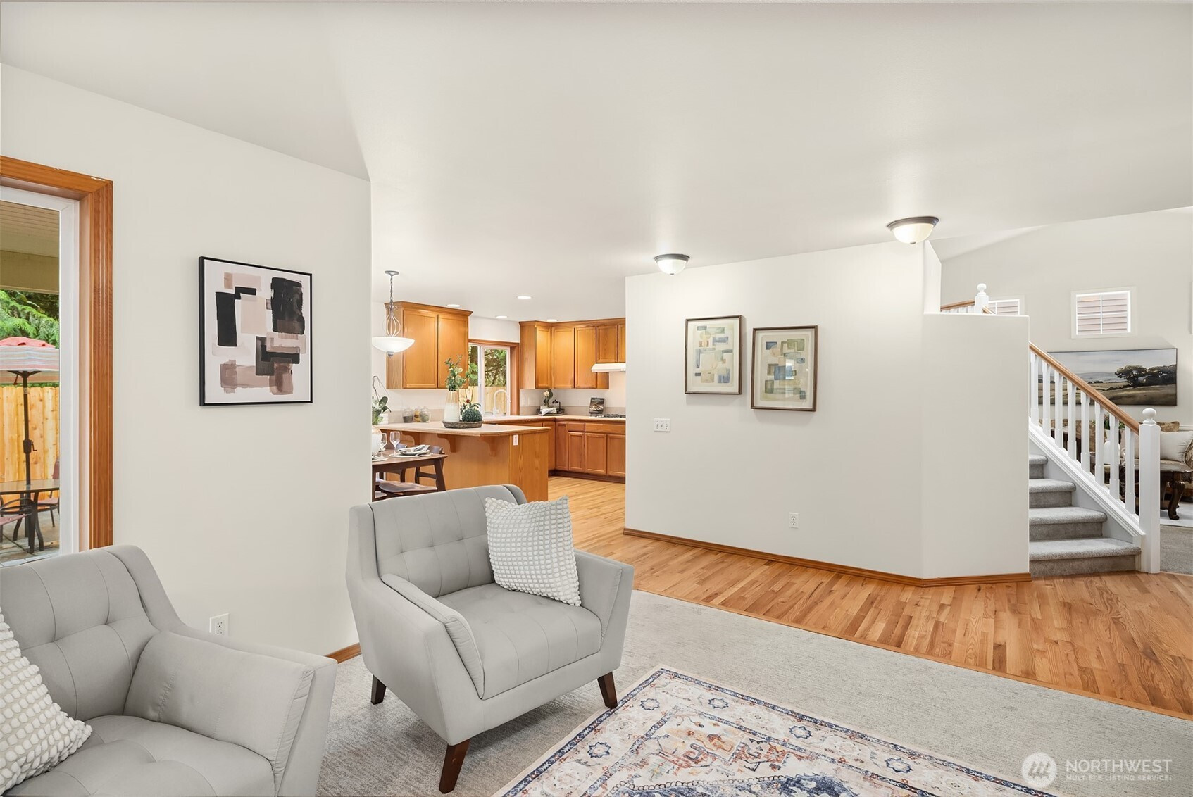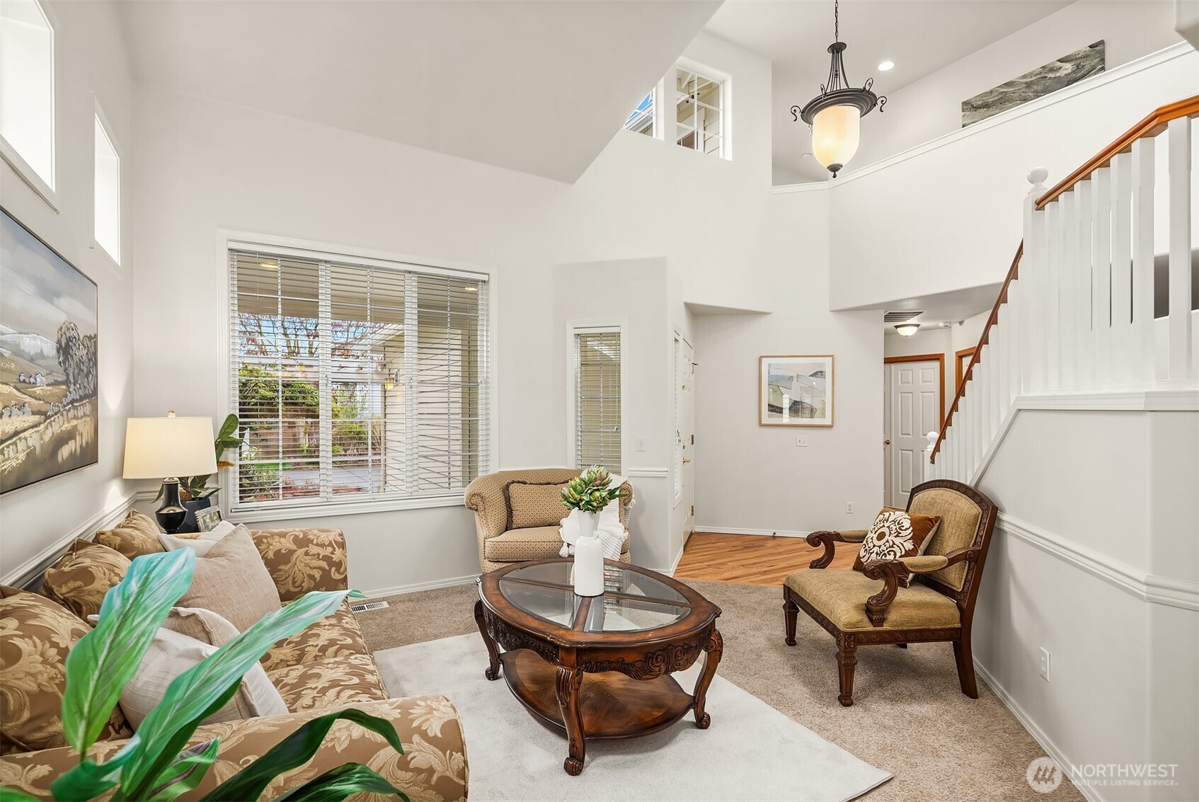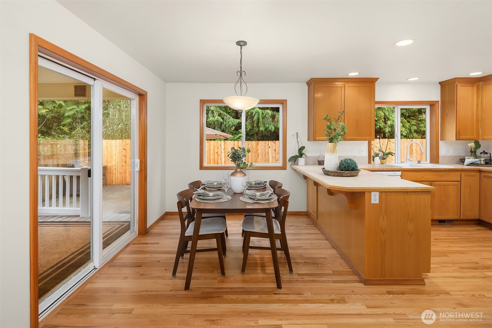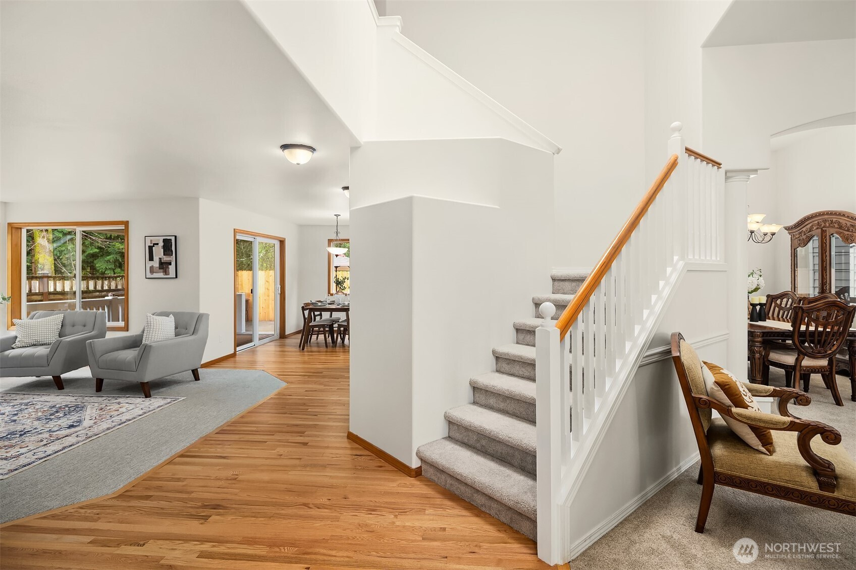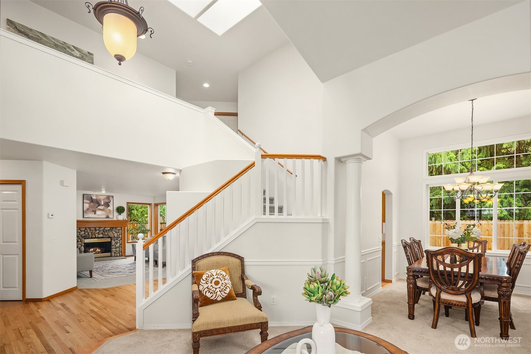Northwest classic in sought-after Foxwood Meadows offering timeless charm and a comfortable, functional layout. The main level features a bright living room with vaulted ceilings, a formal dining room with column accents, private den, powder room, and a warm, inviting family room with stone fireplace. The kitchen includes a brand-new oven and microwave, hardwood floors, and a sunny breakfast nook with French doors opening to a covered deck. Enjoy a spacious patio perfect for entertaining and summer BBQs. Upstairs boasts a generous primary suite with serene greenbelt views and a five piece bath with soaking tub, separate shower, and double vanity. Three additional bedrooms, full bath, and laundry room complete the level. Spacious three-car garage. Enjoy proximity to the community park, shopping, highways, and Everett schools.