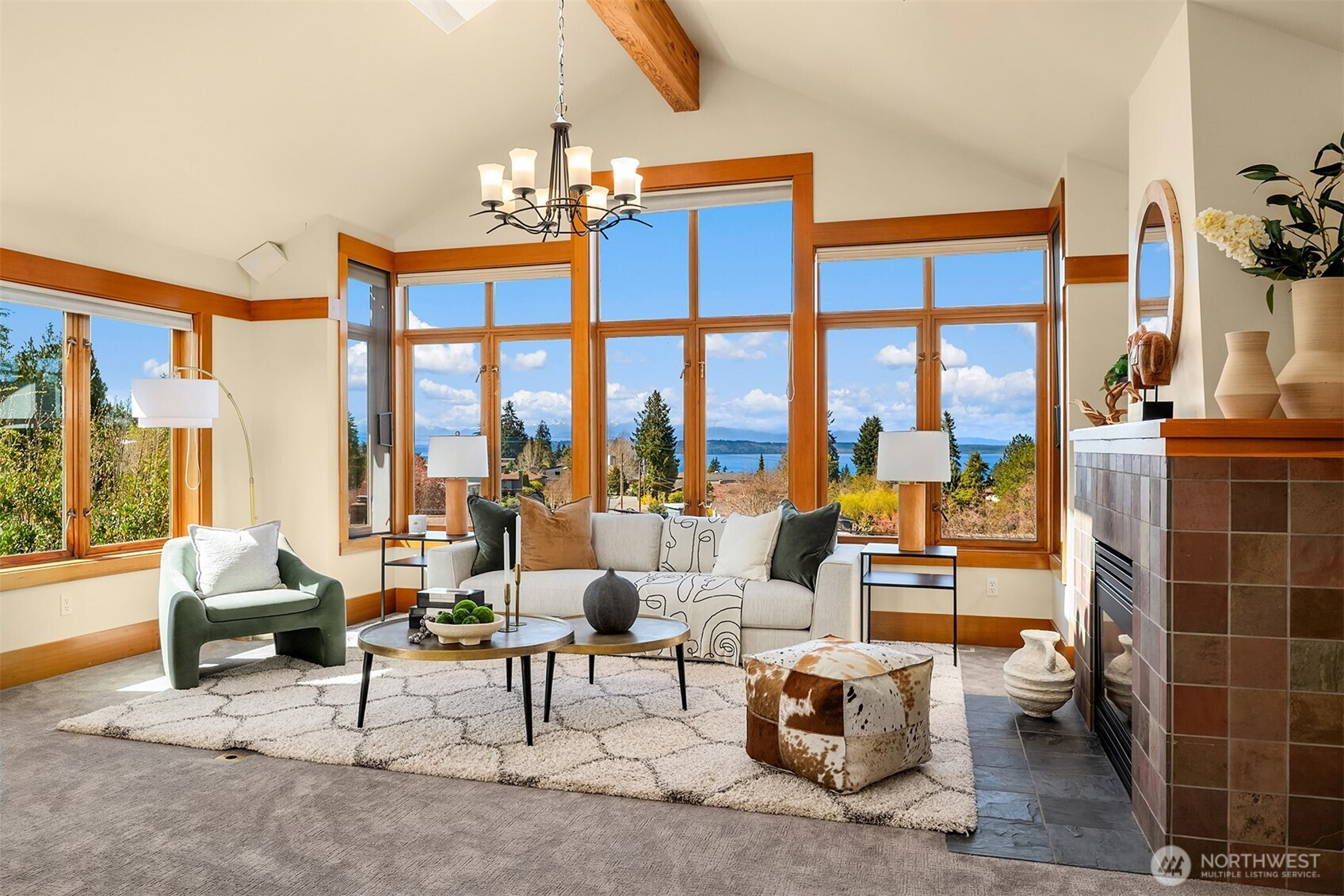 Introducing 1105 Daley Place, a stately Northwest contemporary home in the coveted Edmonds Bowl with sweeping, unobstructed views of Puget Sound and the Olympic Mountains. Framed by soaring 13-foot ceilings and refined architectural detailing, the home is designed for both presence and livability, with a seamless flow from the great room and kitchen to a main-floor primary suite and expansive view deck, as well as a rooftop deck offering panoramic vistas. Oak hardwood floors, abundant VG Fir finishes, and craftsman-inspired stair detailing introduce warmth and texture, balancing the home’s strong architectural lines. The lower level expands the living experience with a generous family room, flexible bedrooms or office spaces, and a 704-square-foot attached one-bedroom ADU with private access—well suited for guests, extended living, or income potential. Built in 1999, the home includes a 2-car garage and approximately $185,000 in thoughtful upgrades completed within the past two years. Below, the property reveals a rare and tranquil landscape: a private creek and a curated, Zen-inspired native garden designed for year-round beauty and ecological harmony. Layers of texture, seasonal color, and the gentle sound of flowing water create a setting that feels removed from the everyday. This is more than a view home. It is a sanctuary above the Bowl—architecturally distinctive, deeply connected to nature, and truly a work of art.