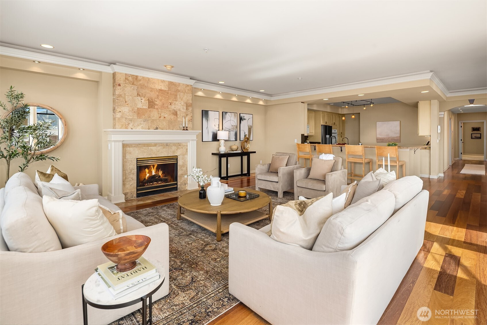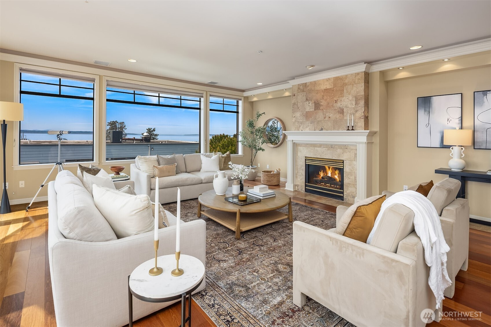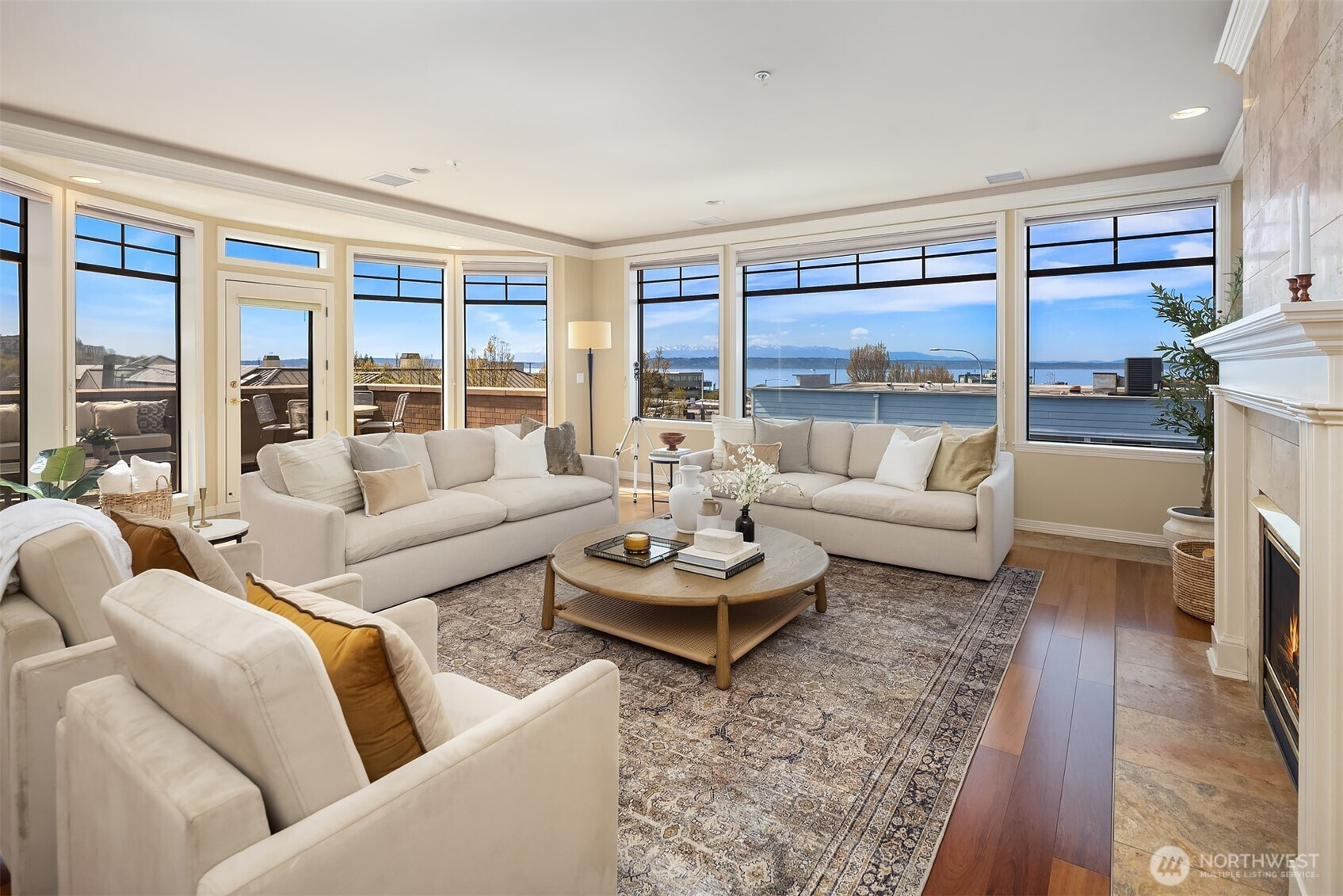 Experience luxury living in this top-floor penthouse condominium boasting endless Sound and mountain views. The heart of Edmonds is right outside your door, never more than a handful of steps to everywhere you want to be. Rarely available, this boutique, view residence offers an open-floor plan, seamless flow into the living room and formal dining areas. Retreat to the luxurious primary suite with a fireplace and five-piece bath. A second ensuite bedroom ensures comfort for guests while a versatile office offers potential for a third bedroom. Curated finishes, clean lines and refined details elevate every space. Designed for effortless, one-level living that lives like a single-family home. Two secure garage parking spaces, an extra-large storage room (20' x 20') and a convenient lock-and-leave lifestyle. From its incredible views to its premier downtown location, this penthouse is a rare opportunity to own one of Edmonds' most exceptional homes. Downtown Edmonds living at its best!