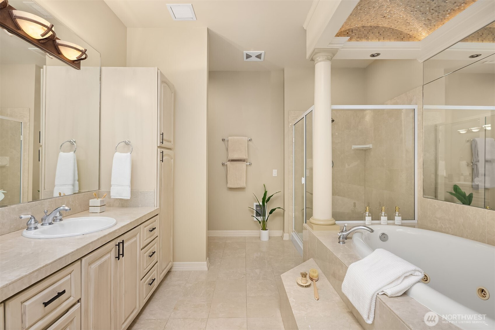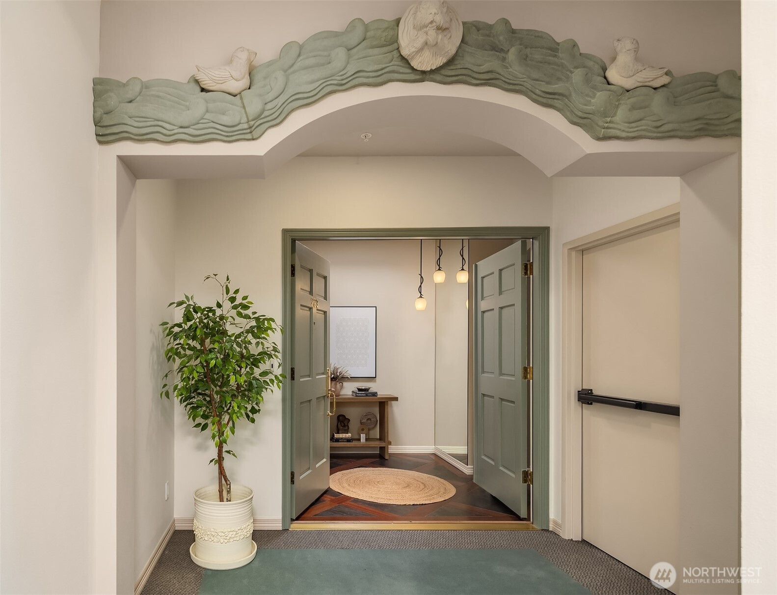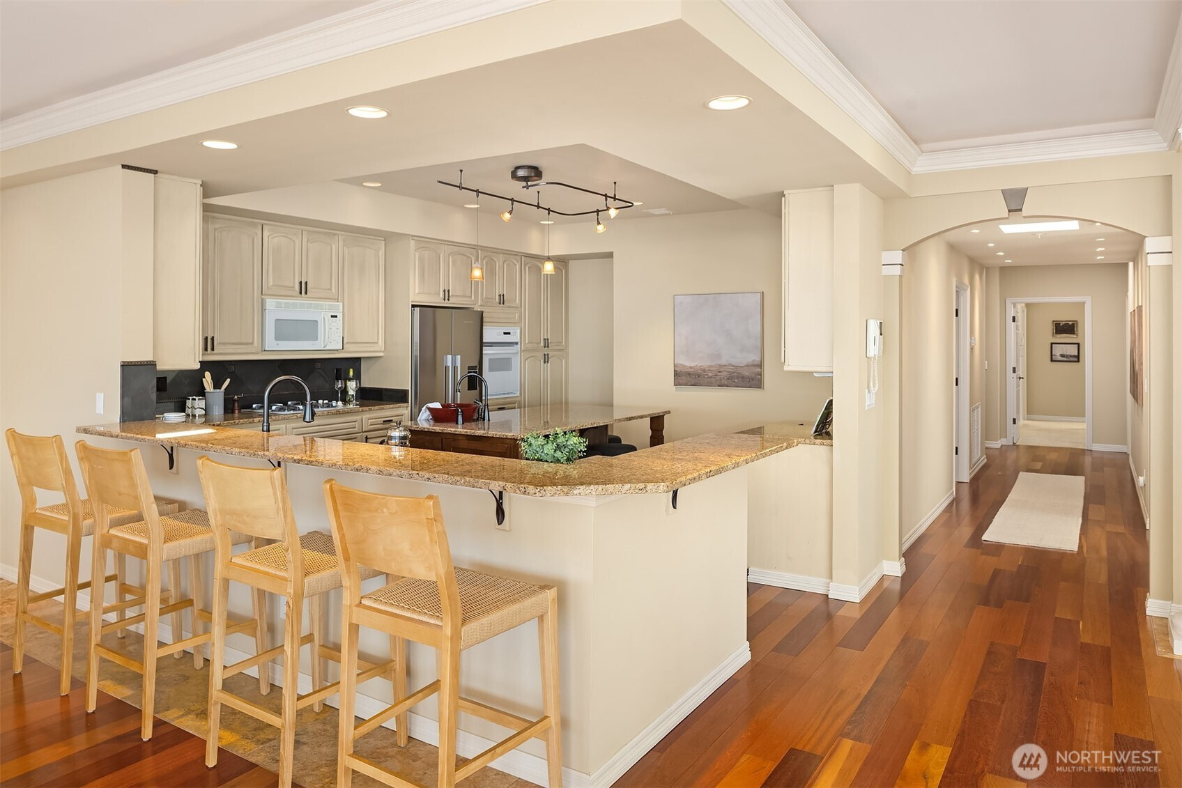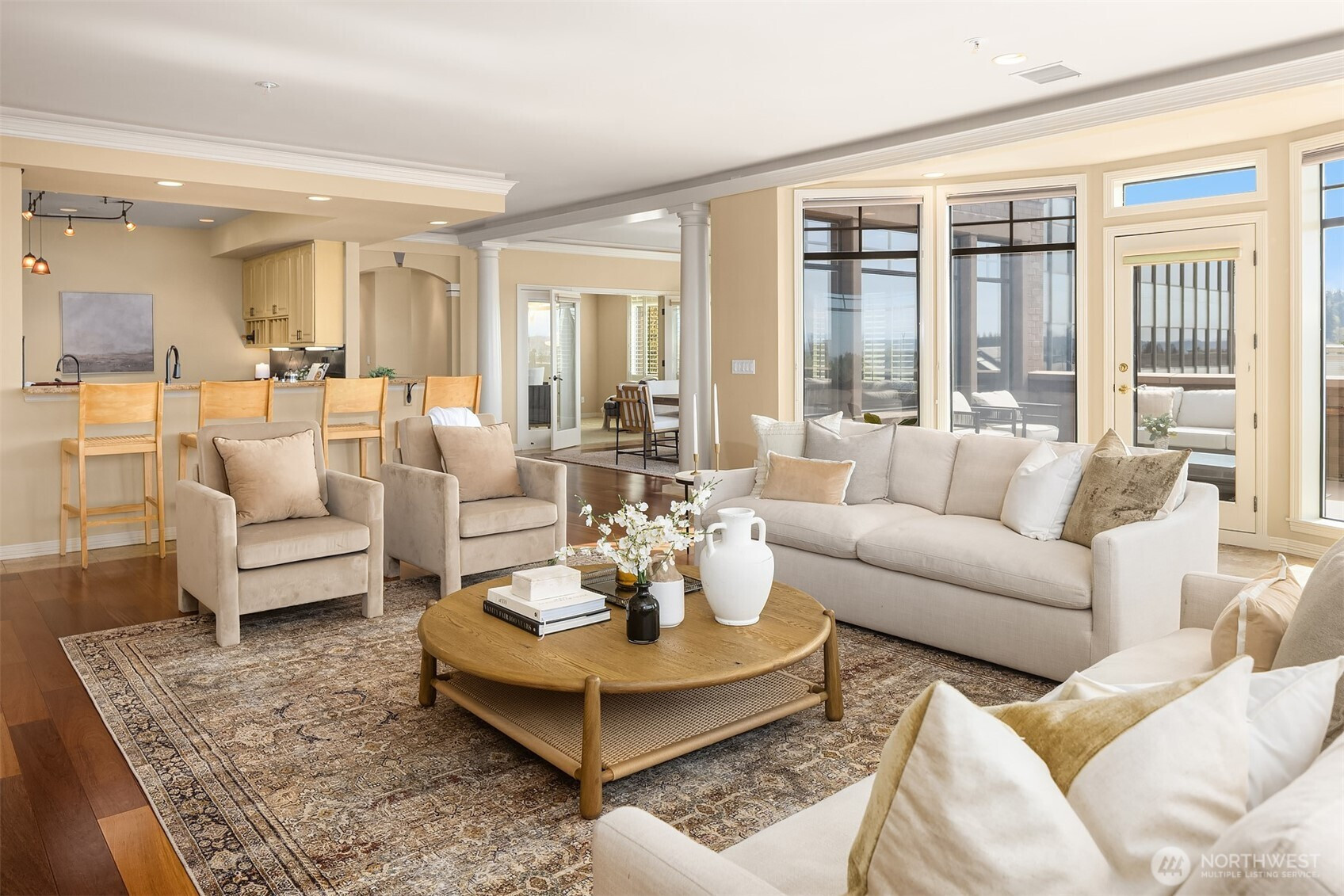 Experience luxury living in this top-floor penthouse condominium boasting endless Sound and mountain views. The heart of Edmonds is right outside your door, never more than a handful of steps to everywhere you want to be. Rarely available, this boutique, view residence offers an open-floor plan, seamless flow into the living room and formal dining areas. Retreat to the luxurious primary suite with a fireplace and five-piece bath. A second ensuite bedroom ensures comfort for guests while a versatile office offers potential for a third bedroom. Curated finishes, clean lines and refined details elevate every space. Designed for effortless, one-level living that lives like a single-family home. Two secure garage parking spaces, an extra-large storage room (20' x 20') and a convenient lock-and-leave lifestyle. From its incredible views to its premier downtown location, this penthouse is a rare opportunity to own one of Edmonds' most exceptional homes. Downtown Edmonds living at its best!