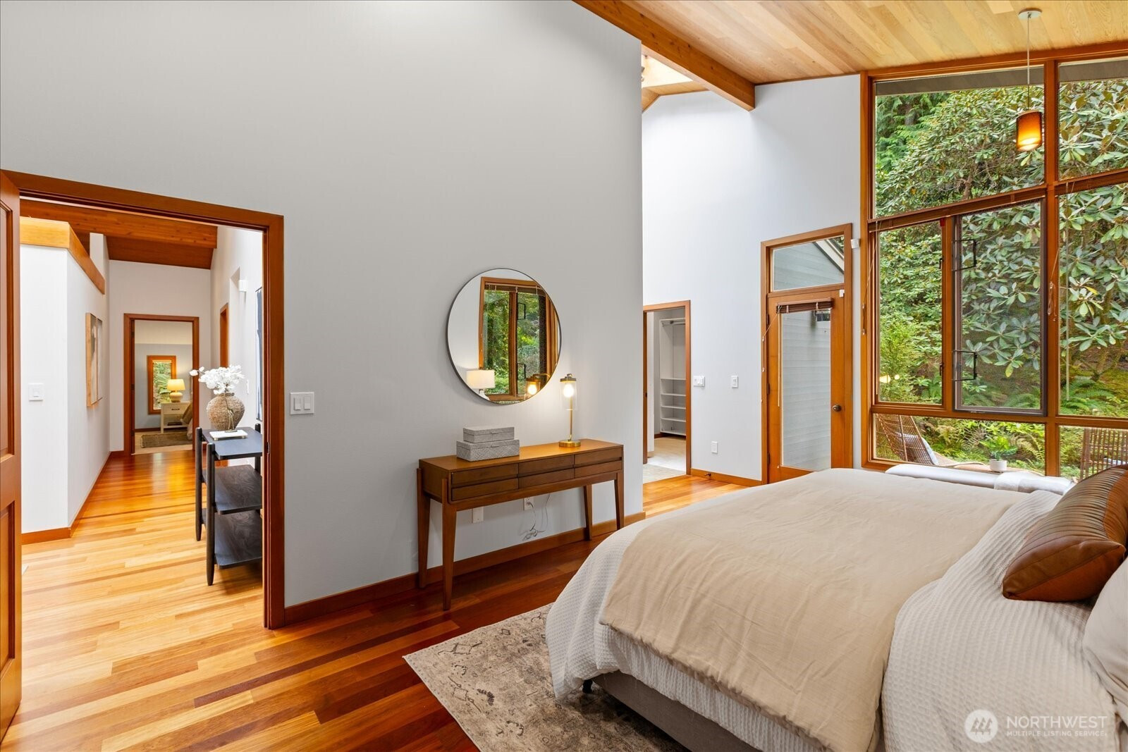 Gated NW contemporary on secluded 2 acres. Soaring cedar ceilings and 24 skylights offer a bright, open living space while oversized picture windows showcase the stunning grounds. All new composite decks include a large entertaining deck connecting living room, den and primary suite. Relaxed yet elegant living spaces include main floor primary suite with 5 piece bath plus first floor guest room and bath. 2006 2nd story addition features amazing game room with wet bar, another 2 beds and 3/4 bath. Huge heated garage with room for workouts, workshop and storage. Deer graze by the pond/waterfall and evening brings owl calls while spring dazzles with unique rhododendrons. Quiet private road connects to Deer Creek Reserve walking trails.