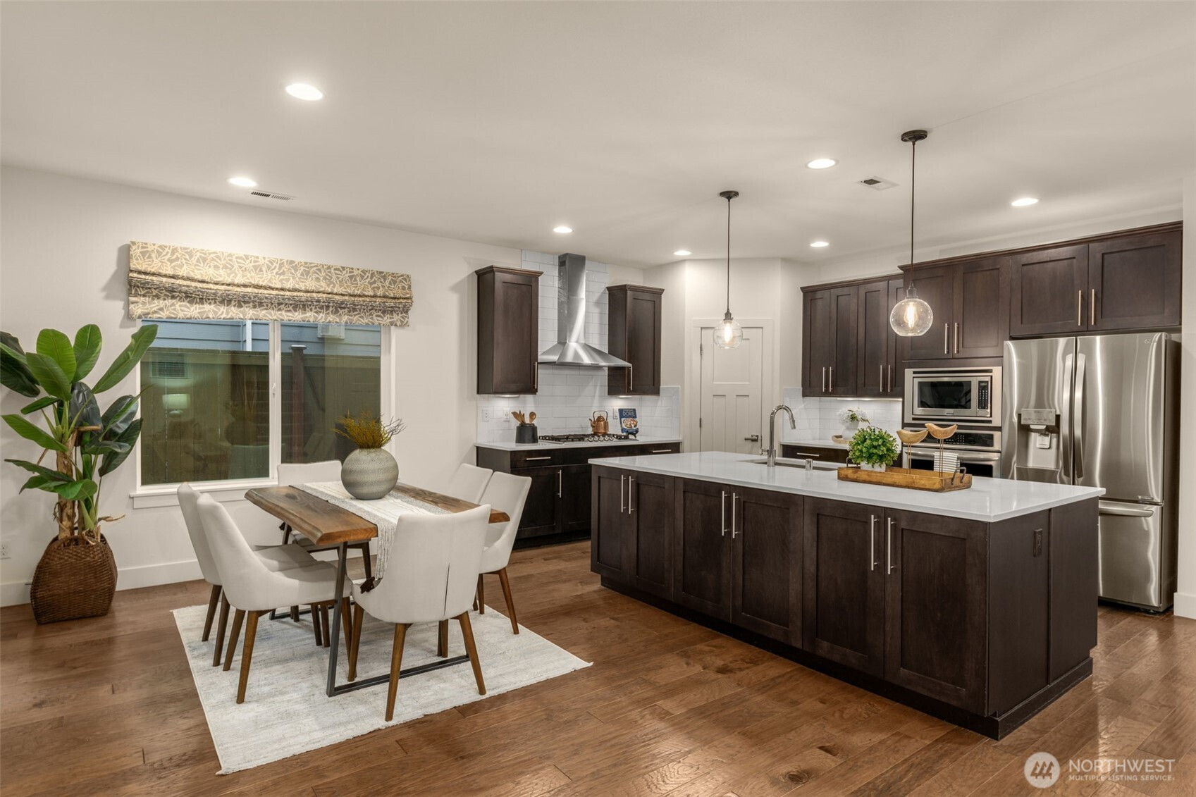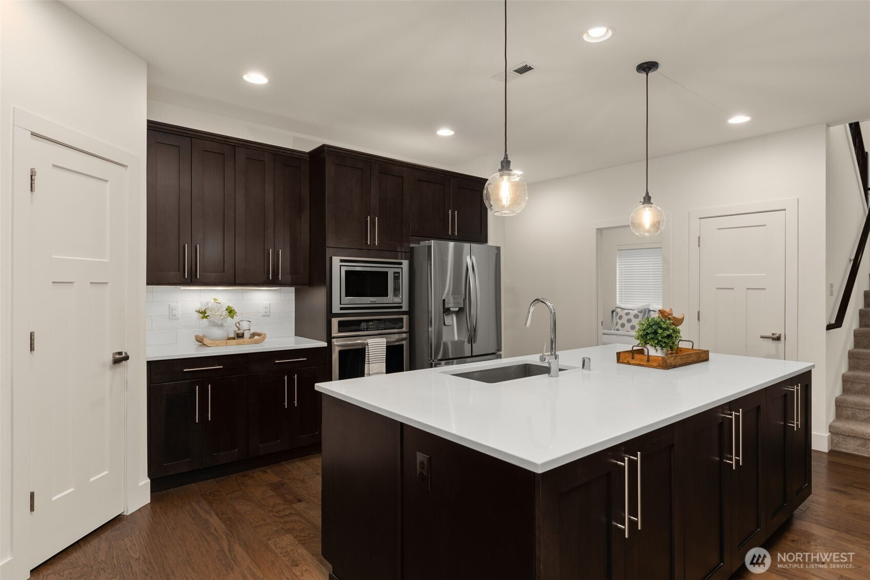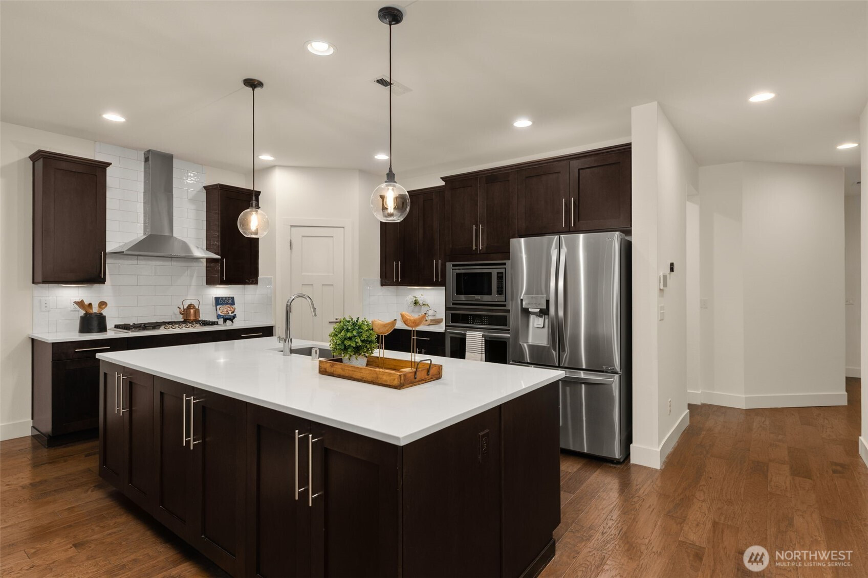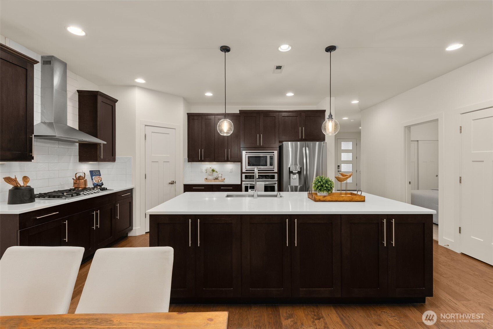 Welcome to the sought-after Aravalli community in Pacific Ridge’s Bothell neighborhood. This North-facing Kimball plan is one of the builder’s most popular layouts offering 5 bedrooms, including a main-level bedroom or den with a ¾ bath, perfect for guests or a private home office. Designed for both everyday living and effortless hosting, the bright, open layout flows beautifully. The kitchen features quartz slab countertops, a spacious walk-in pantry, and generous prep space for gatherings. Double-pane windows and A/C provide year-round comfort and energy efficiency. Upstairs, you’ll find a spacious loft plus a dedicated tech nook that opens to a balcony, along with generously sized secondary bedrooms. The primary suite offers a ton of privacy and features California Closet–style built-ins for exceptional organization. Upscale finishes include quartz countertops in all baths, iron balusters, and thoughtful modern touches throughout. Fresh interior paint gives the entire home a crisp, move-in-ready feel. Step outside to a covered patio and fully paved, fenced yard designed for easy maintenance and easy entertaining. Located in the award-winning Northshore School District, this home blends comfort, functionality, and convenience in an unbeatable location. Pre-inspected for added peace of mind.