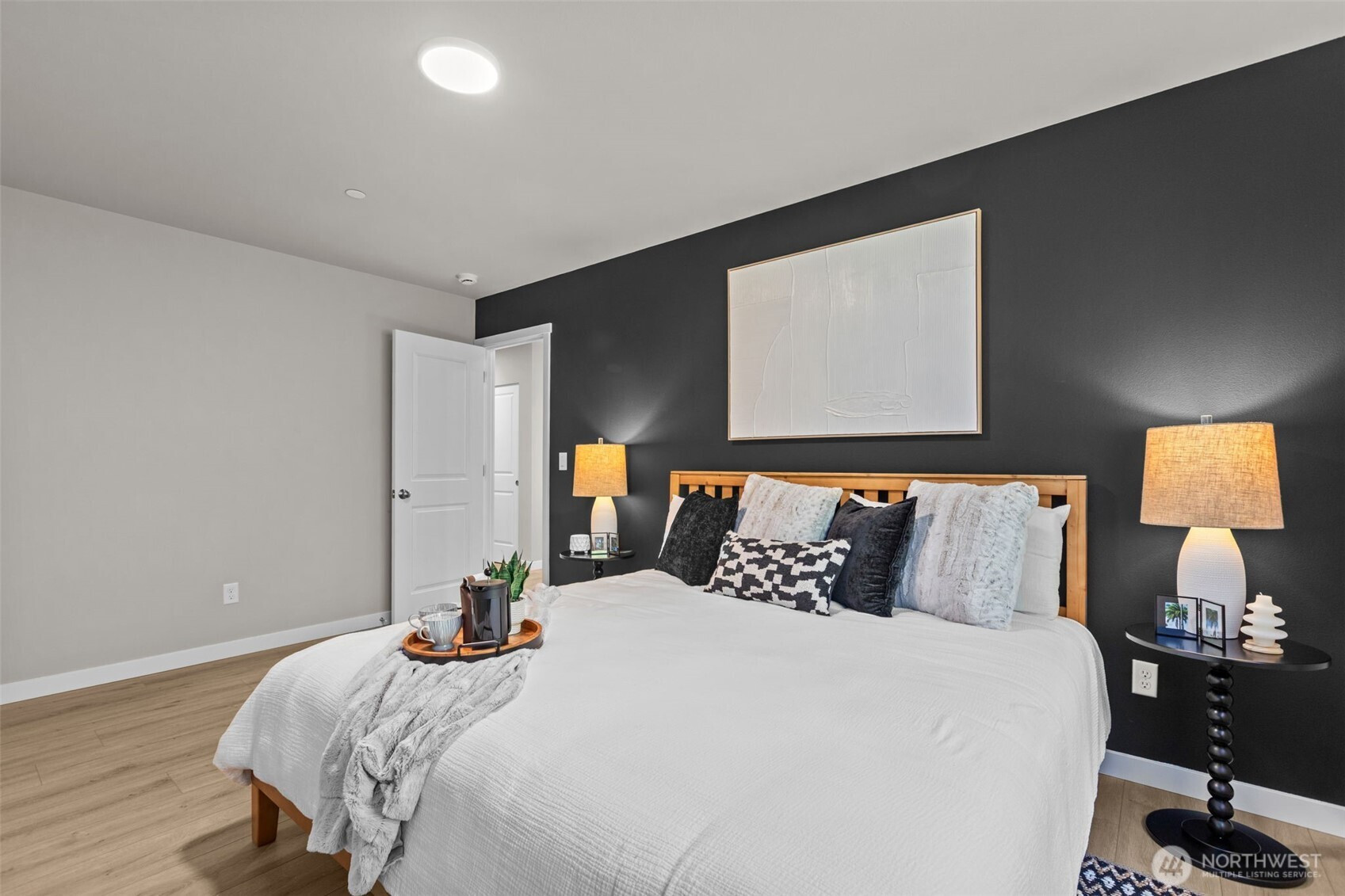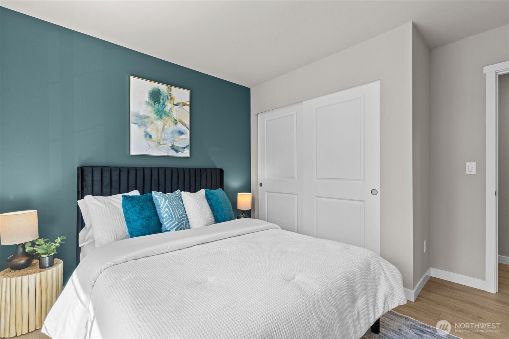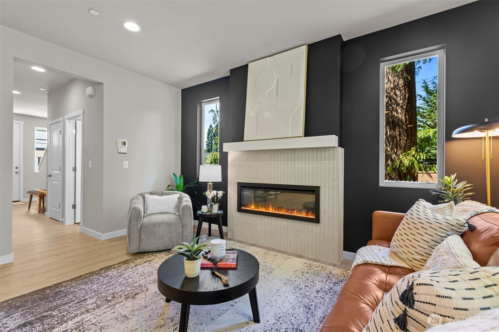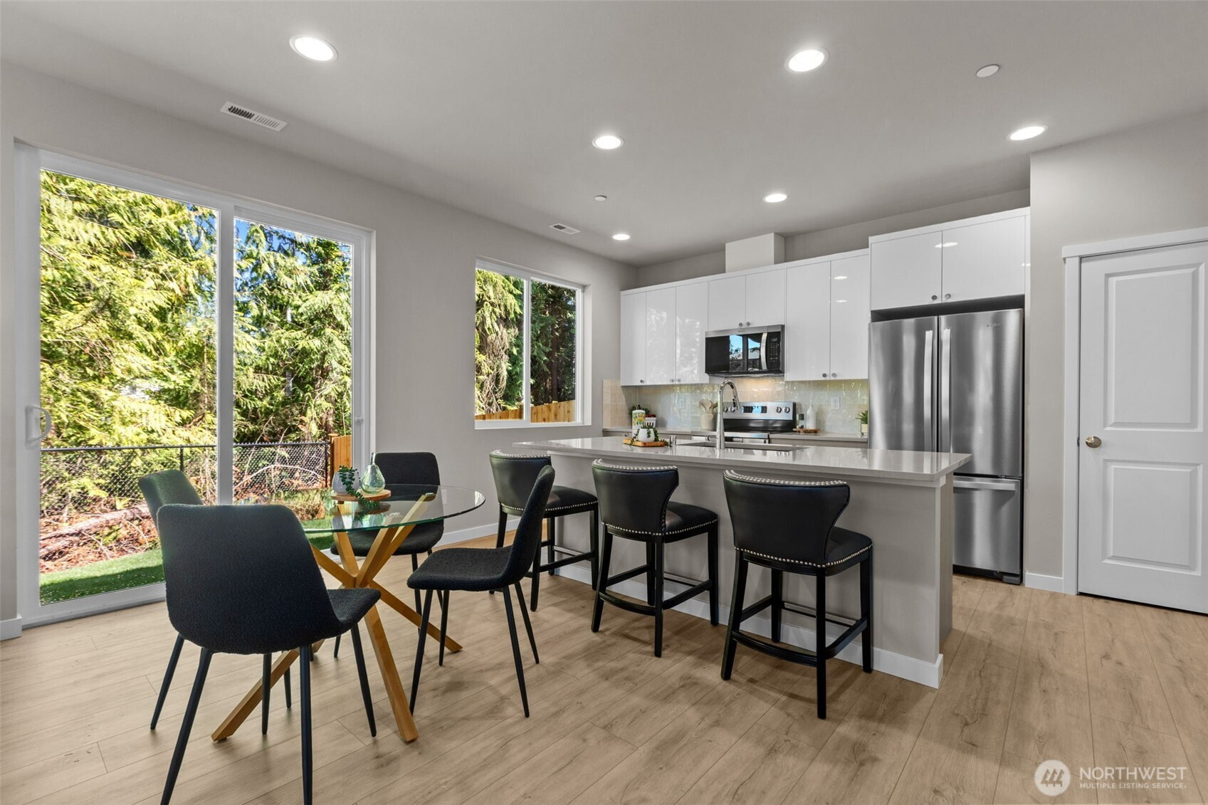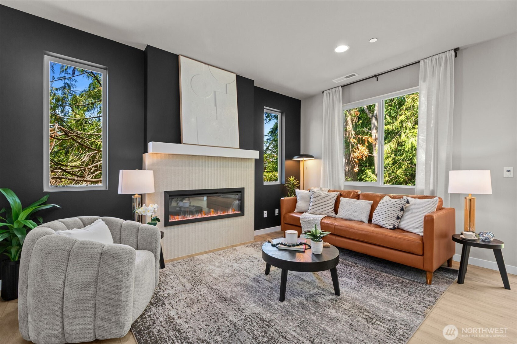 Sea Pac Homes is pleased to introduce Lauren Lane, a boutique community of just 8 townhomes. This featured model home is now on the market and includes premium upgrades such as hardwood flooring on both levels and all appliances. The residence offers four bedrooms and 2.5 baths within a layout wider than most three-level designs, maximizing both comfort and livability. The open-concept main floor features a stylish kitchen with quartz countertops and stainless steel appliances, flowing into bright dining and living areas anchored by a sleek 50" electric fireplace. Upstairs, the spacious primary suite includes a dual-sink bath and an oversized walk-in closet. Three additional bedrooms share a full bath, and the utility room provides convenient extra storage. Outside, enjoy a private retreat with a fully fenced backyard that borders mature trees for added privacy. Large 2-car side by side garage parking, with additional parking in driveway for 2 cars. Ideally located near Martha Lake, Mill Creek, and Lynnwood, this home blends modern design with everyday convenience. Additionally, homeowner dues are less than $100 per month.