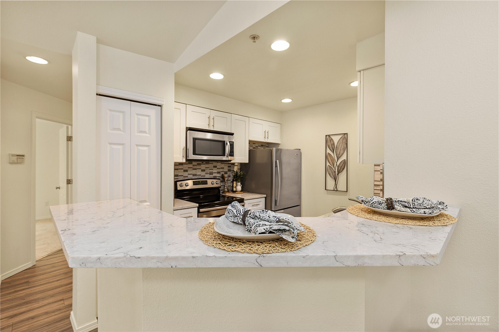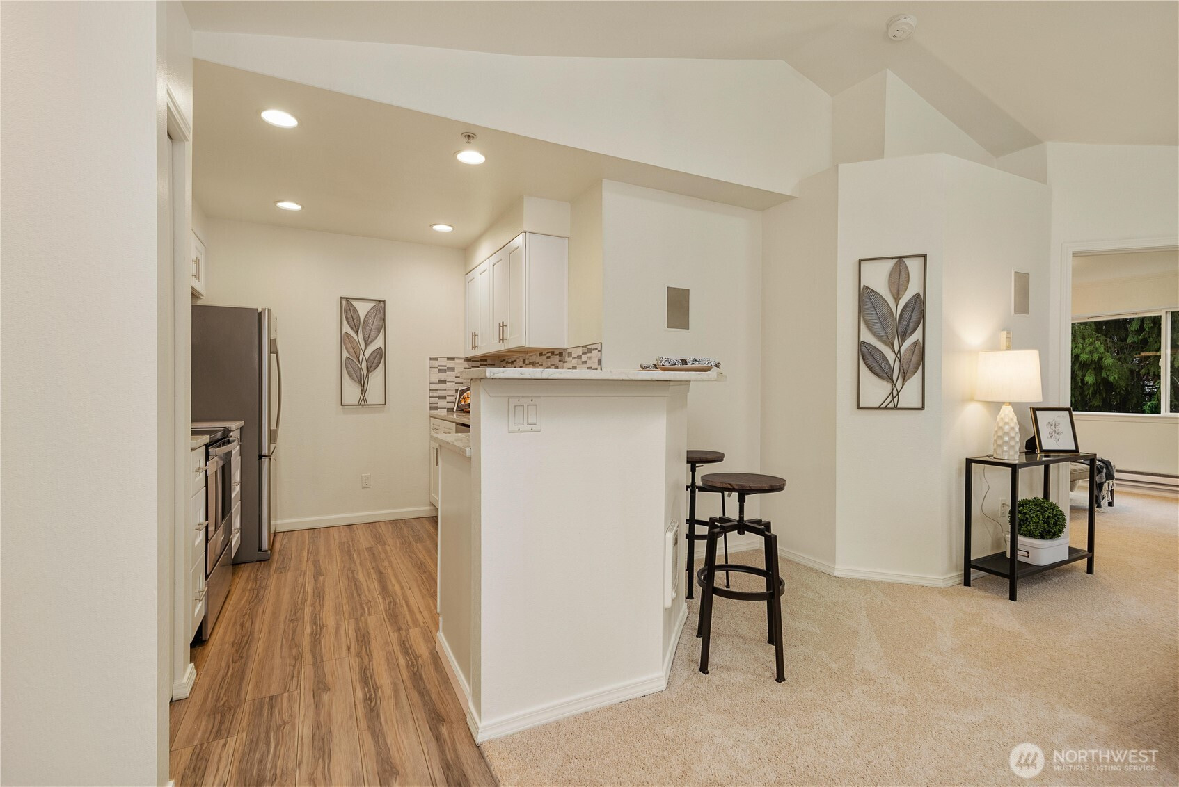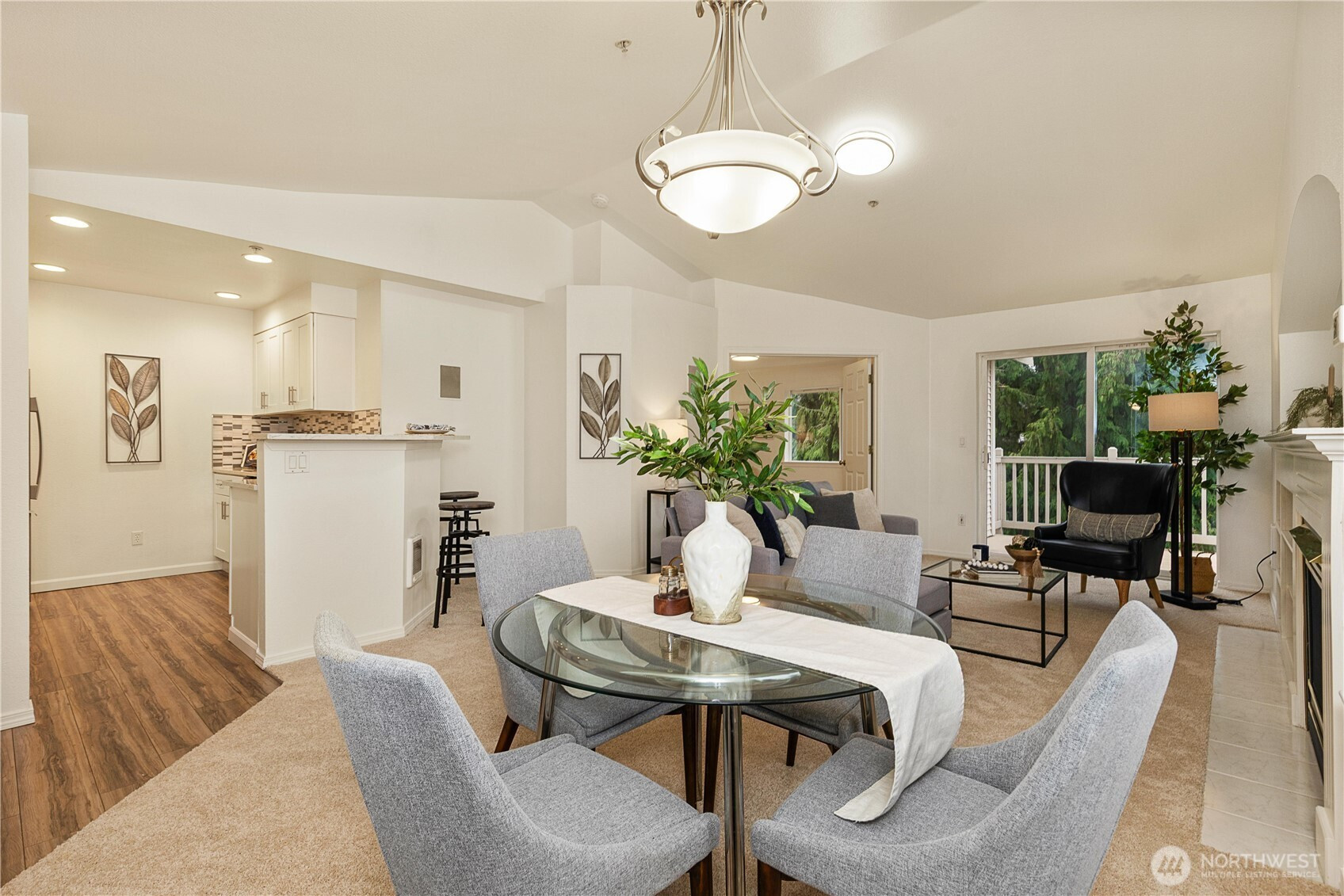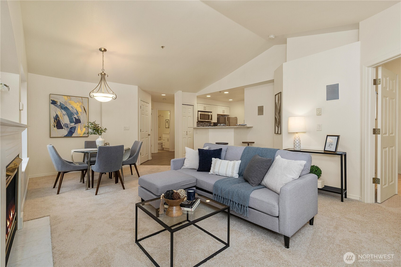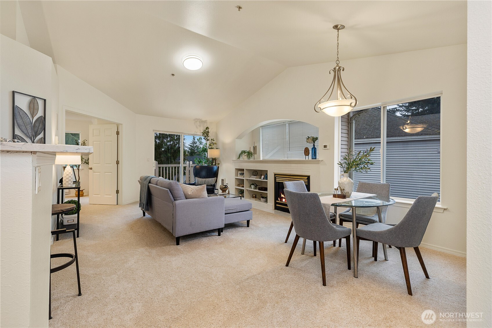 Beautifully updated top-floor end unit with a private garage and two true primary bedrooms. Enjoy no neighbors above and abundant south-facing windows that flood the home with natural light. Vaulted ceilings and extra windows create a bright, open, and airy feel throughout. The home is exceptionally clean and move-in ready with new carpet, fresh interior paint, LVP flooring, modern LED lighting, and built-in surround sound speakers perfect for relaxing or entertaining. The updated gourmet kitchen features quartz countertops and newer stainless steel appliances. Primary bedroom one includes a walk-in closet and full bath, while primary bedroom two opens through French doors and offers a walk-in closet and step-in shower. Unwind after a long day or BBQ on your private deck overlooking a peaceful pond, complete with the soothing sights and sounds of swimming ducks. Park in your oversized garage with extra storage. Excellent location with easy access to Boeing, I 5, Highway 99, and 405. Close to Trader Joe’s, Dick’s Drive In, Costco, and Everett Mall. Pet friendly HOA.