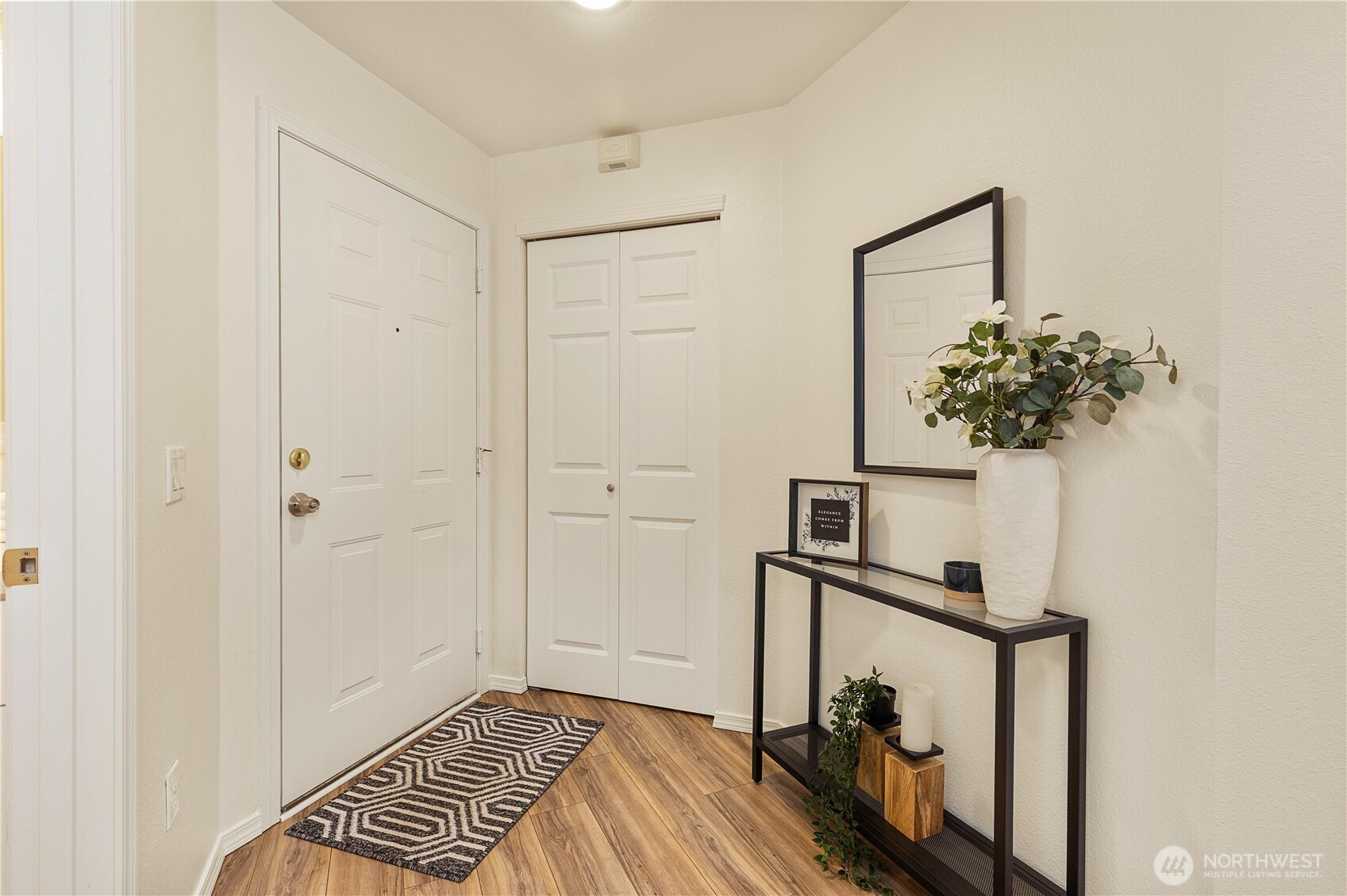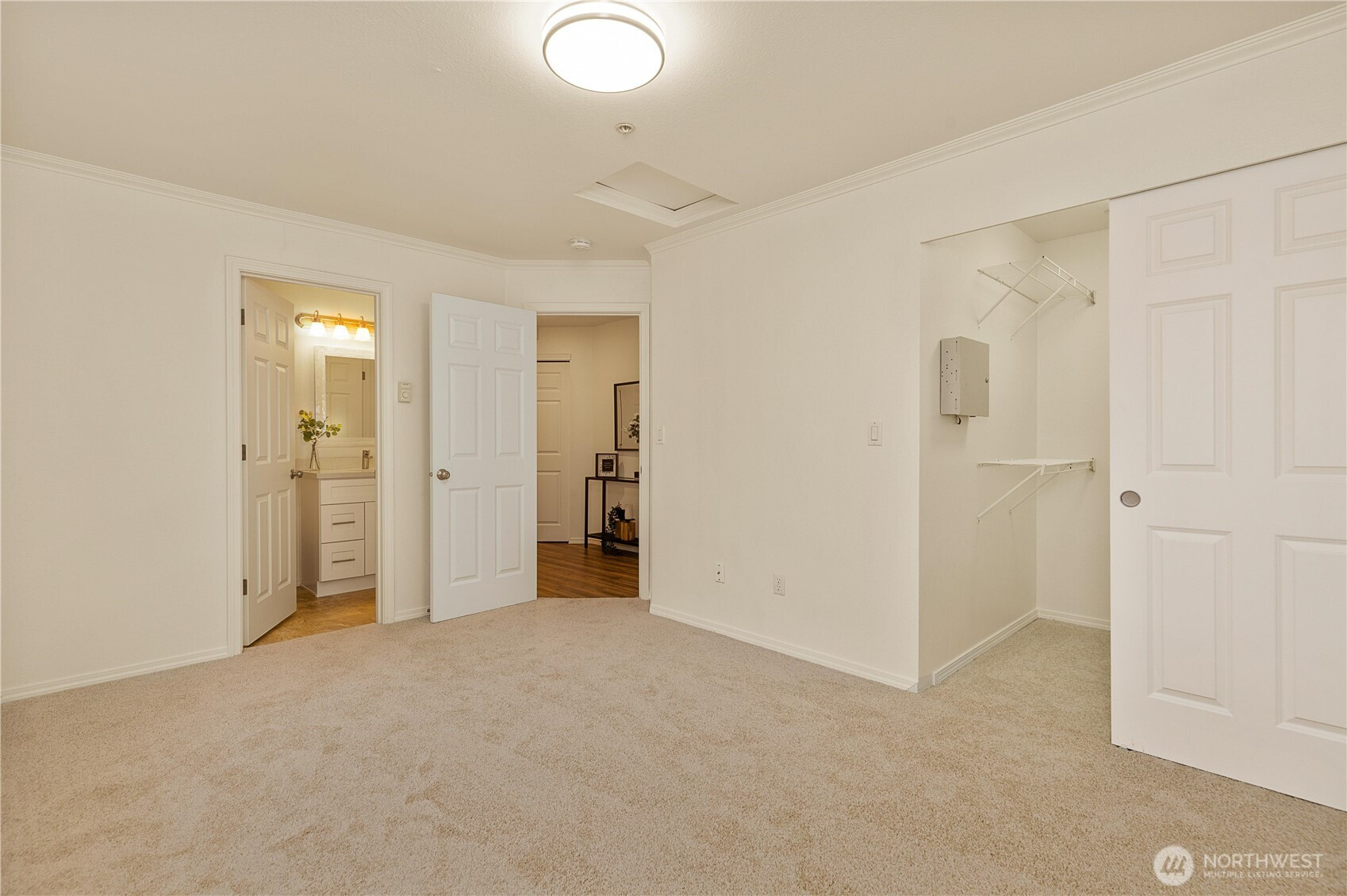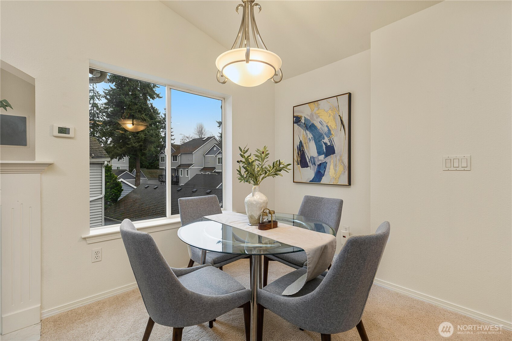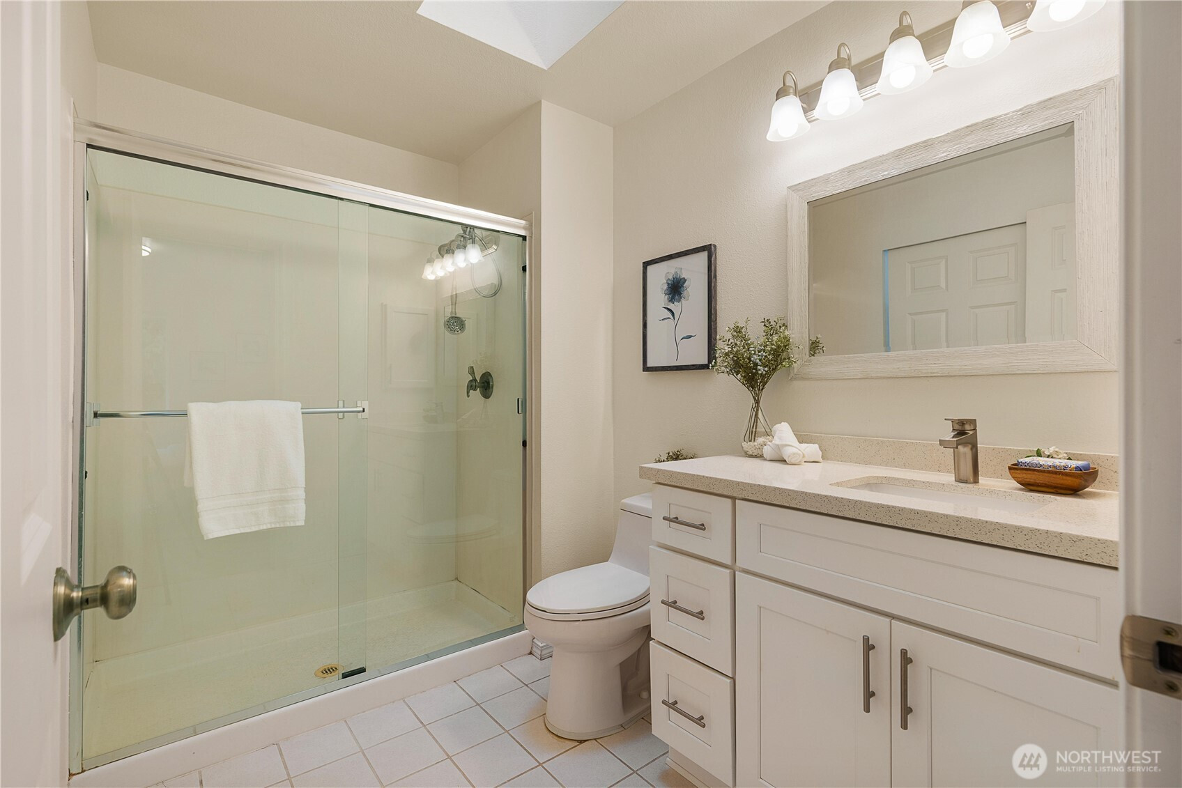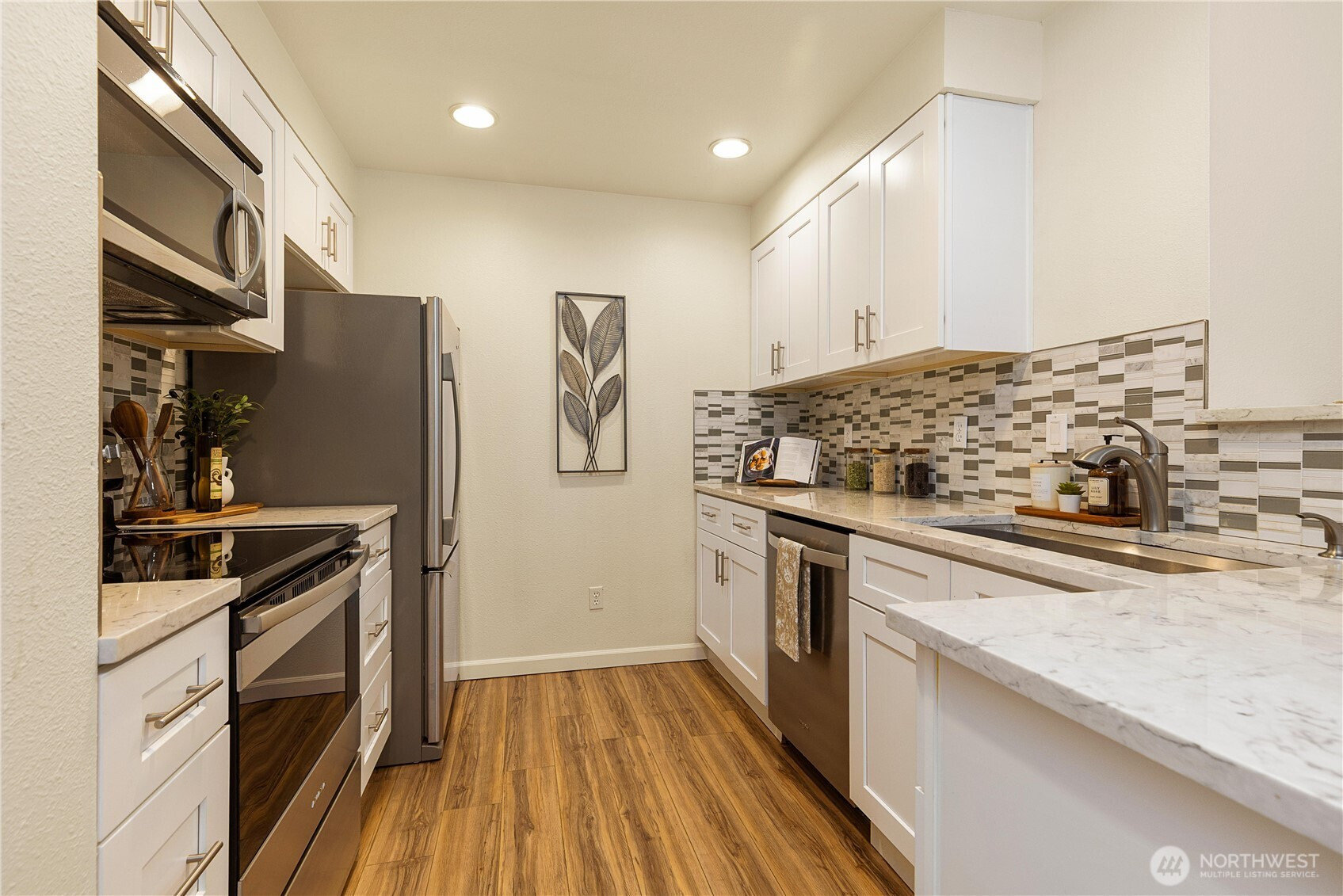 Beautifully updated top-floor end unit with a private garage and two true primary bedrooms. Enjoy no neighbors above and abundant south-facing windows that flood the home with natural light. Vaulted ceilings and extra windows create a bright, open, and airy feel throughout. The home is exceptionally clean and move-in ready with new carpet, fresh interior paint, LVP flooring, modern LED lighting, and built-in surround sound speakers perfect for relaxing or entertaining. The updated gourmet kitchen features quartz countertops and newer stainless steel appliances. Primary bedroom one includes a walk-in closet and full bath, while primary bedroom two opens through French doors and offers a walk-in closet and step-in shower. Unwind after a long day or BBQ on your private deck overlooking a peaceful pond, complete with the soothing sights and sounds of swimming ducks. Park in your oversized garage with extra storage. Excellent location with easy access to Boeing, I 5, Highway 99, and 405. Close to Trader Joe’s, Dick’s Drive In, Costco, and Everett Mall. Pet friendly HOA.