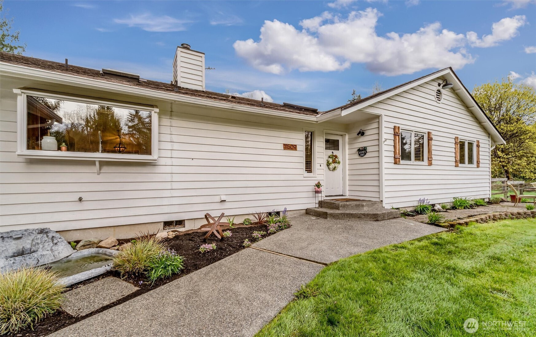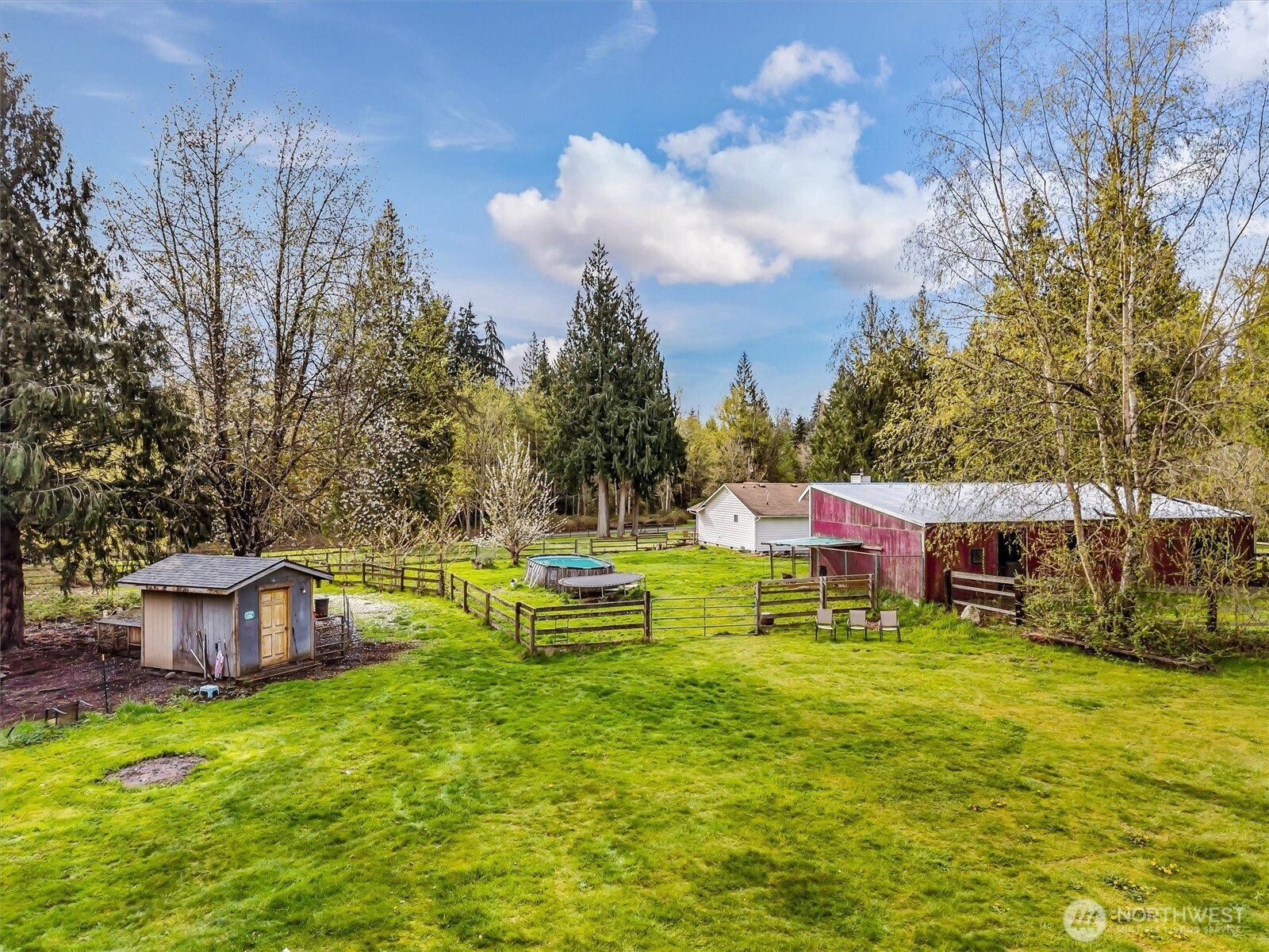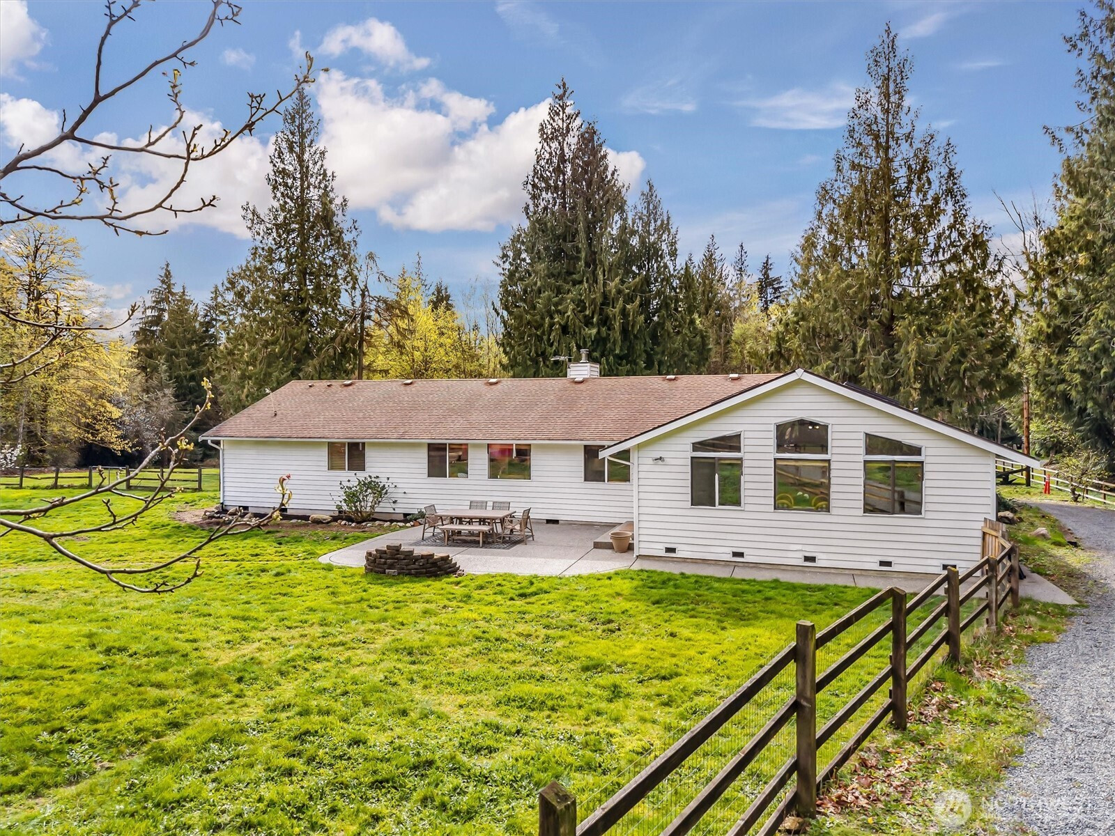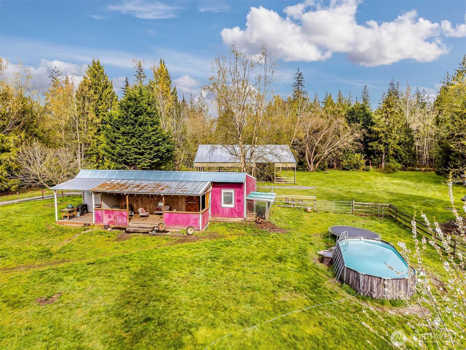 The Country Escape You've Been Dreaming Of! Five-acre properties in this sought-after community don't come along often, & this beautifully updated 2800 sq. ft. rambler delivers the space, features, & flexibility you've been looking for set against a stunning country backdrop. The kitchen impresses with granite countertops, custom cabinetry, an induction cooktop, farmhouse sink, & a generous walk-in pantry. A wood burning stove anchors the light-filled living room, while rich engineered hardwood flows throughout for a warm, polished feel. The converted garage expands the living space with a family room, den, ideal for working from home, an additional ¾ bath, & laundry room. The expansive Great Room is the true heart of the home. Soaring space perfect for gatherings large & small, with French doors that seamlessly connect indoor living to your stunning outdoor acreage. This hobby farm has it all! Cool off in the above-ground pool, collect eggs from your chicken coop, & breathe in the serenity only acreage living provides. The barn, complete with stalls & a garage door for covered parking, plus an approx. 60x60 covered arena handles equestrian & storage. A separate outbuilding offers even more room for a shop or additional storage. A serene seasonal pond completes this picture-perfect property. Home is prewired for a generator for peace of mind in every season. Minutes to Hwy 9, town, & the Centennial Trail. This is country living, elevated. Welcome to the Marysville Highlands!