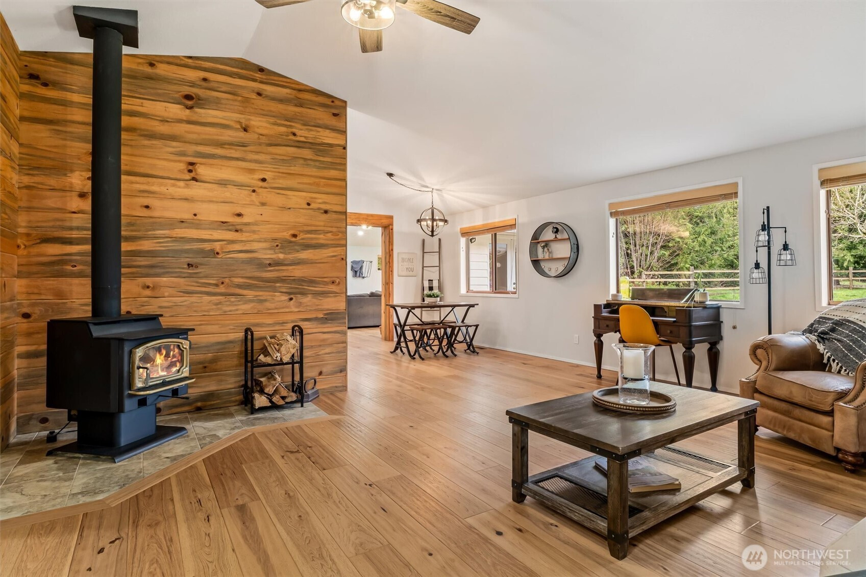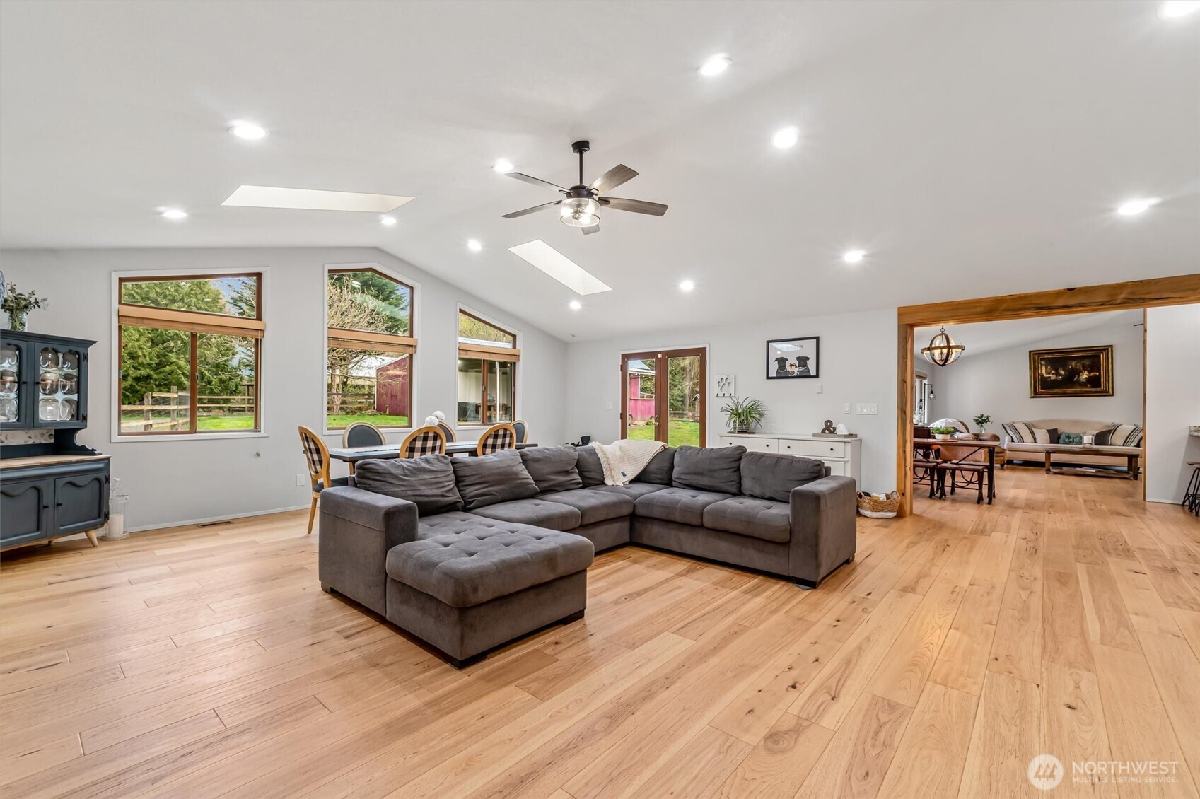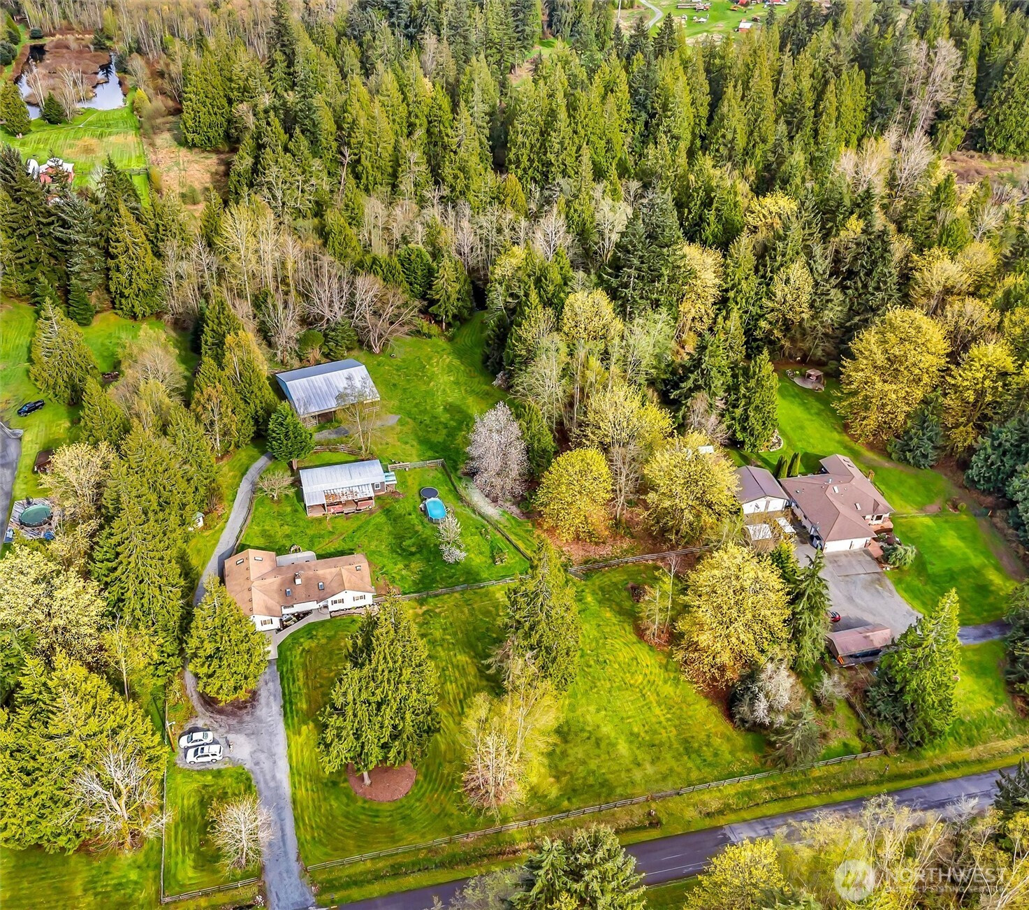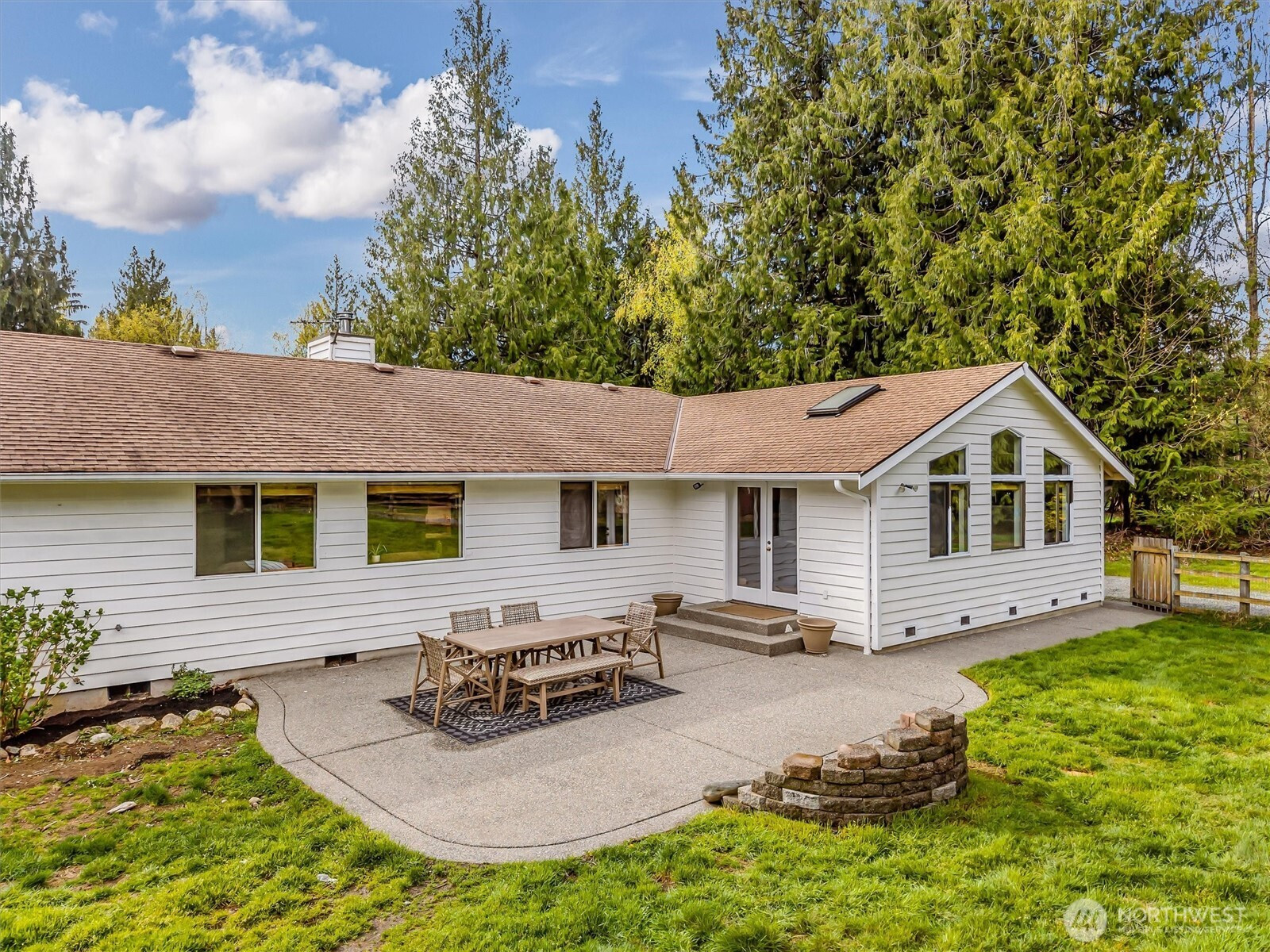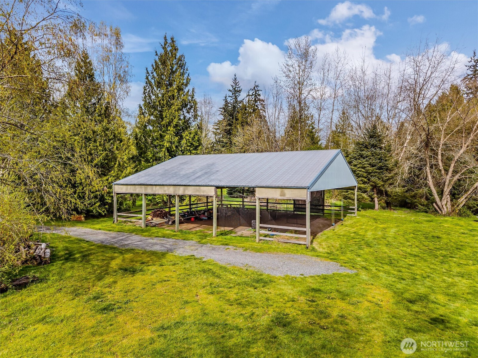 The Country Escape You've Been Dreaming Of! Five-acre properties in this sought-after community don't come along often, & this beautifully updated 2800 sq. ft. rambler delivers the space, features, & flexibility you've been looking for set against a stunning country backdrop. The kitchen impresses with granite countertops, custom cabinetry, an induction cooktop, farmhouse sink, & a generous walk-in pantry. A wood burning stove anchors the light-filled living room, while rich engineered hardwood flows throughout for a warm, polished feel. The converted garage expands the living space with a family room, den, ideal for working from home, an additional ¾ bath, & laundry room. The expansive Great Room is the true heart of the home. Soaring space perfect for gatherings large & small, with French doors that seamlessly connect indoor living to your stunning outdoor acreage. This hobby farm has it all! Cool off in the above-ground pool, collect eggs from your chicken coop, & breathe in the serenity only acreage living provides. The barn, complete with stalls & a garage door for covered parking, plus an approx. 60x60 covered arena handles equestrian & storage. A separate outbuilding offers even more room for a shop or additional storage. A serene seasonal pond completes this picture-perfect property. Home is prewired for a generator for peace of mind in every season. Minutes to Hwy 9, town, & the Centennial Trail. This is country living, elevated. Welcome to the Marysville Highlands!